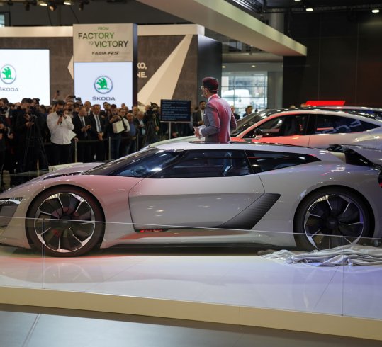 Ostatnia z premier to studyjny Audi PB18 e-tron. Pojazd elektryczny skonstruowany wg założeń klasycznej architektury samochodów supersportowych z silnikiem umieszczonym centralnie i wysuniętą do przodu kabiną kierowcy. 4,53 m długości, 2 m szerokości i zaledwie 1,15 m wysokości. Rozstaw osi wynosi 2,70 m, a za napęd odpowiadają aż trzy silniki elektryczne: jeden z nich napędza przednią oś przekazując na nią do 150 kW mocy, natomiast dwa pozostałe napędzają każde z tylnych kół generując dodatkowe 350 kW na tylną oś. Maksymalna moc to 500 kW, a trybie tzw. boostingu kierowca może chwilowo uzyskać nawet 570 kW (ok. 775 KM). Do tego moment obrotowy wynoszący 830 Nm osiągalny (to elektryk) w pełnym zakresie pracy i nic dziwnego, że pierwszą setkę ten pojazd osiąga po 2 sekundach. Zanim przejdziemy do kolejnej marki – jeszcze krótka galeria Audi.