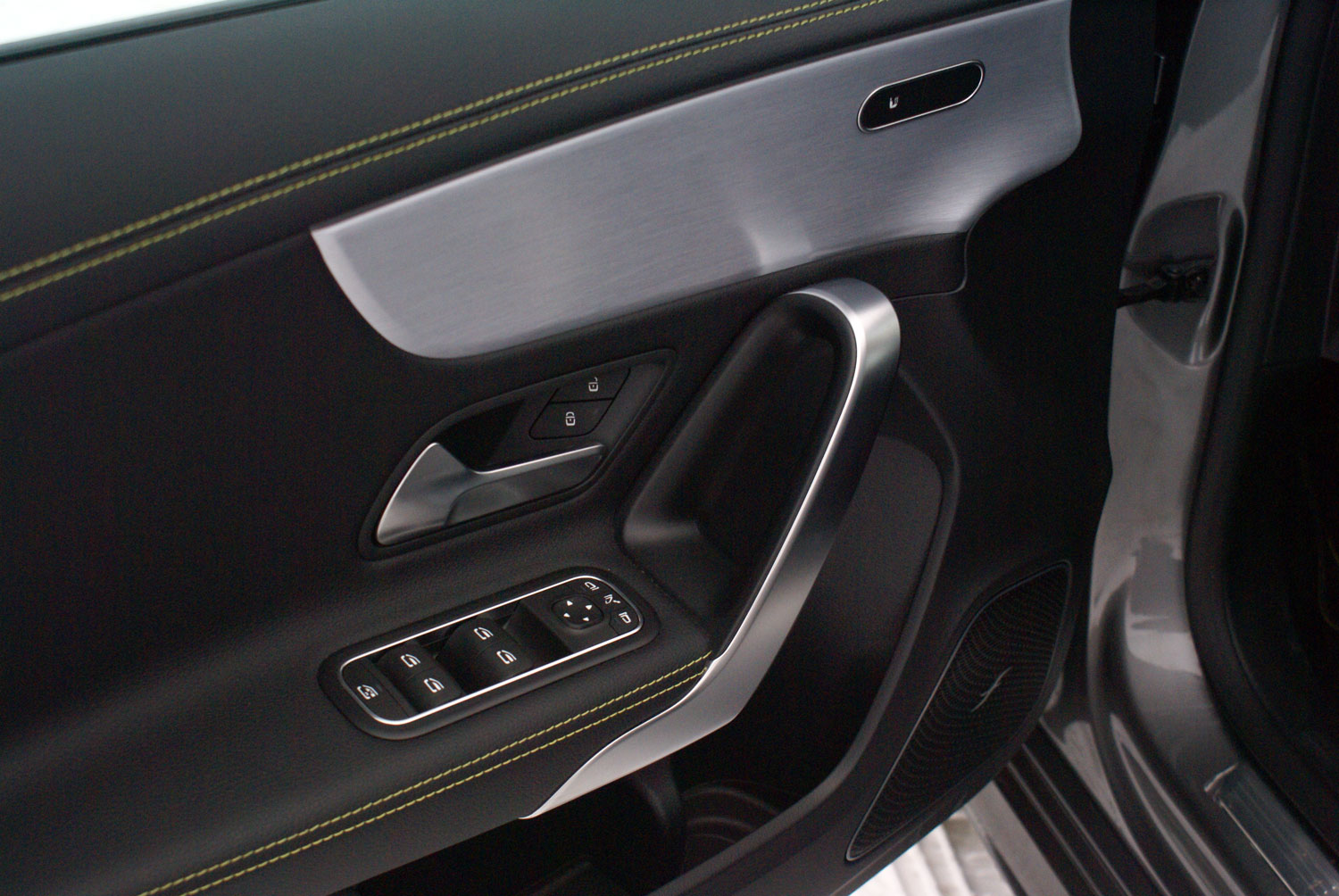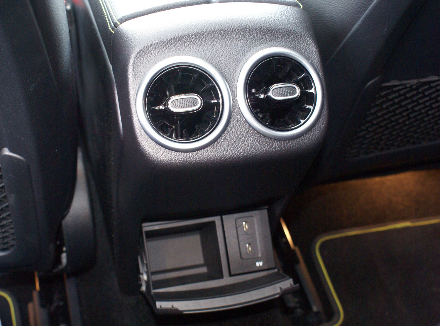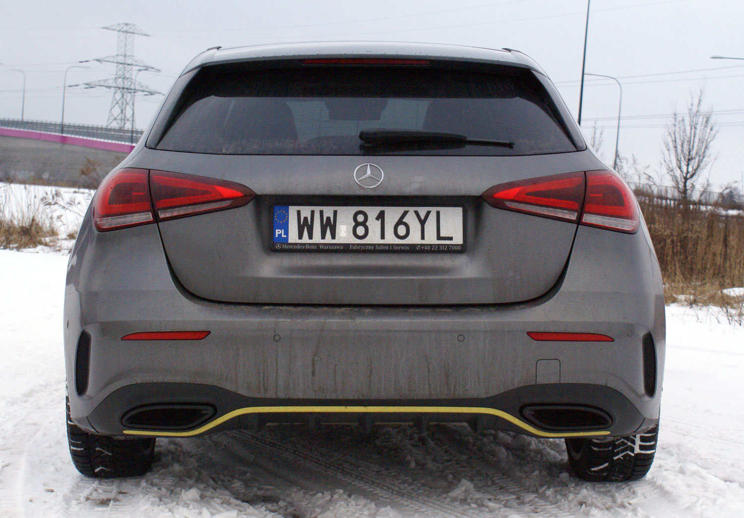 Z drugiej strony auto wygląda na bardziej usportowione niż jest w istocie (np. spory dyfuzor w dolnej części tylnego zderzaka i dwie, stanowiące atrapę, końcówki układu wydechowego). To zasługa opcjonalnego pakietu AMG Edition 1 w który testowy egzemplarz był wyposażony. Zestaw ten zawiera dodatkowo tylne zawieszenie wielowahaczowe, 19-calowe felgi, oświetlenie ambientowe wnętrza, czy sportowe fotele z charakterystycznymi przeszyciami. Sportowego sznytu dodawały też żółte linie widoczne zarówno na zewnątrz jak i w środku auta (m.in. na obręczach czarnych felg z lekkich stopów). Szary metaliczny lakier, określany przez producenta jako “szarość gór metalik” to również opcja, za 2354 zł.