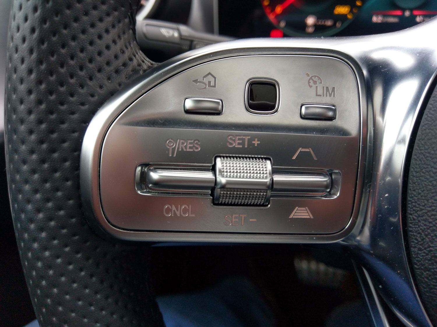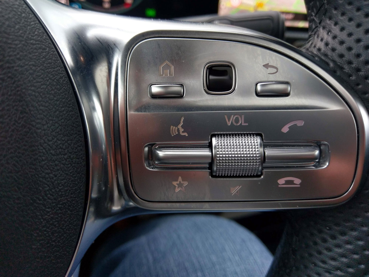 Oprócz wspomnianych dwóch ekranów ciekłokrystalicznych połączonych w jedną taflę, kierowca komunikuje się z autem za pomocą wielofunkcyjnej kierownicy. Na lewym jej ramieniu umieszczone zostały przyciski aktywujące limiter prędkości lub adaptacyjny tempomat. Można też ustawić zadaną prędkość oraz ustalić odległość jaka ma być zachowywana pomiędzy Mercedesem, a pojazdem poprzedzającym. Dystans jest oczywiście mierzony dynamicznie, w zależności od prędkości. Z kolei na prawym ramieniu kierownicy umieszczono przyciski sterujące m.in. funkcjami telefonu pokładowego (lub głośnomówiącego, w przypadku sparowania smartfonu z pojazdem), tutaj znajduje się też przycisk aktywujący interfejs głosowy, któremu poświęcę odrębny akapit za chwilę.
