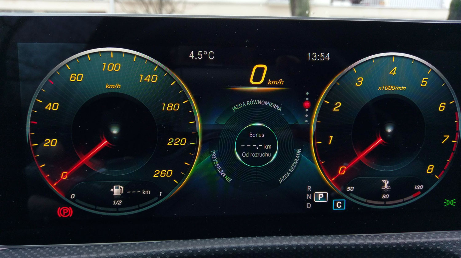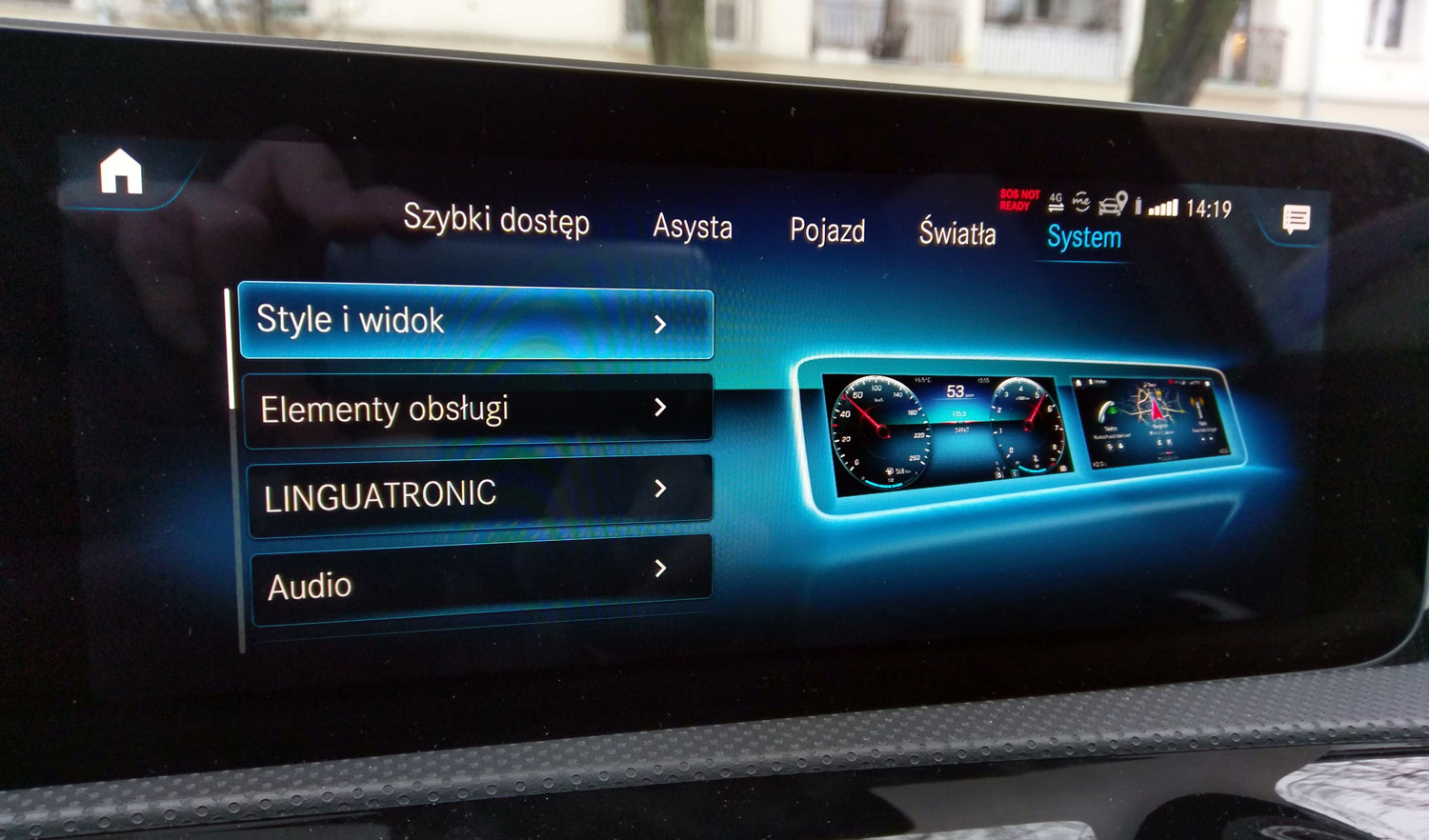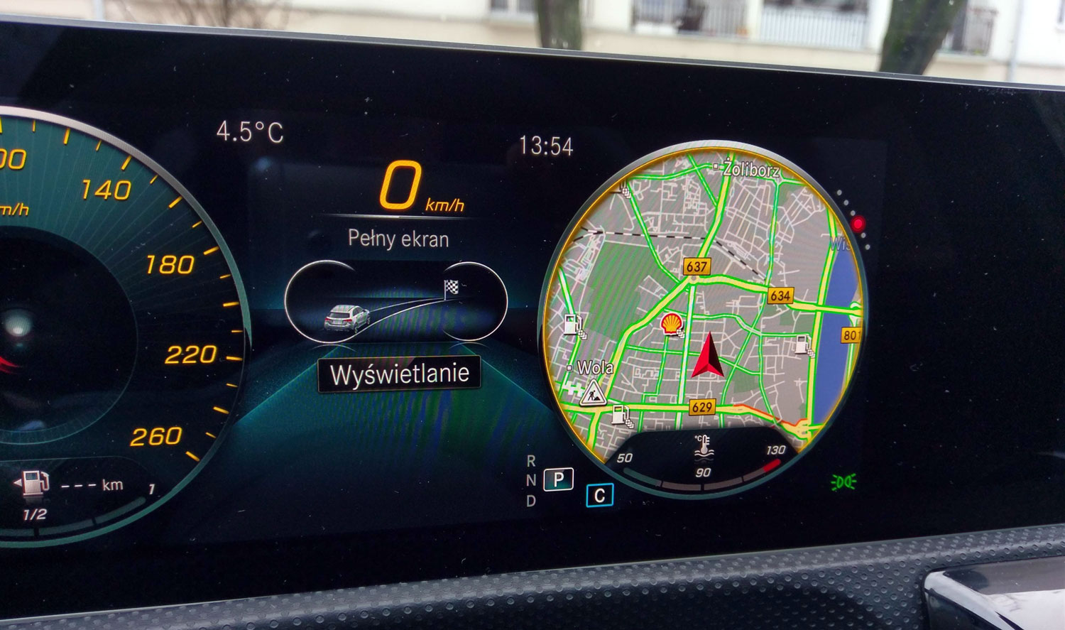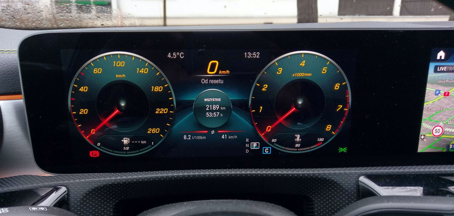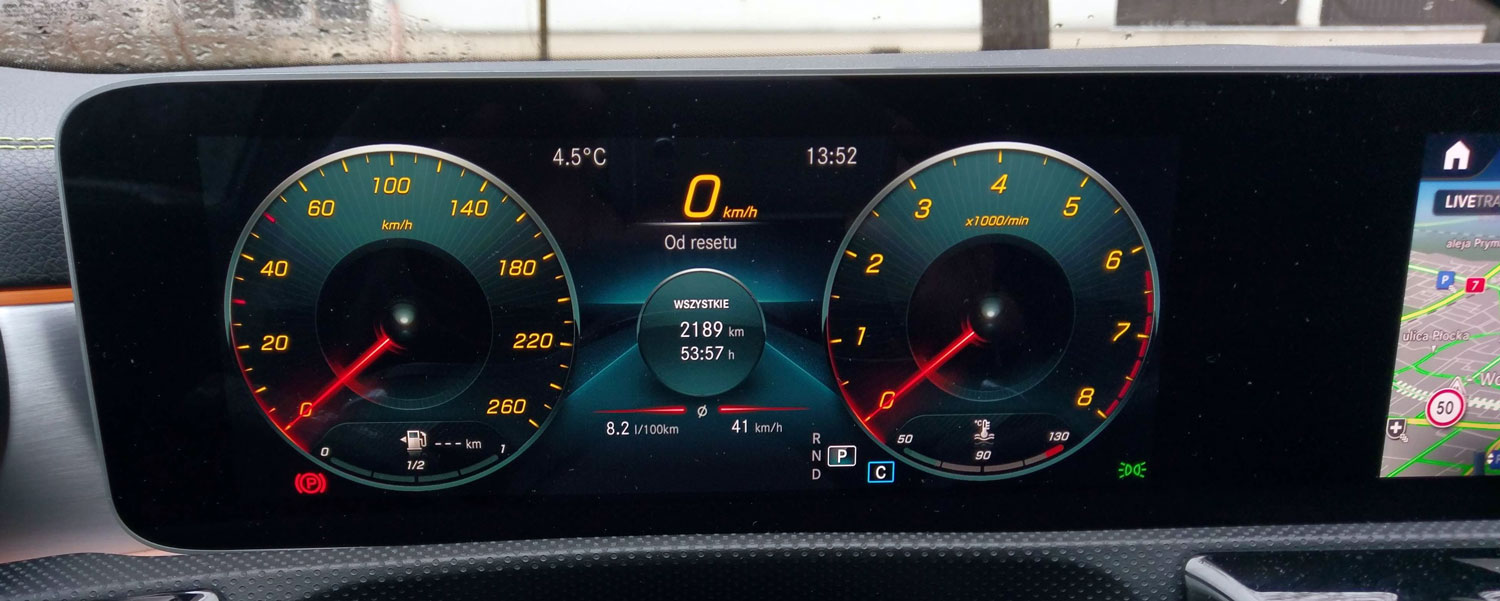Jeżeli chodzi o monitor widoczny za kierownicą, można tutaj zmieniać zarówno motyw graficzny (dostępne są dwa, standardowy i sportowy w czerwono-żółtych odcieniach), jak i dobierać jakie informacje mają być wyświetlane w poszczególnych obszarach. Nic nie stoi na przeszkodzie, aby np. zamiast prędkościomierza i obrotomierza kierowca widział np. dane przekazywane przez asystentów kierowcy, statystykę podróży (kilometraż, spalanie, czas, średnia prędkość itp.), mapę nawigacyjną, czy informacje mające ułatwić kierowcy oszczędną jazdę. Z kolei menu ekranu środkowego na pierwszy rzut oka wydaje się podobne do rozwiązań, które widzieliśmy w innych autach (Audi, BMW, VW itp.) – chodzi o charakterystyczny, poziomy układ ikon przy ekranie przewijanym w prawo i lewo. W istocie interfejs systemu zastosowanego w Mercedesie jest przewijany zarówno lewo-prawo, jak i góra-dół, dając tym samym dostęp do wielu różnych, dodatkowych opcji. Główne kategorie funkcji dostępne są w menu poziomym, ale gdy przesuniemy ekran w górę, otrzymamy dla aktualnie wybranej kategorii ustawień dodatkowe funkcje.