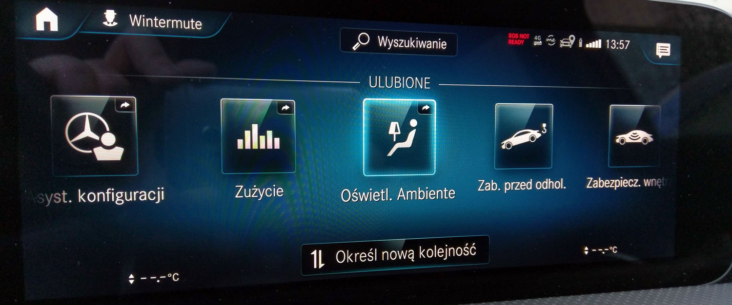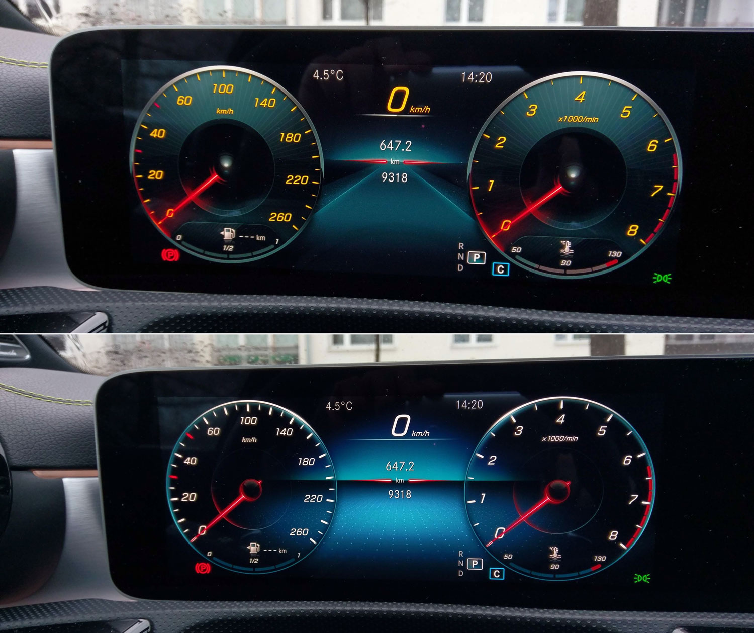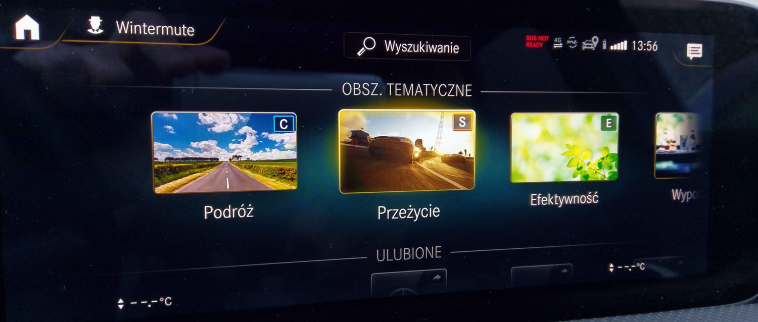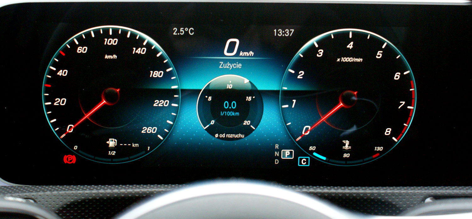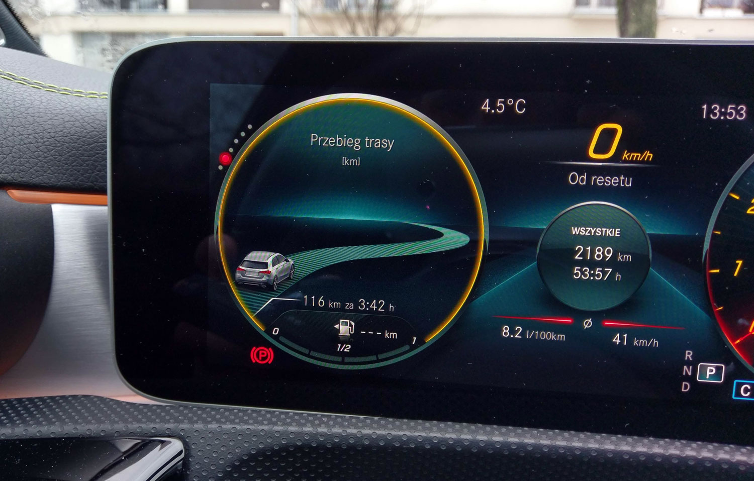 Jeżeli chodzi o monitor widoczny za kierownicą, można tutaj zmieniać zarówno motyw graficzny (dostępne są dwa, standardowy i sportowy w czerwono-żółtych odcieniach), jak i dobierać jakie informacje mają być wyświetlane w poszczególnych obszarach. Nic nie stoi na przeszkodzie, aby np. zamiast prędkościomierza i obrotomierza kierowca widział np. dane przekazywane przez asystentów kierowcy, statystykę podróży (kilometraż, spalanie, czas, średnia prędkość itp.), mapę nawigacyjną, czy informacje mające ułatwić kierowcy oszczędną jazdę. Z kolei menu ekranu środkowego na pierwszy rzut oka wydaje się podobne do rozwiązań, które widzieliśmy w innych autach (Audi, BMW, VW itp.) – chodzi o charakterystyczny, poziomy układ ikon przy ekranie przewijanym w prawo i lewo. W istocie interfejs systemu zastosowanego w Mercedesie jest przewijany zarówno lewo-prawo, jak i góra-dół, dając tym samym dostęp do wielu różnych, dodatkowych opcji. Główne kategorie funkcji dostępne są w menu poziomym, ale gdy przesuniemy ekran w górę, otrzymamy dla aktualnie wybranej kategorii ustawień dodatkowe funkcje.