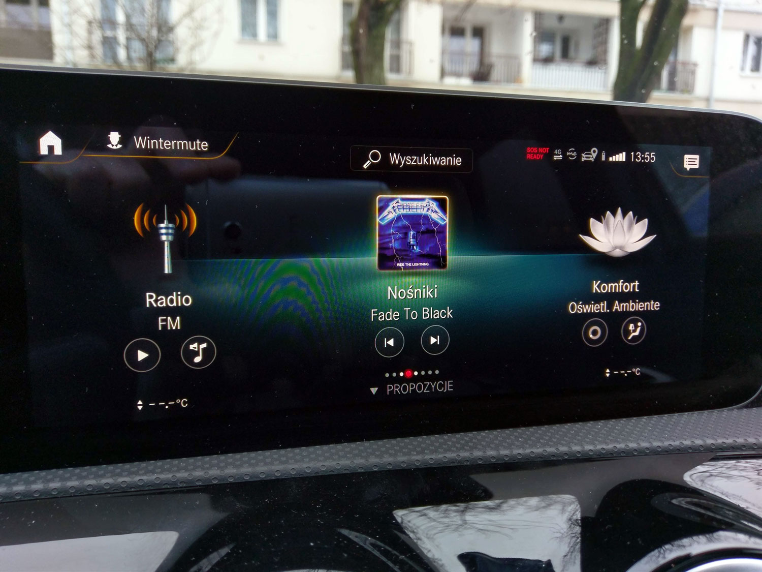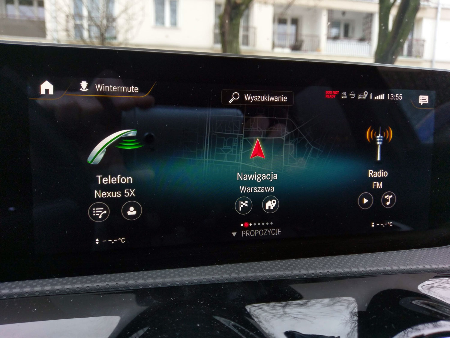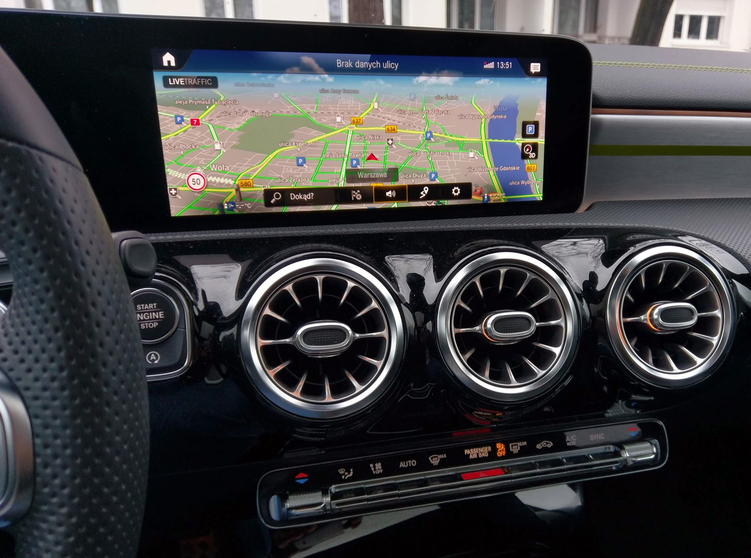 Choć oba ekrany wyglądają identycznie (ta sama przekątna i równie wysoka – na ile mogłem ocenić – rozdzielczość), to ten bezpośrednio widoczny przed oczami kierowcy nie jest ekranem dotykowym. To zrozumiałe, instalowanie dotykowego interfejsu na wyświetlaczu w tym miejscu było by nonsensem, co innego w przypadku drugiego ekranu umieszczonego nad tunelem centralnym, bardziej na środku deski rozdzielczej. Ten na dotyk reaguje bezbłędnie, ale to nie interfejs dotykowy okazał się wyróżnikiem wbudowanego w Mercedesa A200 systemu MBUX.