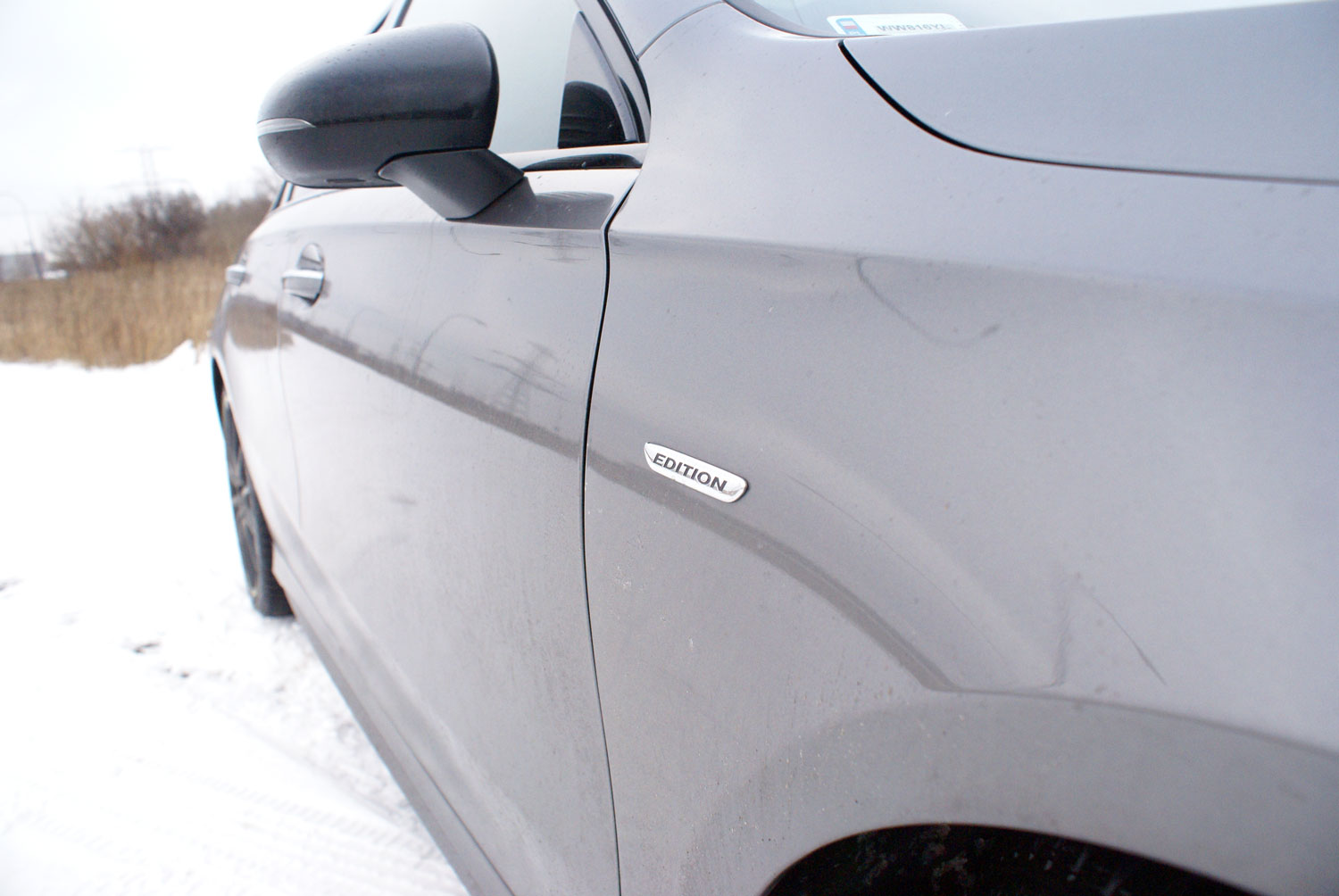 Również wnętrze pełne jest charakterystycznych, żółtych, czy może żółto-zielonych akcentów kolorystycznych: przeszycia na skórzanych obiciach wewnętrznych drzwi, na desce rozdzielczej, malowana linia z napisem “EDITION” przed przednim fotelem pasażera, wszystko to może się podobać, podobnie jak bardzo dobre spasowanie i użyte materiały wykończeniowe. W drzwiach kierowcy standardowy zestaw przycisków: elektryczna regulacja obu lusterek bocznych, sterowanie szybami, blokada zamka, chowanie lusterek, a także ogrzewanie fotela kierowcy (fotel pasażera ogrzewany jest przyciskiem na drzwiach pasażera). Regulacja wysokości, przesuwu i kąta nachylenia oparcia foteli kierowcy i pasażera jest tutaj tylko manualna, co stanowiło pewien kontrast z bogatą elektroniką wnętrza pojazdu.