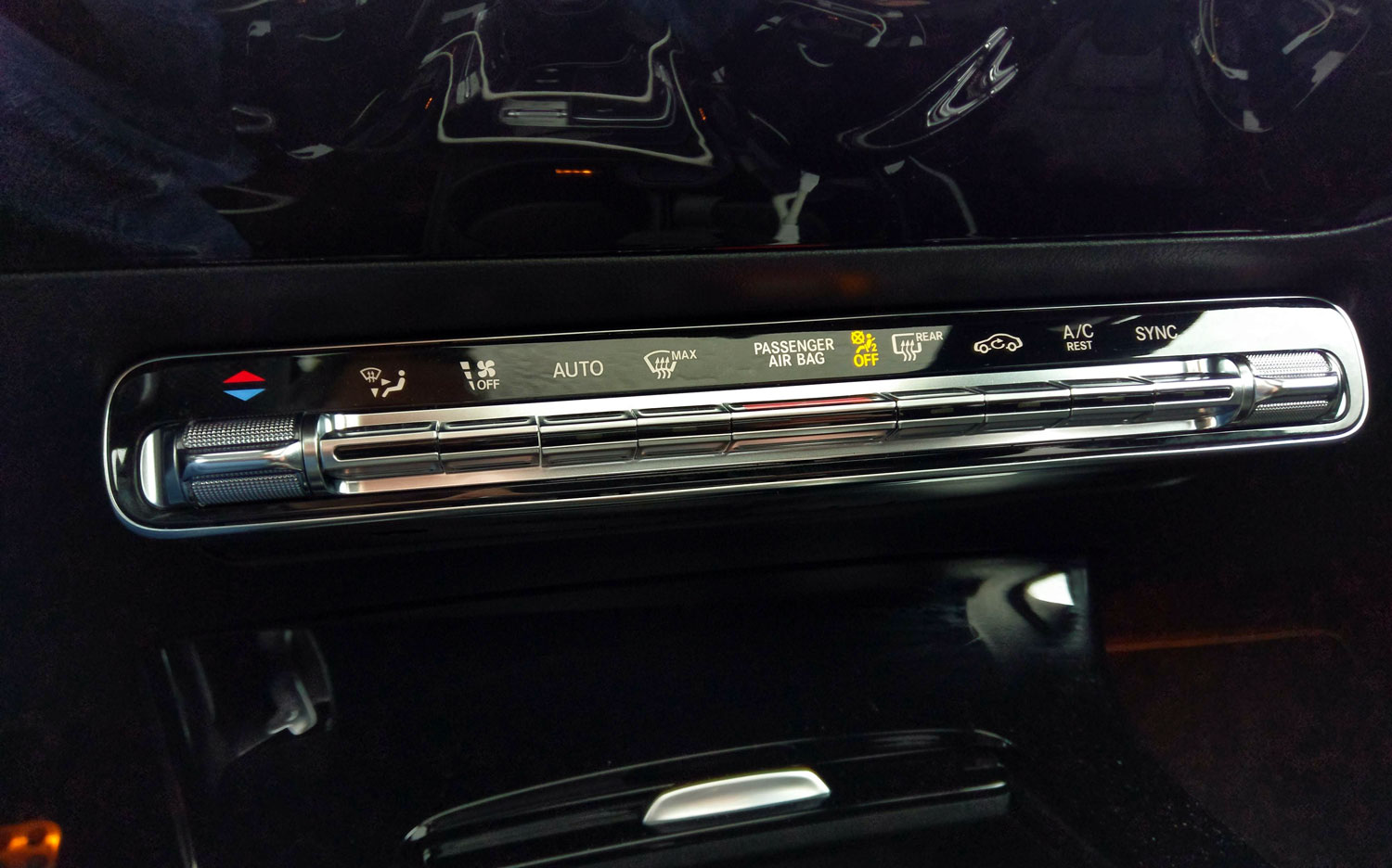 Czarne pola widoczne na kierownicy pełnią dwojaką funkcję: są jednocześnie przyciskami i małymi gładzikami (touchpadami). Tych, którzy mogą mieć wątpliwości co do wygody takiego rozwiązania uspokajam – jeżeli nie boicie się używać touchpada w laptopie, te zastosowane w kierownicy Mercedesa nie będą dla was żadnym wyzwaniem, choć mogą wymagać odrobiny przyzwyczajenia – jak wszystko, co nowe. Nie można pominąć jeszcze dużego touchpada umieszczonego w tunelu centralnym, pomiędzy kierowcą a pasażerem. Temu gładzikowi towarzyszy dodatkowa, skórzana podpórka, dzięki czemu praworęczni mogą wygodnie i intuicyjnie wprowadzać znaki, zmieniać opcje w menu czy wybierać inne funkcje właśnie za pomocą touchpada. Dookoła producent rozmieścił jeszcze przyciski aktywujące wybrane funkcje cyfrowe pojazdu, m.in. nawigację, telefon, multimedia, asystenta parkowania, informacje o pojeździe czy inną dowolną funkcję jaką możemy przypisać do przycisku oznaczonego gwiazdką. Pod środkowym ekranem LCD i okrągłymi wywietrznikami znajduje się panel sterowania klimatyzacją (dwustrefowa).