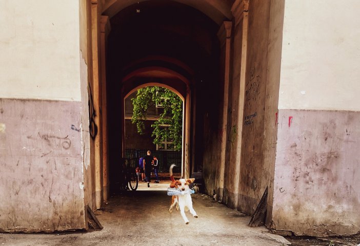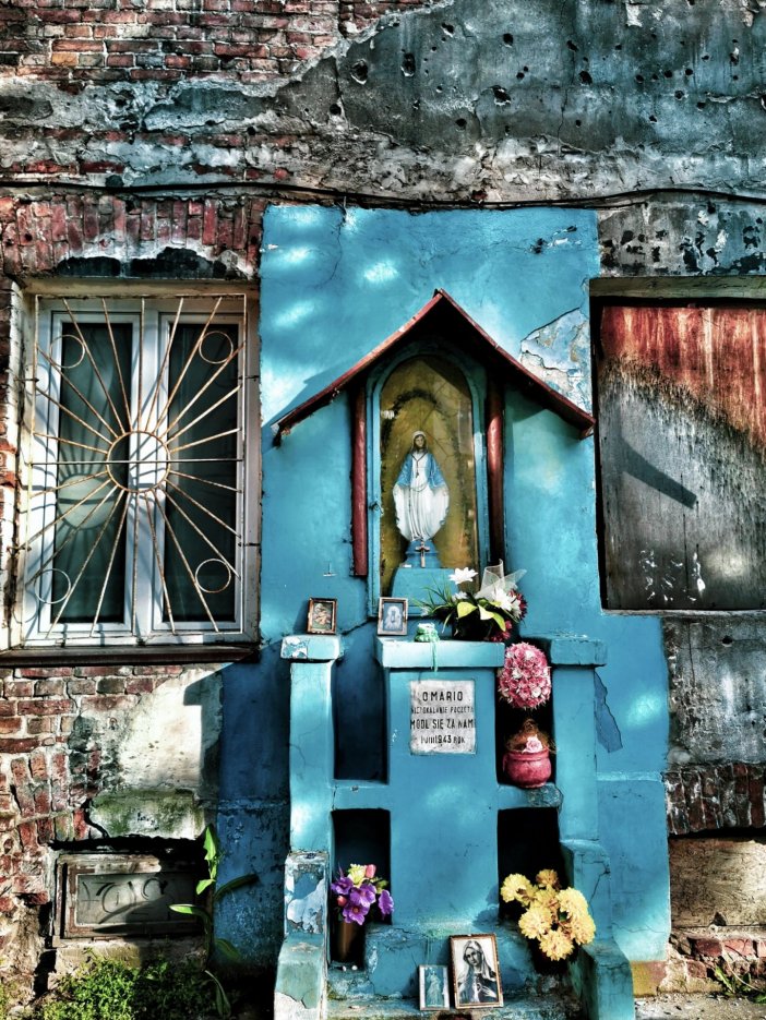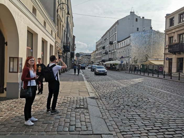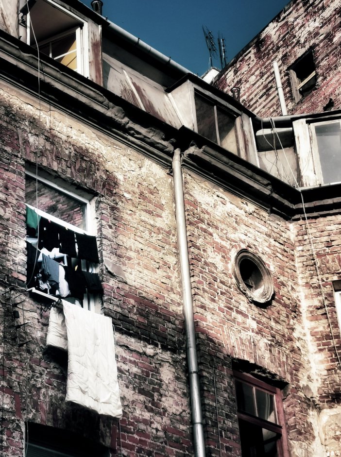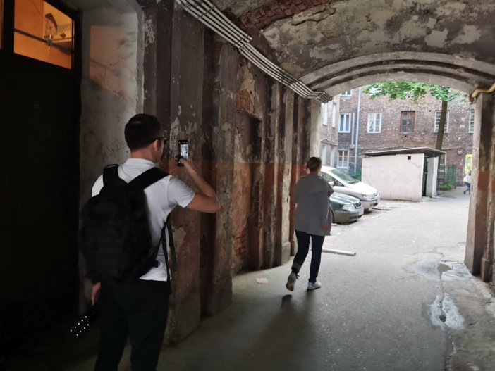 Przyjeżdżajacy do Warszawy zwykle najpierw oglądają okolice Dworca Centralnego otoczonego hałasem i wielkimi wieżowcami. Nierzadko eklektyzm, który tam widzą – obok siebie budynki sprzed wojny, socrealistyczne, późniejsze PRL-owskie bloki, razem z nowoczesnymi drapaczami chmur – nie zostawia w gościach dobrych odczuć. Turyści odwiedzają zwykle starówkę, czasem Powiśle, standardowo Łazienki. My finalistom konkursu chcieliśmy pokazać Warszawę od mniej zwyczajnej i stereotypowej strony, dlatego znowu przekroczyliśmy Wisłę, tym razem na wschód. Starą Pragę okrywa zła sława. W wielu miejscach jest zaniedbana, zapuszczona i brudna. W innych potrafi być piękna. Ale przede wszystkim ma charakter, prawdę oraz jedyne takie w Warszawie nagromadzenie ocalałych z wojny kamienic. Na Pradze spacerowaliśmy m.in. Brzeską i Ząbkowską, zaglądając na wiele podwórek. Tam spotykaliśmy lokalnych mieszkańców – przesiadujący wewnątrz budynków mężczyźni spoglądali na nas mało przychylnie. Z ich perspektywy byliśmy intruzami, wchodzącymi na teren, który traktują jako własny. A popołudniowe światło nadal pięknie podkreślało te poharatane czasem i życiem miejsca. O burzy i deszczu tego dnia jednak nie było mowy.