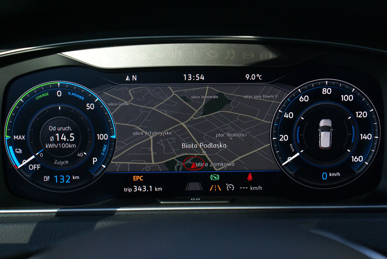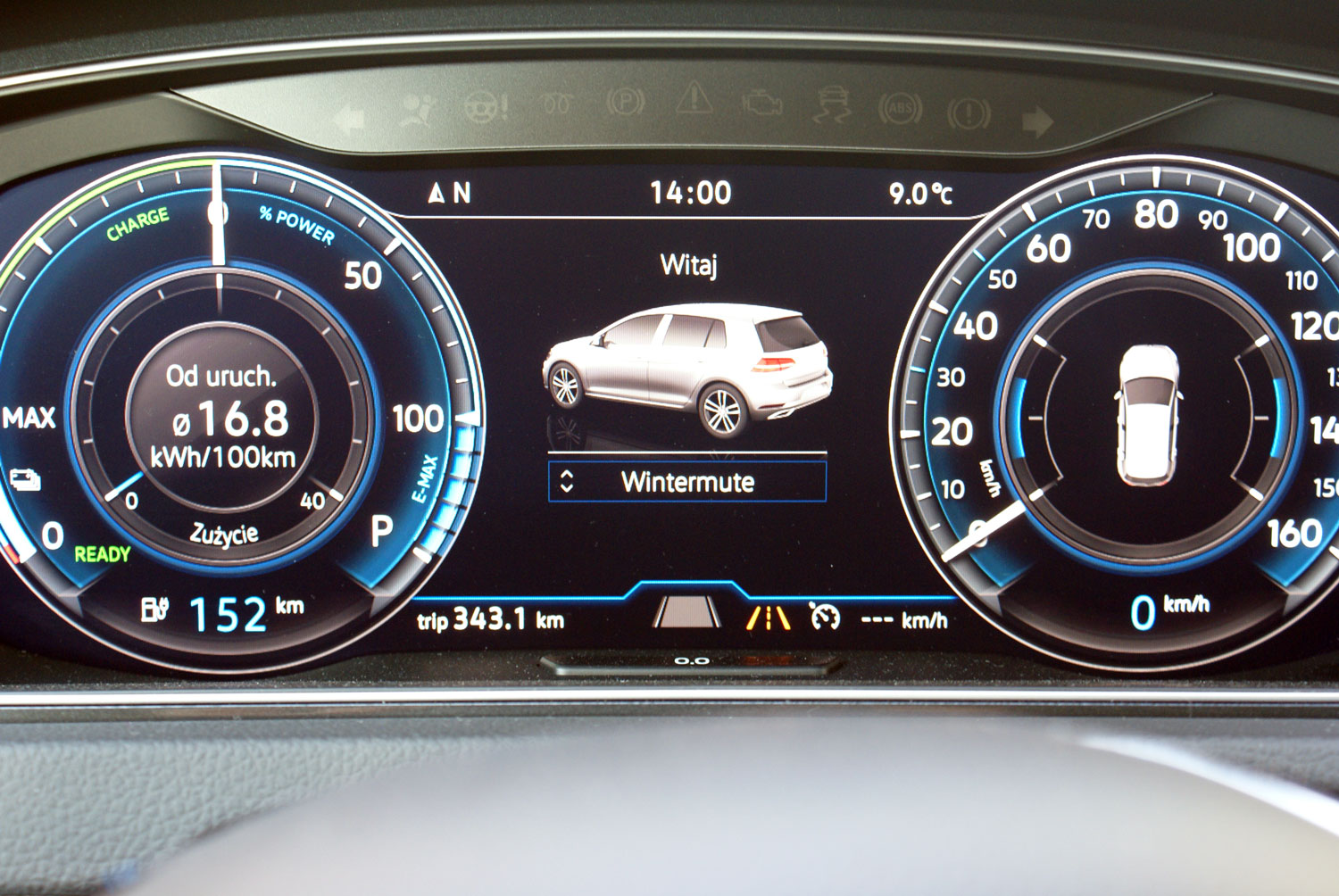 Oczywiście informacje prezentowane na ekranie Active Info Display w e-Golfie różnią się od tych, które prezentuje analogiczny ekran w spalinowej odmianie kompaktu marki VW. W miejscu, gdzie w spalinowym aucie znajduje się obrotomierz tutaj mamy procentowy wskaźnik mocy generowanej przez silnik elektryczny, oprócz tego wirtualne koło wskaźnika mocy informuje także o ewentualnej rekuperacji (odzysku energii). Prędkościomierz z racji osiągów e-Golfa został wyskalowany do 160 km/h, więcej po prostu nie jest potrzebne. Oczywiście ekran wirtualnej tablicy rozdzielczej jest w pełni konfigurowalny, a dzięki wbudowanym profilom kierowców, może on wyglądać inaczej dla każdego użytkownika. Pomiędzy wirtualnymi zegarami możemy umieścić np. mapę systemu nawigacji, informacje statystyczne dotyczące zużycia energii, podróży, odległości, dane na temat aktualnie odtwarzanych multimediów i wiele więcej.