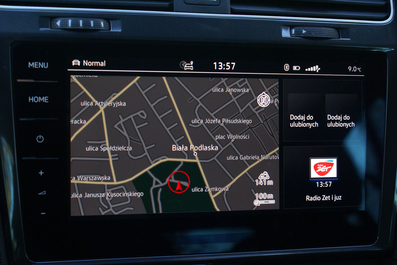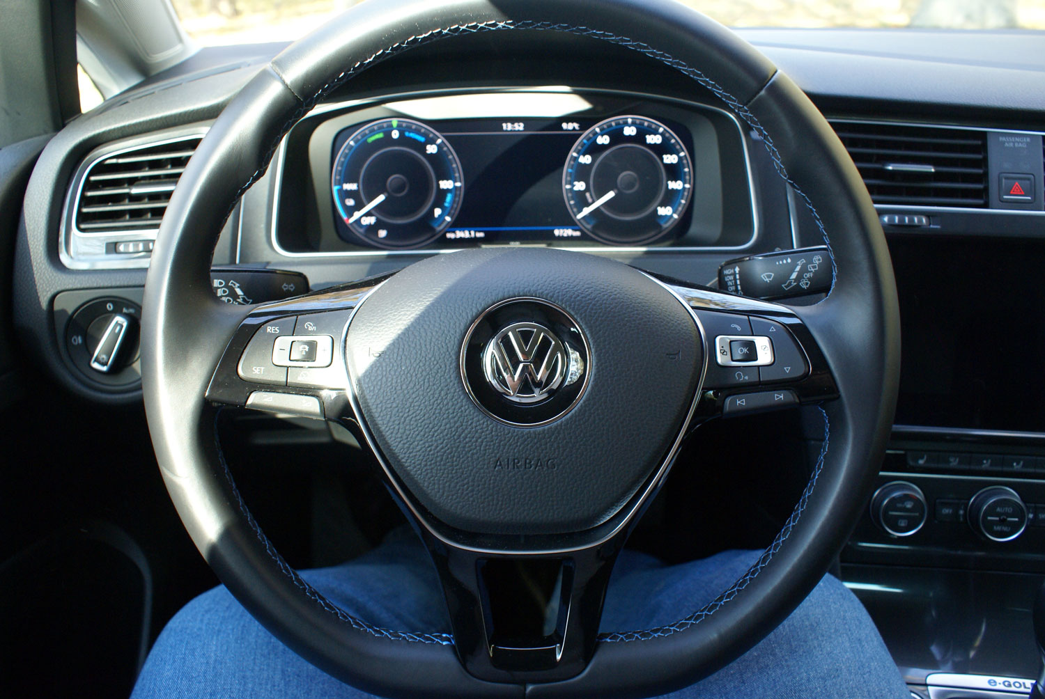 W testowanym VW e-Golf, podobnie jak w innych Golfach wyposażonych w kierownicę wielofunkcyjną (w e-Golfie jest ona wyposażeniem standardowym), kierowca może wieloma funkcjami pojazdu sterować za pośrednictwem przycisków umieszczonych właśnie na kierownicy. Za jej pomocą kontrolujemy pracę wbudowanego adaptacyjnego tempomatu współpracującego z systemem Front Assist (ACC i Front Assist to standardowe wyposażenie e-Golfa), sterujemy radiem i multimediami, aktywujemy interfejs głosowy (działający, podobnie jak w innych Golfach, po polsku), czy korzystamy z zestawu głośnomówiącego i funkcji telefonicznych po sparowaniu z pokładowym systemem naszego smartfona.