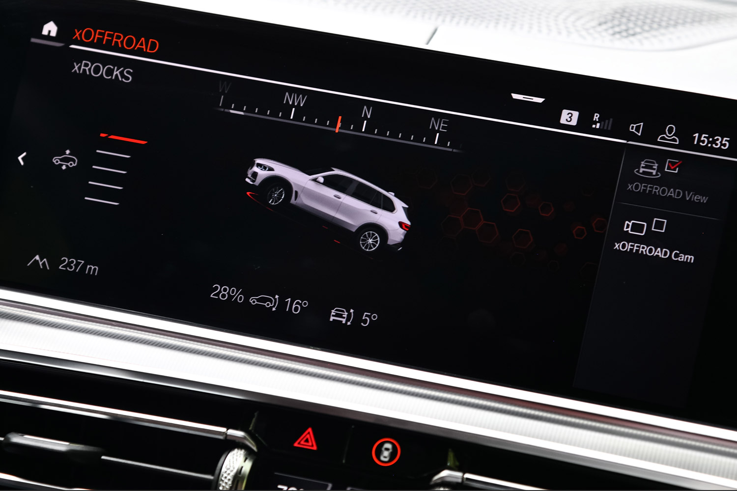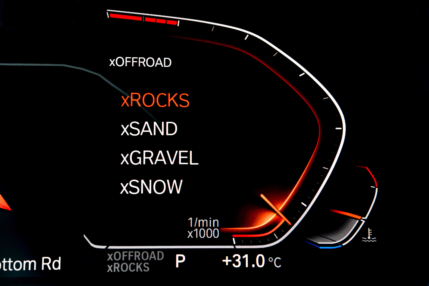 Co więcej, BMW X5, które mieliśmy okazję testować oferuje nie jeden, a kilka “podtrybów” offroadowych w menu systemu iDrive 7-mej generacji. W zależności od podłoża terenu po którym jedziemy można wybrać ustawienia do jazdy na skałach, w piachu, na żwirze czy po śniegu. W zależności od wybranego ustawienia komputer optymalnie dostosuje pracę aktywnego zawieszenia. Ekran w konsoli środkowej na bieżąco nie tylko wyświetla sytuację dookoła pojazdu podczas jazdy w terenie, ale również zawczasu ostrzeże, gdy przeszkoda terenowa znajduje się na kursie kolizyjnym, oprócz tego otrzymujemy na bieżąco informacje na temat skrętu kół, czy przechyłu auta.