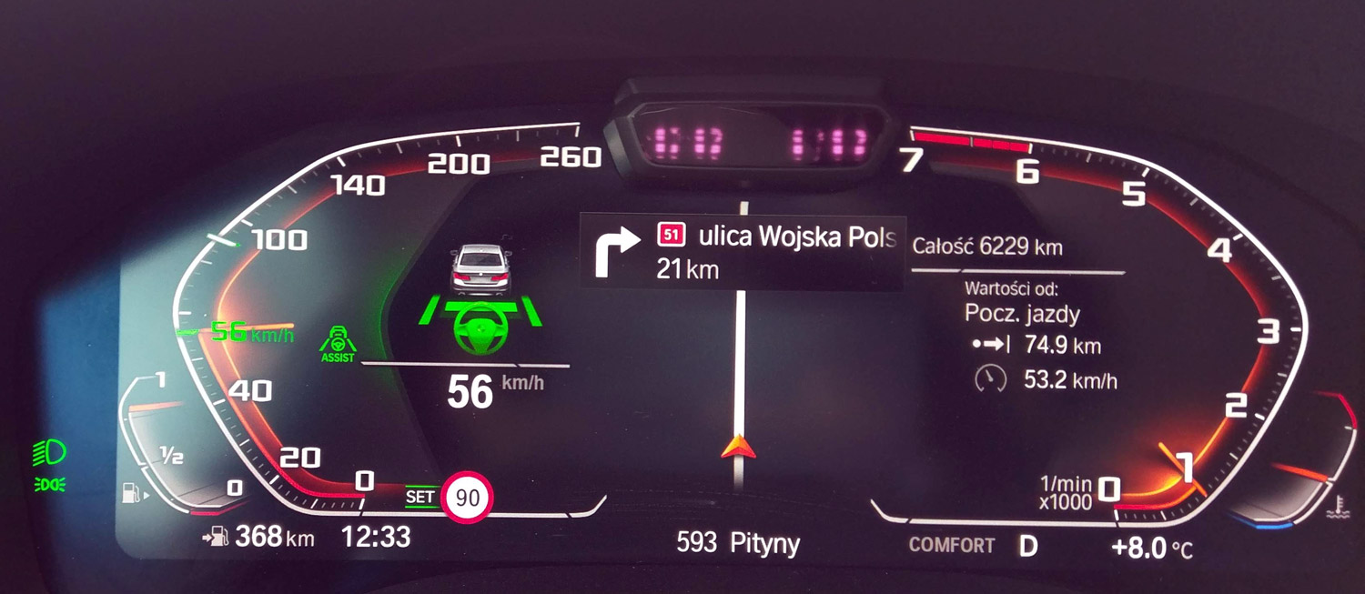 Jeżeli chodzi o technologiczne wsparcie kierowcy, BMW M850i xDrive oferuje praktycznie wszystko, czym bawarski producent na dzień dzisiejszy dysponuje. Mamy tu możliwość półautonomicznej jazdy z utrzymywaniem pasa ruchu, automatyczną jego zmianą po włączeniu kierunkowskazu czy samodzielnym rozpędzaniem i wyhamowywaniem w ramach zadanych przez kierowcę ustawień adaptacyjnego tempomatu i sytuacji na drodze (ograniczenia prędkości, pojazdy poprzedzające, itp.). Jest też asystent jazdy w korku, jako że część zaplanowanej przez BMW trasy przebiegała przez miasto również ten aspekt mogliśmy sprawdzić w praktyce – auto w gęstym ruchu miejskim samodzielnie utrzymuje odpowiednią prędkość i odległość od innych uczestników ruchu, szkoda że nie hamuje samodzielnie przed skrzyżowaniami z czerwonym światłem i nie rusza samo na zielonym – to jednak jeszcze nie ten poziom autonomii.