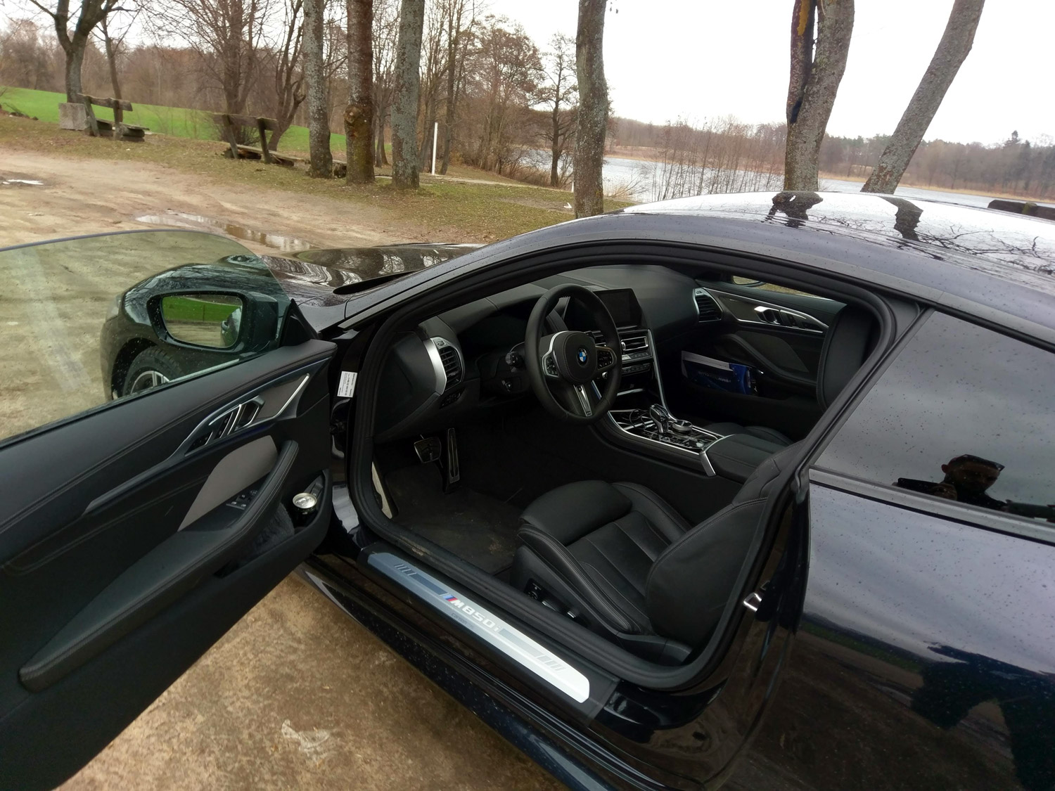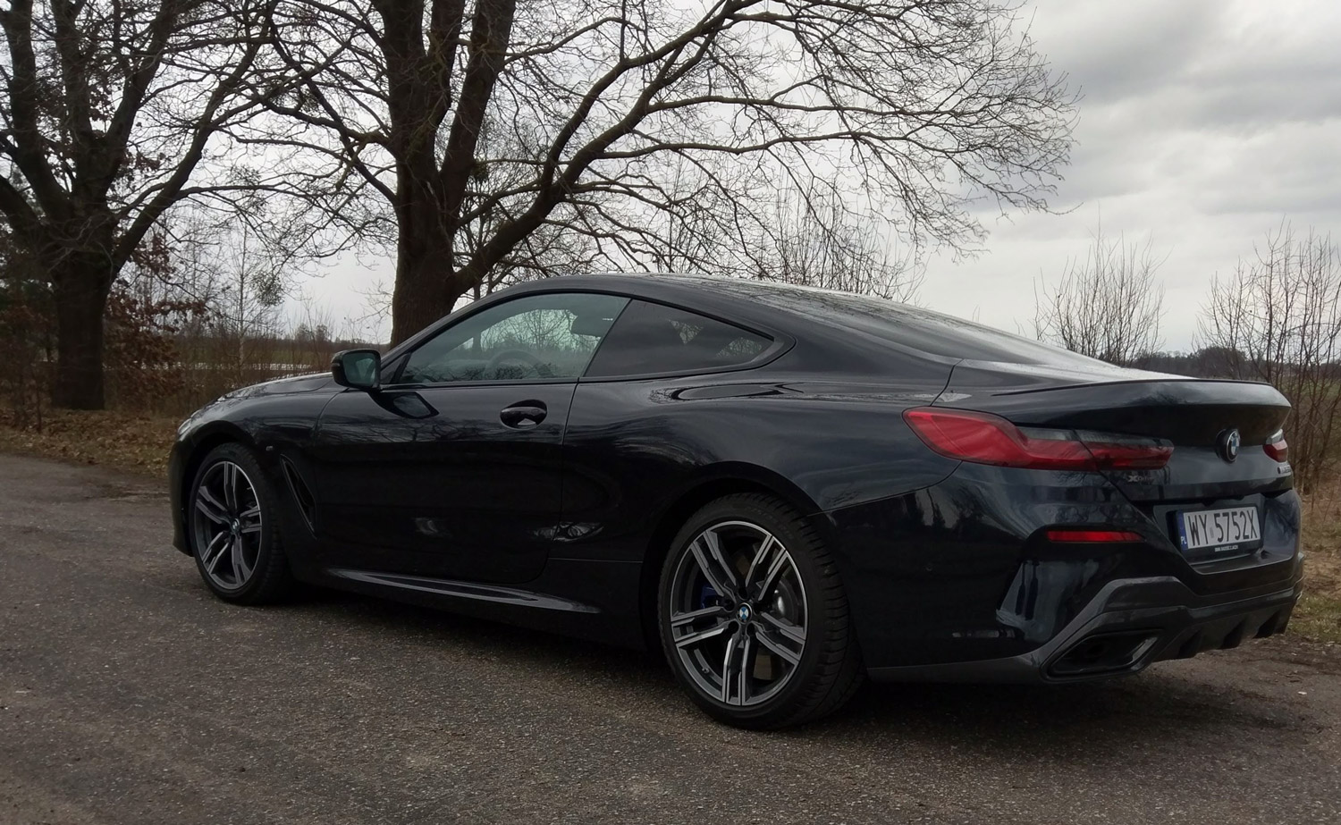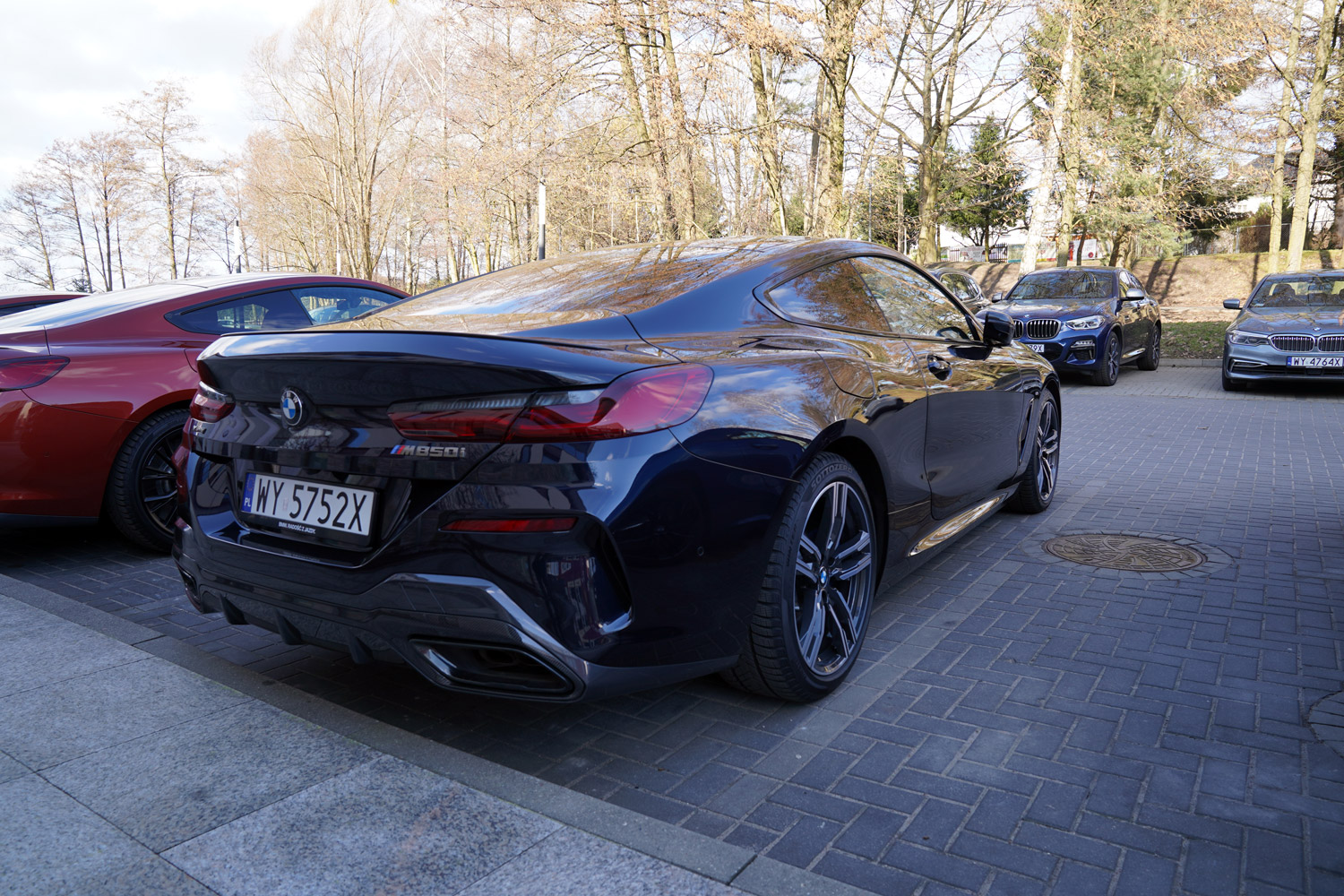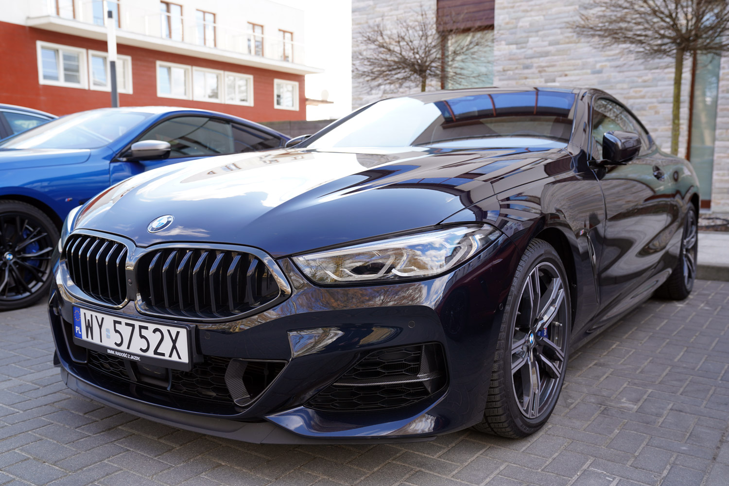 Czarne BMW M850i xDrive Coupe, z którego korzystaliśmy na mazurskich drogach to potężne auto. Dwudrzwiowy, czteromiejscowy ciężki samochód o masie dwóch ton napędza mocny, turbodoładowany silnik benzynowy o pojemności skokowej 4395 cm3, generujący moc maksymalną aż 390 kW (530 KM). Ta potężna moc przekazywana jest na wszystkie cztery koła (xDrive) za pośrednictwem błyskawicznie działającej 8-stopniowej automatycznej skrzyni Steptronic ze sprzęgłem hydrokinetycznym. Zgodnie z otrzymaną podczas testów specyfikacją techniczną, egzemplarz przekazany nam na jazdy testowe wyceniany jest przez producenta na astronomiczną dla większości ludzi kwotę 687 807 zł. Bazowa wersja BMW M850i xDrive kosztuje 589 500 zł. Różnica wynika z opcjonalnego wyposażenia dodanego do egzemplarza testowego. W skład tego dodatkowego wyposażenia wchodziły m.in. takie elementy jak: opony typu runflat, 20-calowe obręcze, adaptacyjne zawieszenie M Professional, izolacja termiczna i akustyczna przedniej szyby, ogrzewanie przednich foteli (które są również wentylowane), kierownicy i podłokietników, laserowe reflektory, zestaw HiFi harman/kardon Surround Sound, czy karbonowy pakiet zewnętrzny M.