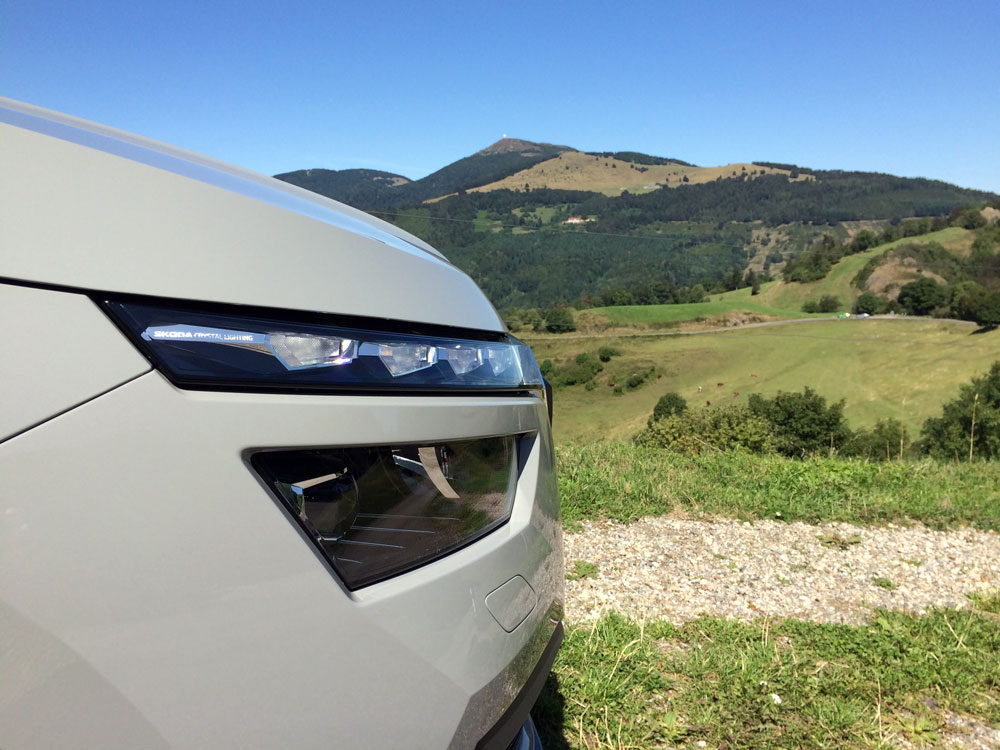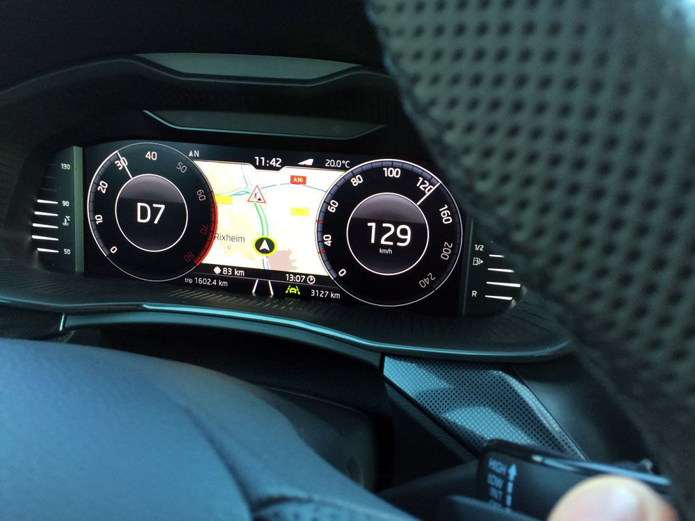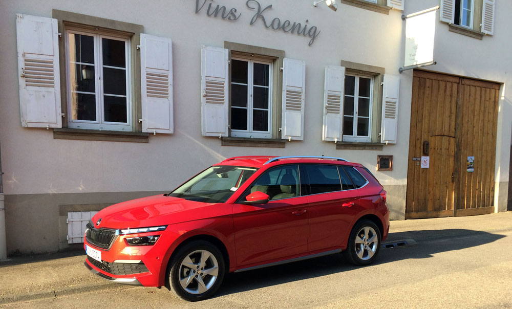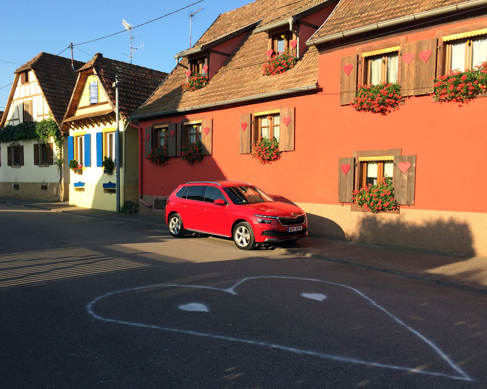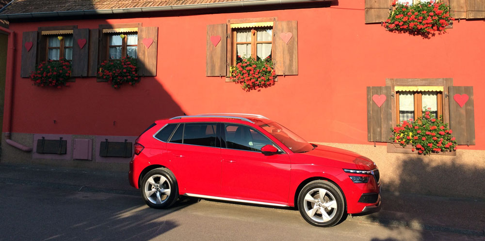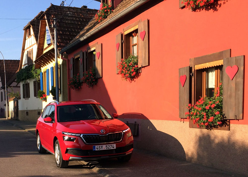 Škoda Kamiq to auto, które może się podobać. Charakterystyczne, przedzielone reflektory przednie to znak rozpoznawczy współczesnych modeli czeskiej marki. Testowany egzemplarz wyposażony był w pełne światła LED, przy czym te do jazdy dziennej umieszczone są wyżej, bezpośrednio pod linią maski. 115-konny silnik benzynowy to jednostka w zupełności wystarczająca na większość dróg, z jakimi auto z racji swoich gabarytów może się mierzyć. Kompaktowy, zwarty SUV jest dość zwinny i dobrze radził sobie na bardzo krętych, górskich drogach Alzacji. Co więcej, nasze obawy, czy jednostka poradzi sobie z niemal 20-stopniowymi przewyższeniami, na które trzeba było wjechać okazały się niepotrzebne. Owszem, podczas jazdy pod górę, auto reagowało na wciśnięcie pedału przyspieszenia z niewielkim opóźnieniem, ale silnik żwawo nabierał impetu i właściwie rozpędzał pojazd. Również na drogach szybkiego ruchu i autostradach, jak i w ruchu miejskim, Kamiq radzi sobie całkiem dobrze. Hałas w kabinie podczas jazdy z prędkością 130 km/h (maksymalna, dopuszczalna na francuskich autostradach) nie jest zbyt duży i wciąż można normalnie, bez podnoszenia głosu rozmawiać z pasażerami. Nie bez znaczenia jest całkiem rozbudowana asysta kierowcy. Czym dysponuje kierowca Kamiq?