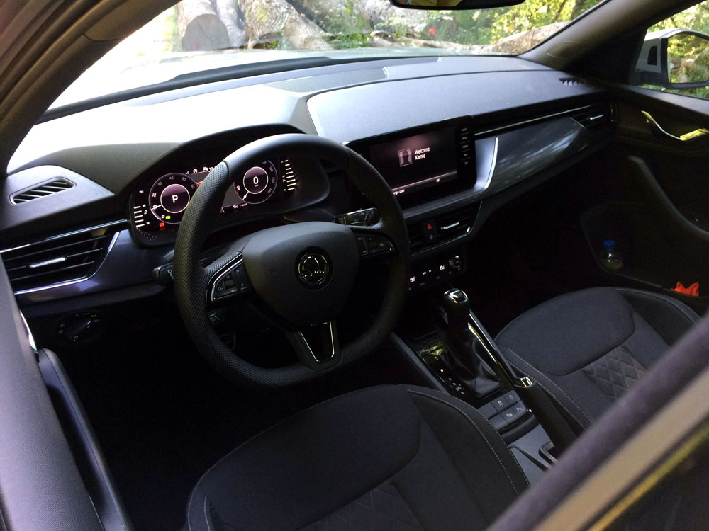 Adaptacyjny tempomat w trakcie jazd testowych działał bez zarzutu. Poprawnie wykrywał wolniejsze pojazdy dopasowując prędkość naszego auta do samochodu poprzedzającego, włącznie z całkowitym zatrzymaniem. Co więcej, Kamiq jest w stanie (oczywiście dotyczy to wersji z automatyczną skrzynią DSG, jaką mieliśmy w egzemplarzu testowym) również automatycznie ruszyć, o ile chwilowe zatrzymanie nie było dłuższe niż 3 sekundy. Jeżeli trwało dłużej, wtedy po prostu wystarczy trącenie pedału gazu, by auto przyśpieszyło do ustawionej na tempomacie prędkości. Kamiq jest ponadto wyposażony w elektroniczną blokadę mechanizmu różnicowego (XDS+) czuwającą nad trakcją osi napędowej, a także system Hill Control uniemożliwiający stoczenie się auta na wzniesieniach, których stopień nachylenia przekracza 5 stopni. W górach na trasie testowej było to szczególnie przydatne. Zajrzyjmy do wnętrza.