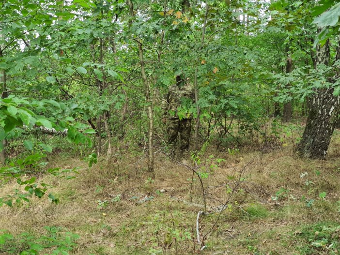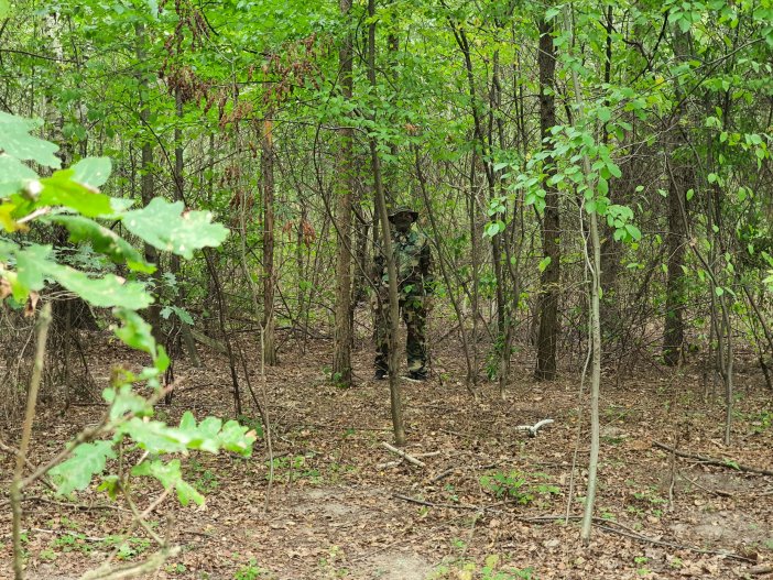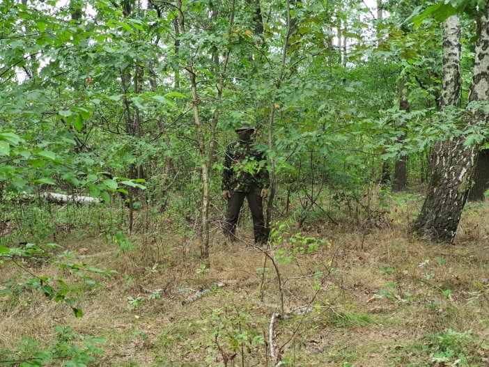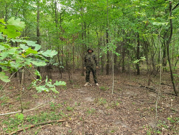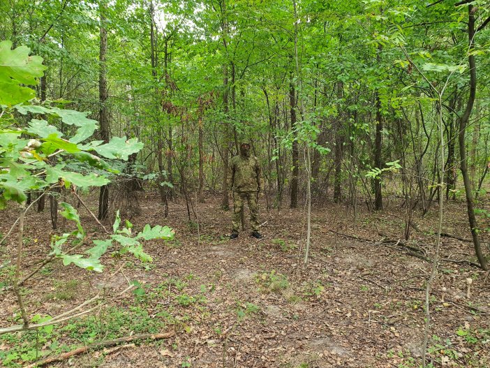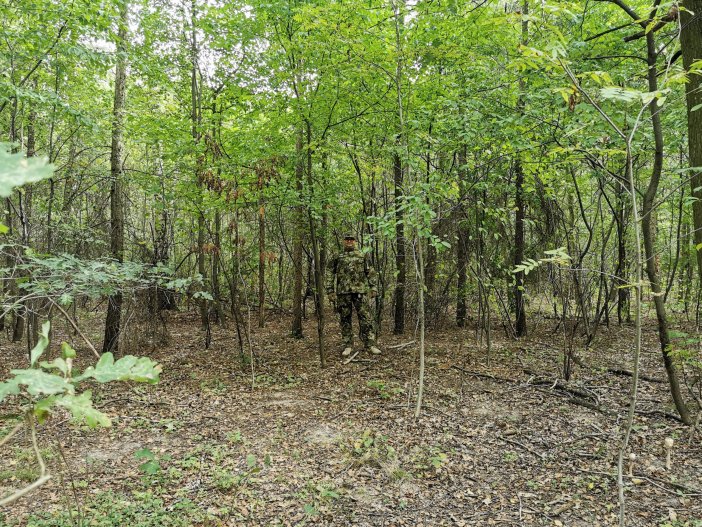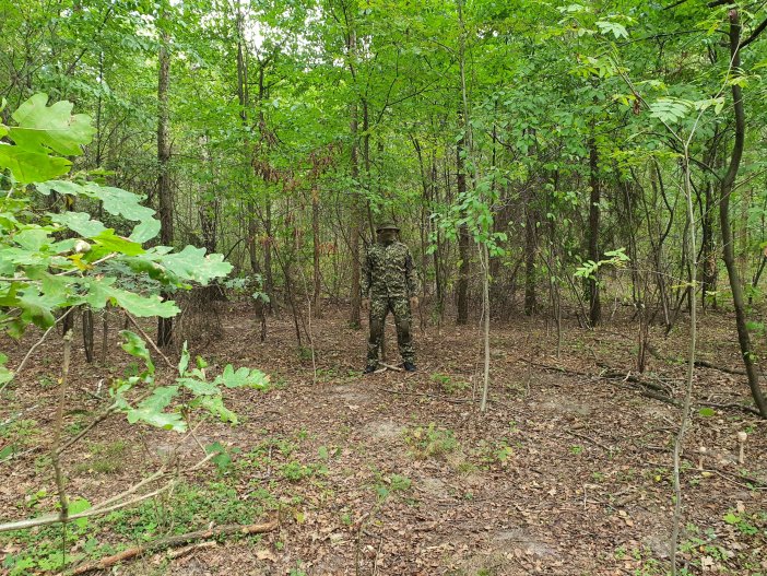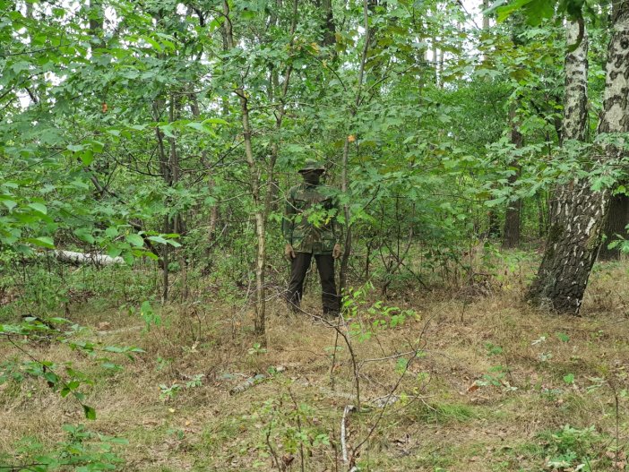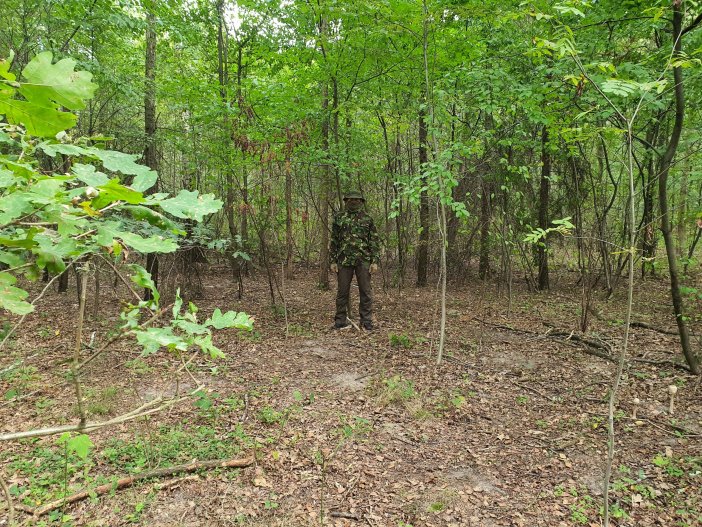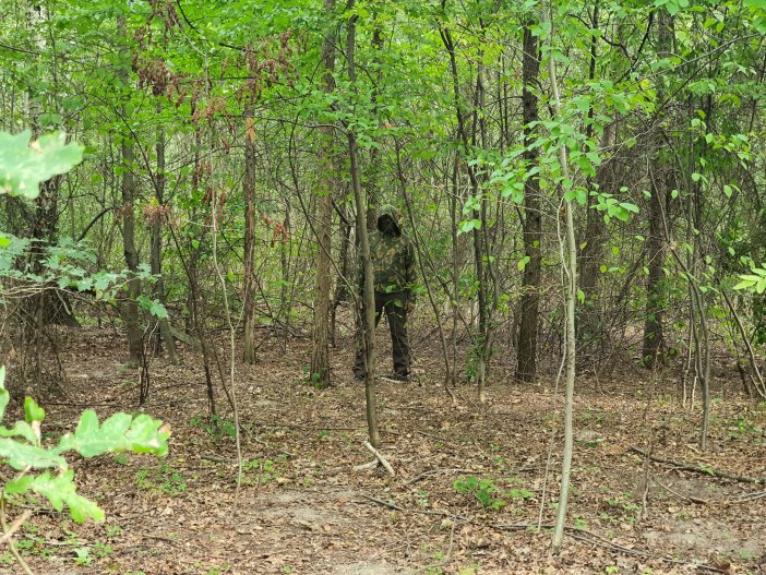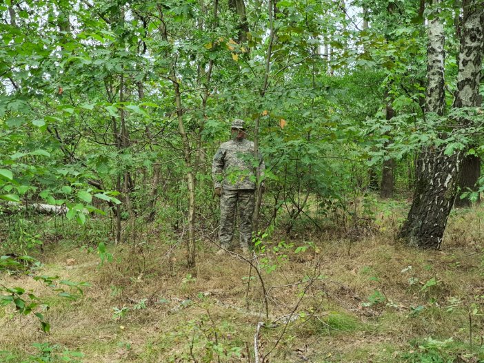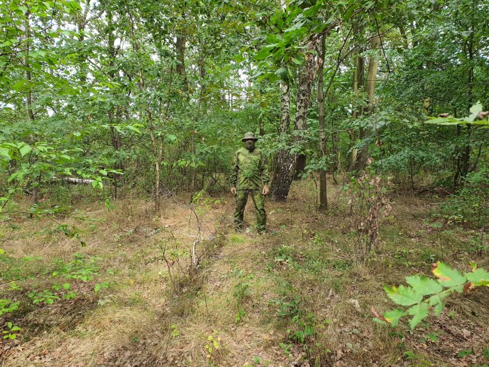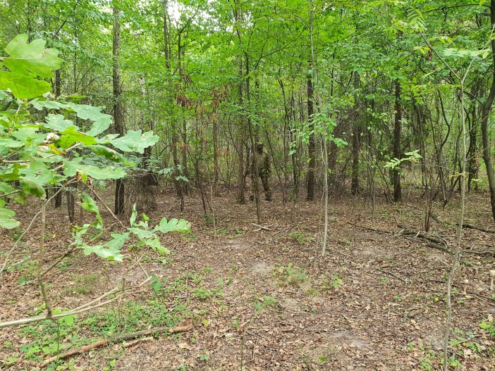 W pięknym lesie mieszanym wybraliśmy dwie lokacje – jedną jaśniejszą, otwartą z dominującymi podrastającymi drzewami liściastymi, a drugą ciemniejszą, z bijącymi się o światło młodymi świerkami. W każdej lokacji wykonaliśmy po trzy zdjęcia z każdym wzorem maskującym: