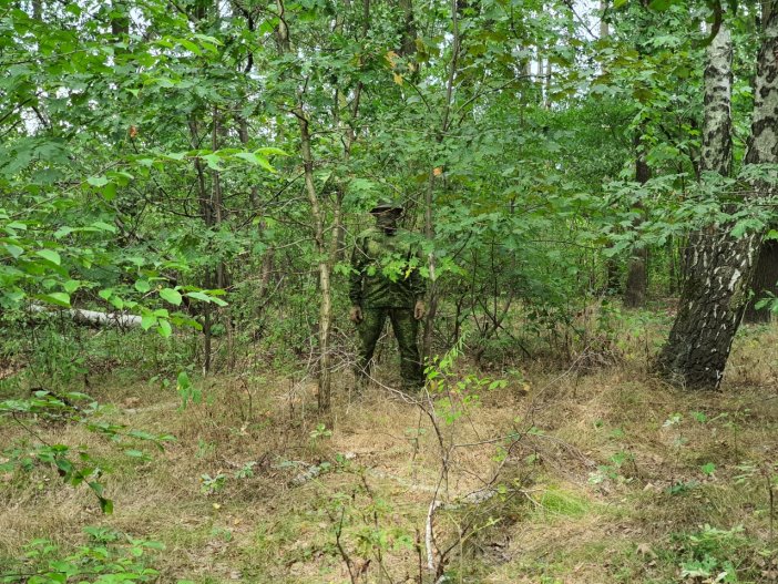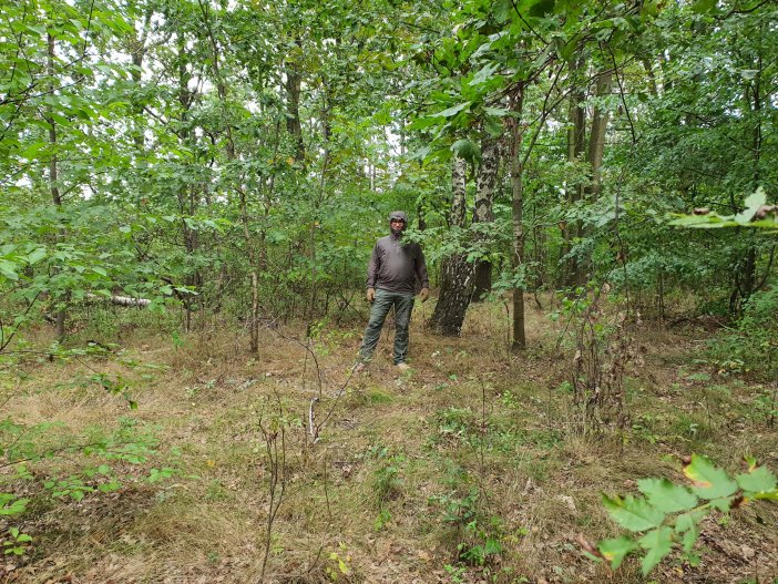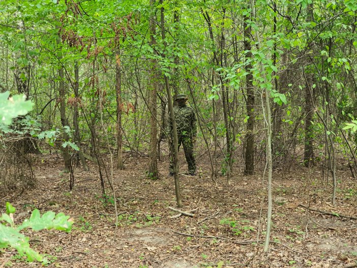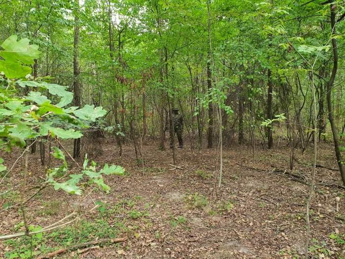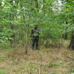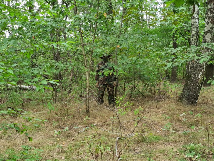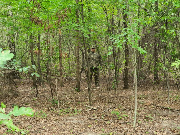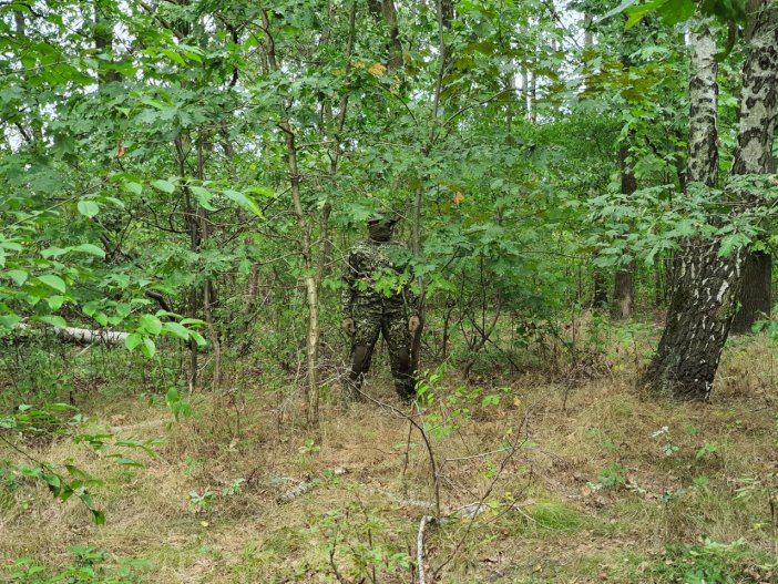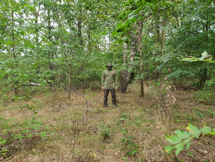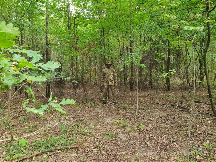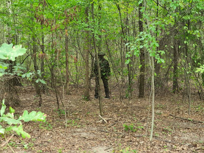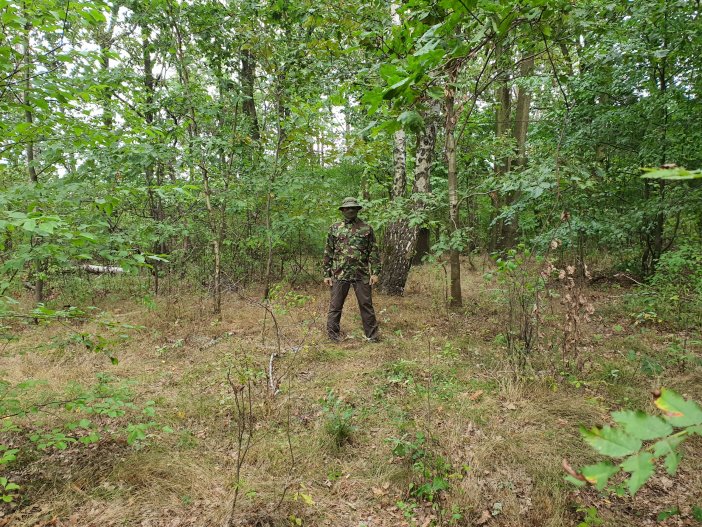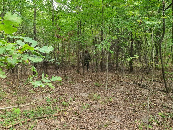 W pięknym lesie mieszanym wybraliśmy dwie lokacje – jedną jaśniejszą, otwartą z dominującymi podrastającymi drzewami liściastymi, a drugą ciemniejszą, z bijącymi się o światło młodymi świerkami. W każdej lokacji wykonaliśmy po trzy zdjęcia z każdym wzorem maskującym: