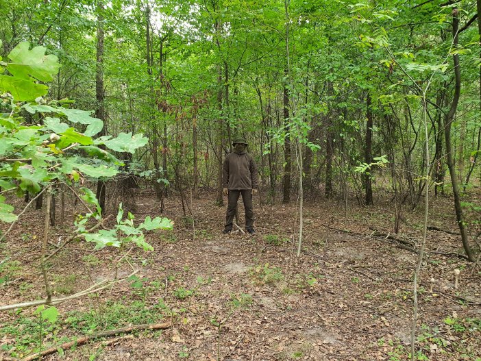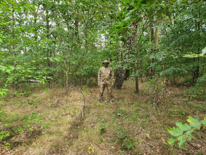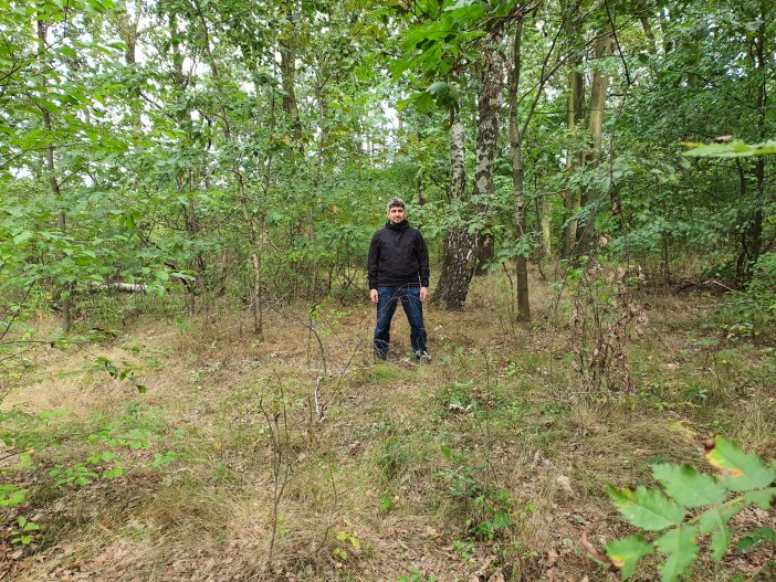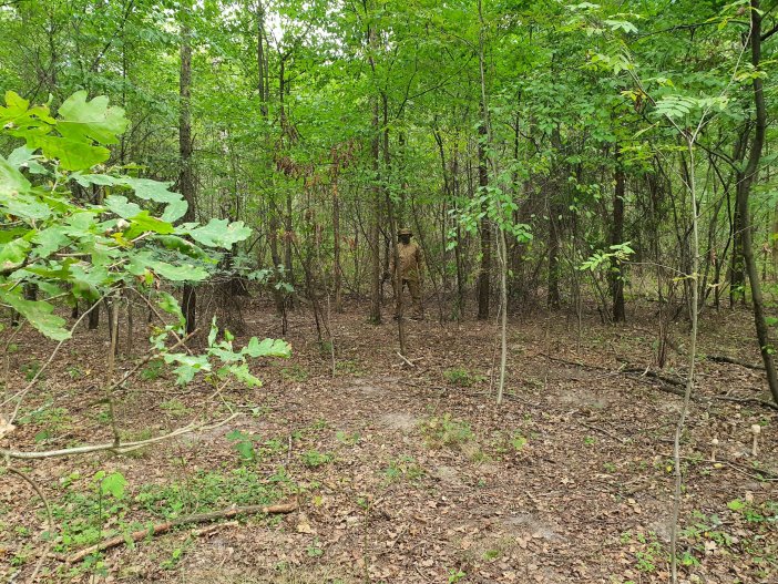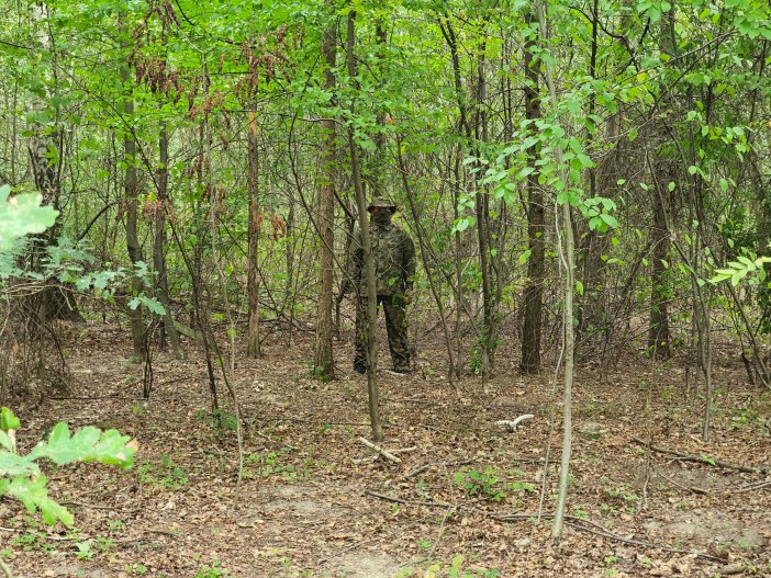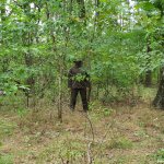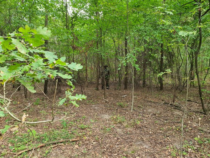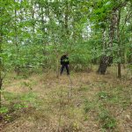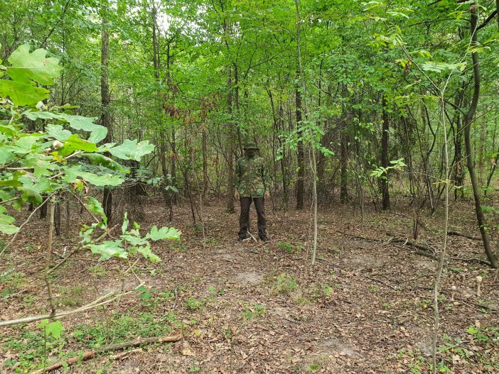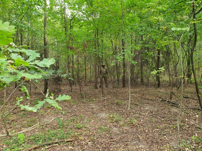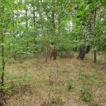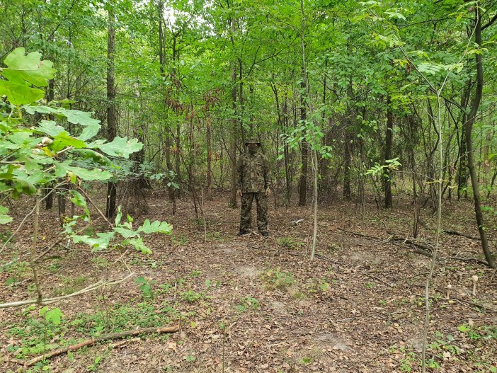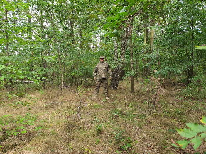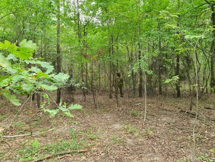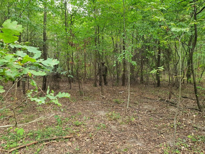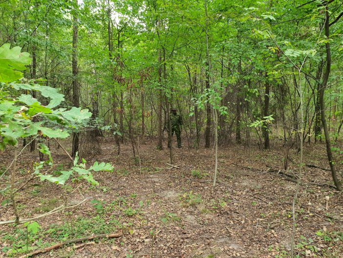 W pięknym lesie mieszanym wybraliśmy dwie lokacje – jedną jaśniejszą, otwartą z dominującymi podrastającymi drzewami liściastymi, a drugą ciemniejszą, z bijącymi się o światło młodymi świerkami. W każdej lokacji wykonaliśmy po trzy zdjęcia z każdym wzorem maskującym: