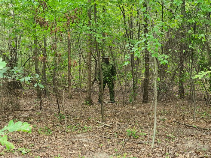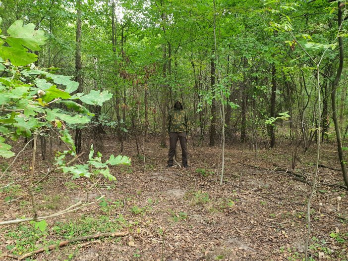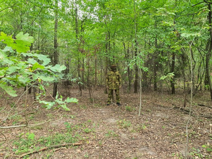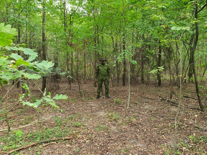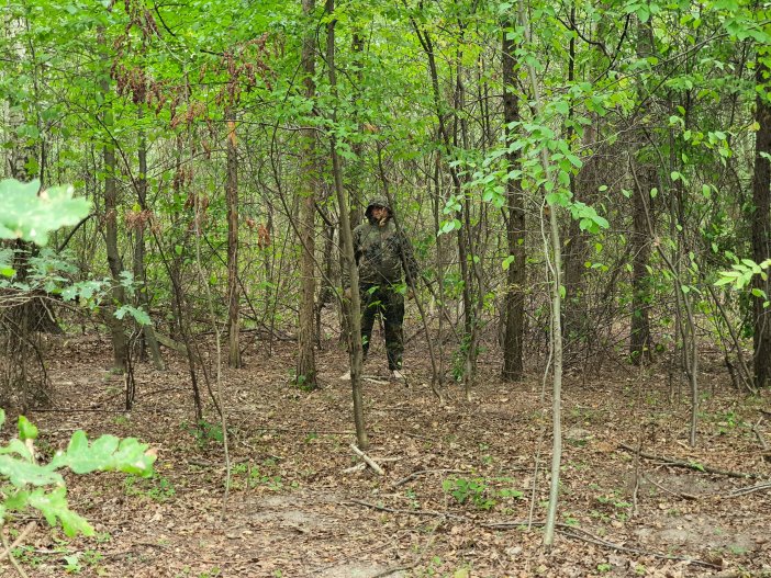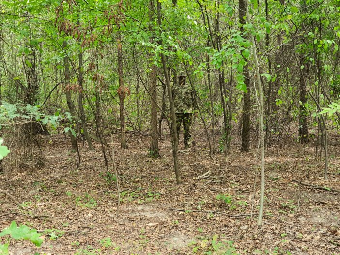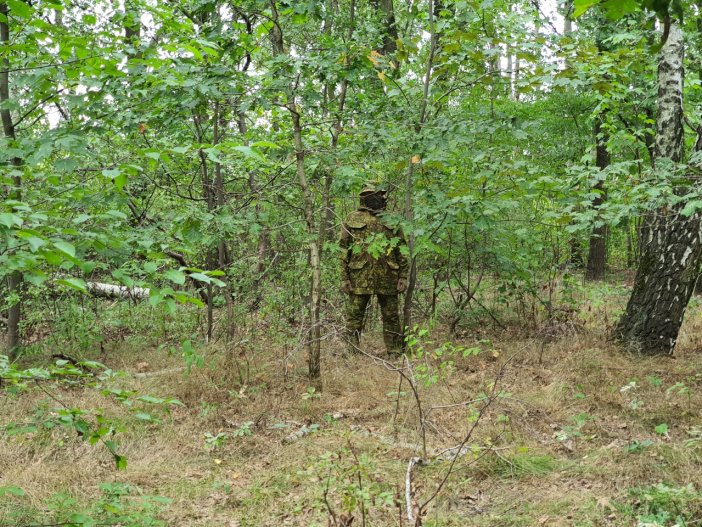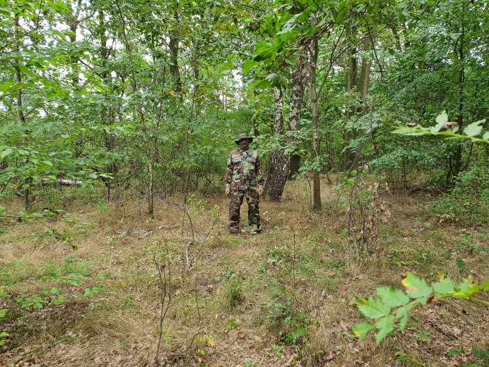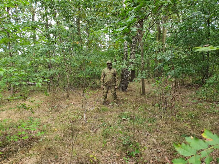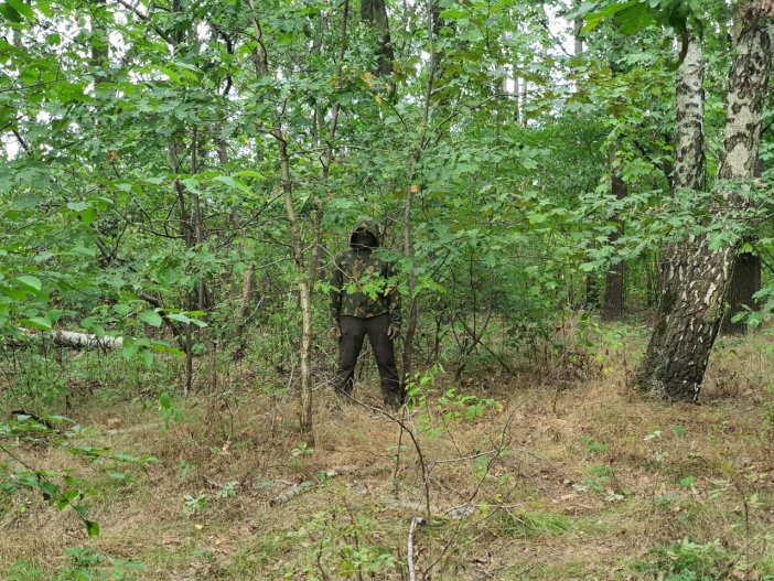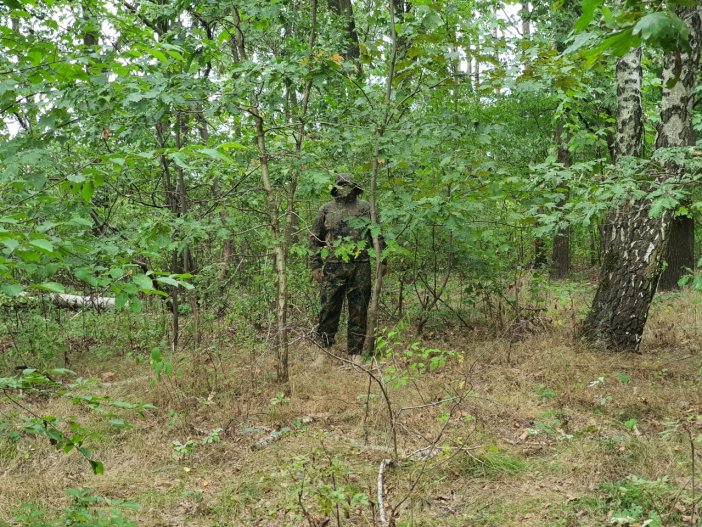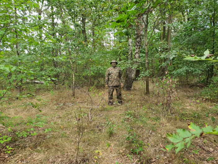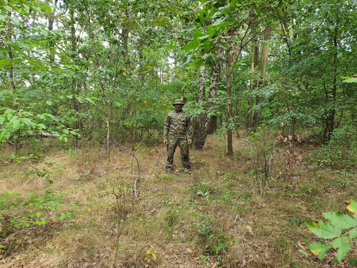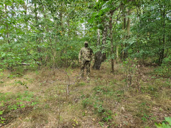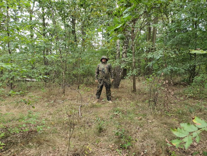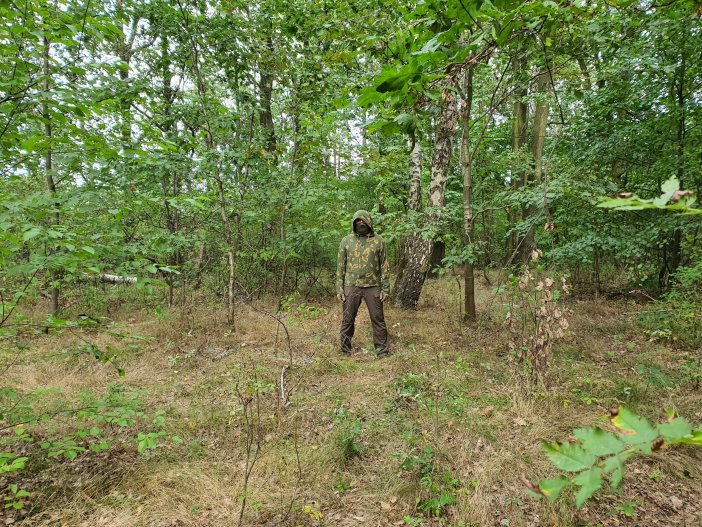 Testy zostały przeprowadzone w środku września, przy letniej pogodzie. Oświetlenie było idealne do zdjęć, z pełnym, ale wysokim zachmurzeniem dzięki któremu światło było mocne ale bezkierunkowe, niczym w studio. Żeby zapewnić “punkt zero” dający odpowiednie odniesienie do wszystkich zdjęć, zrobiliśmy też zdjęcia w ciuchach nie mających żadnych właściwości maskujących – dżinsach i czarnej kurtce.