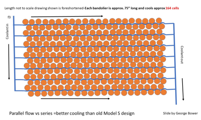 Dostrzec można też szereg małych rurek po obu stronach pakietu, do których najpewniej finalnie wpina się węże, które to transportują ciecz do chłodzenia wszystkich ogniw. Zadaje to kłam wcześniejszym doniesieniom na temat chłodzenia sprowadzającego się do płaskich płyt, jako że Tesla najwyraźniej dalej stawia na stosowane wcześniej systemy walki z temperaturą.