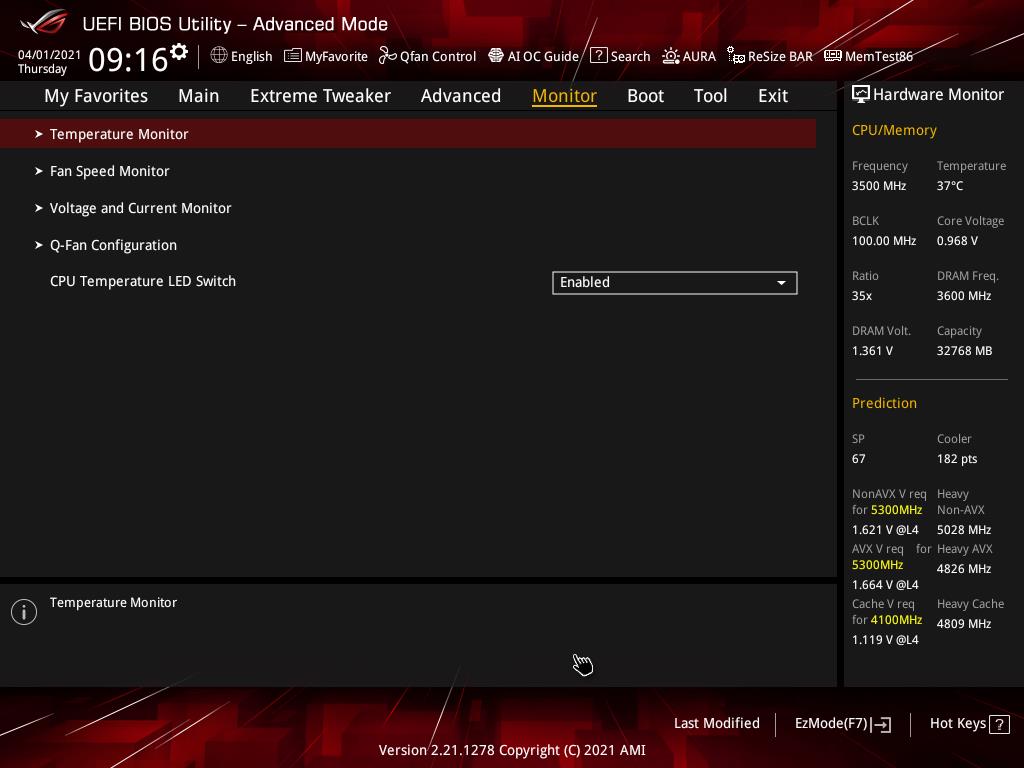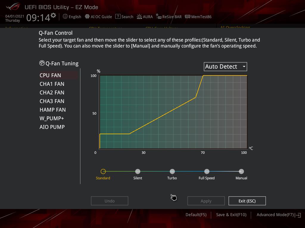 Asus udostępnia dwa tryby – Advanced oraz EZ. Ten drugie przeznaczony jest dla mniej zaawansowanych użytkowników i jest naprawdę przejrzysty. Łatwo ustawiacie w nim choćby profile XMP pamięci czy przejdziecie do zarządzania wentylatorami. Jest też osobny przycisk pozwalający włączyć Resizable BAR. Obecność takiego trybu zawsze jest sporym plusem, bowiem wiele osób nie potrafi połapać się w mnogości opcji.