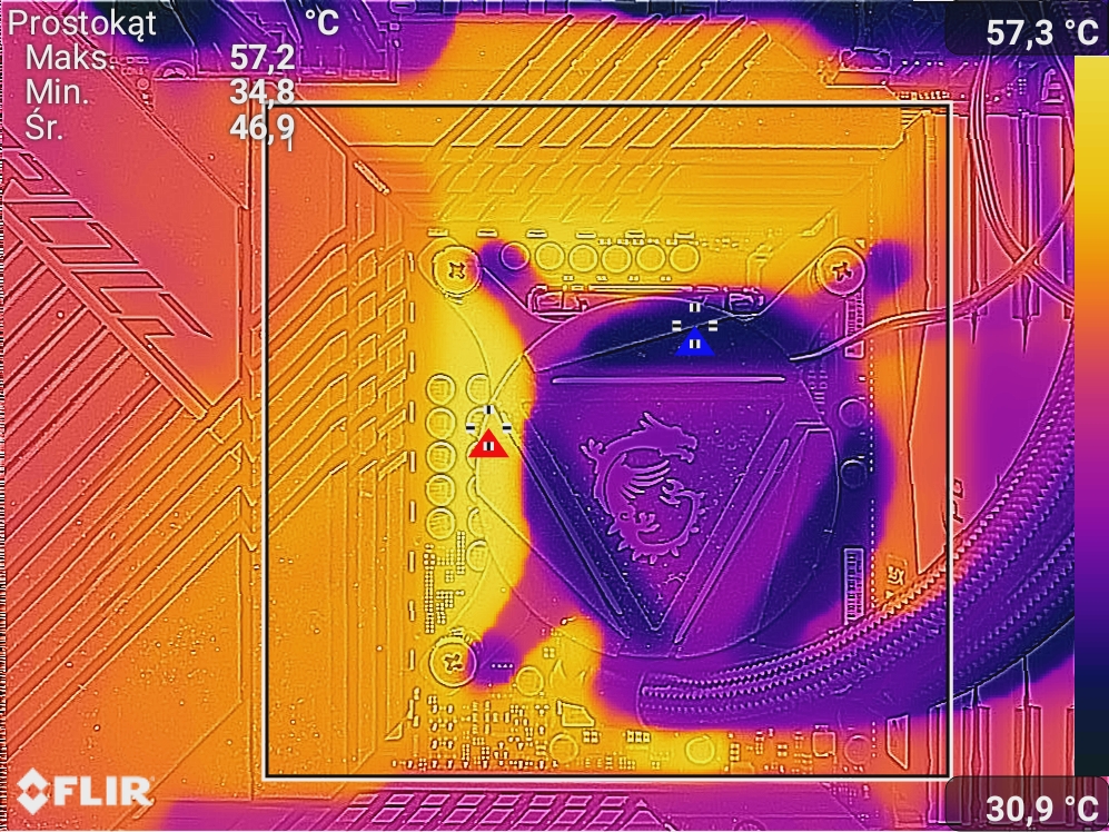 Sekcja zasilania pozostaje dosyć chłodna. Czujnik z płyty zwraca temperatury kolejno 59°C oraz 72°C, czyli podobnie do temperatur zanotowanych przy wykorzystaniu termowizji. Spore radiatory wraz z ciepłowodem zdają egzamin i nawet po mocnym podkręceniu procesora nie powinniście się martwić o sekcję zasilania. Co więcej Asus pokazał niektórym producentom, że można stworzyć odpowiednie chłodzenie mocnej sekcji zasilania, które nie potrzebuje dodatkowego wentylatora.