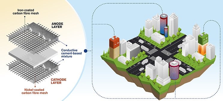 Naukowcy wpadli na pomysł zintegrowania z blokami betonu niewielką ilością krótkich włókien węglowych w celu zwiększenia przewodności i wytrzymałości na zginanie. Do mieszanki włączono również parę siatek z włókna węglowego, jedną pokrytą żelazem, która pełni rolę anody akumulatora, a drugą powłoką niklową, która pełni rolę katody. Te dwa elementy sprawiają, że blok betonu działa, jak zwyczajny akumulator i choć na ten moment daleko mu do perfekcji, wydaje się być obiecujący.