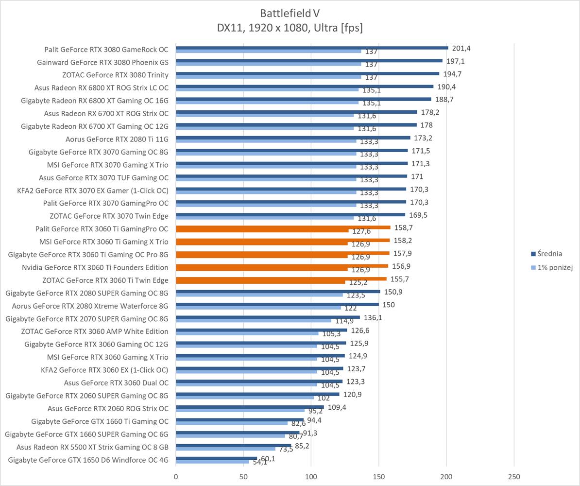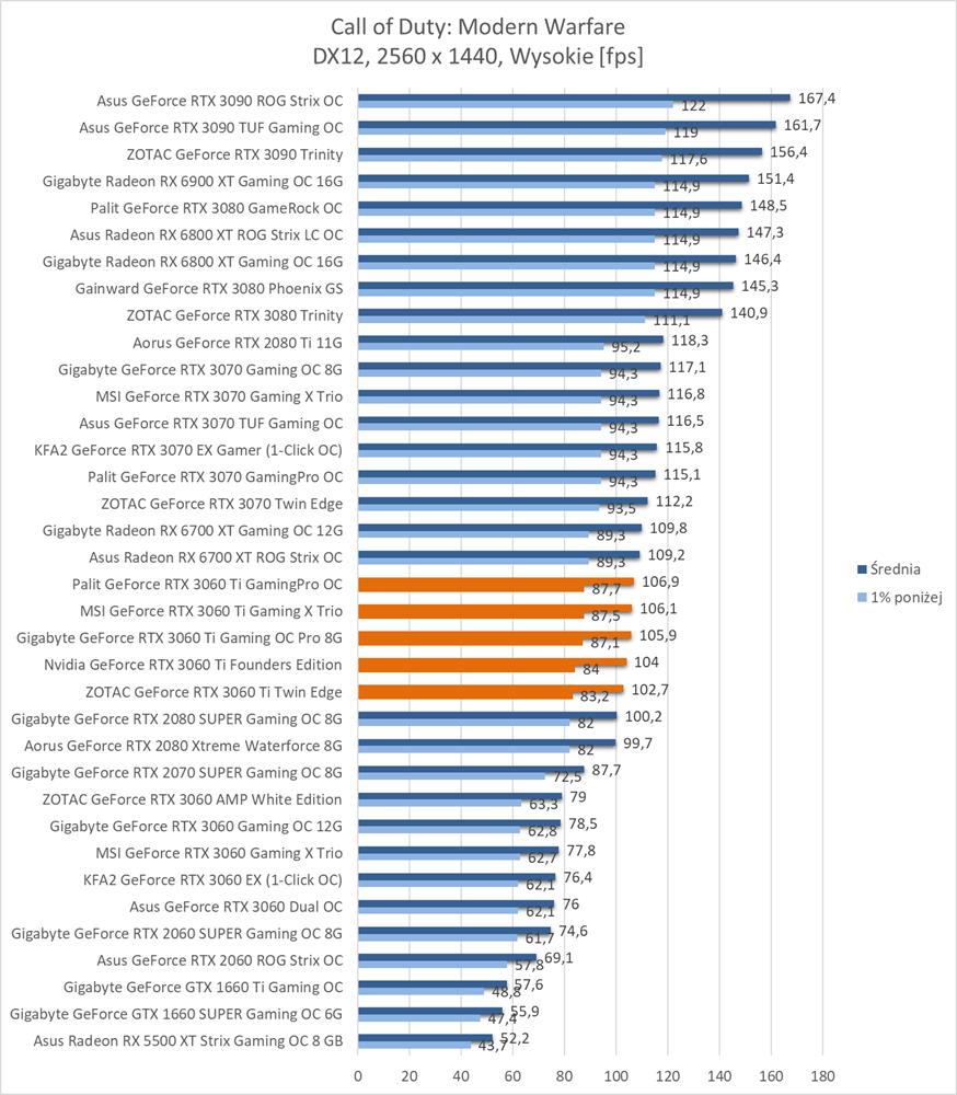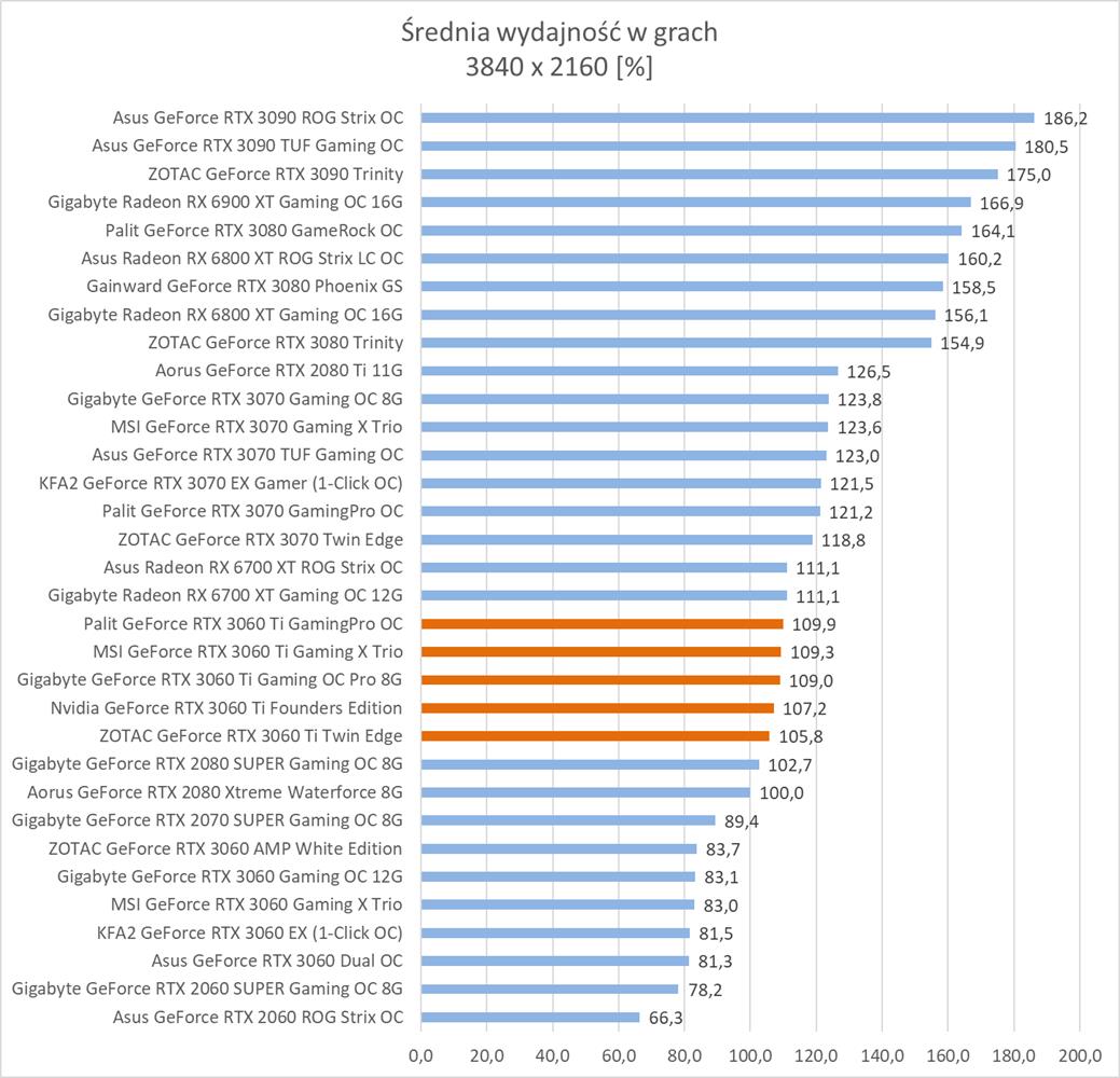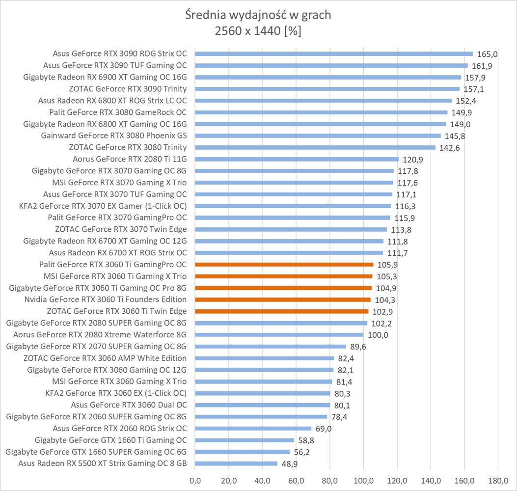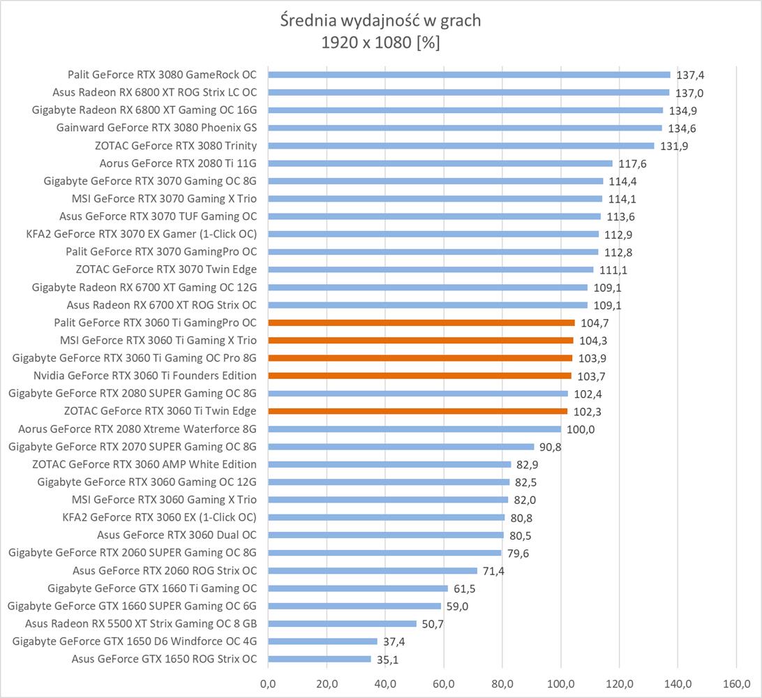 Średnia wydajność testowanych modeli GeForce RTX 3060 Ti