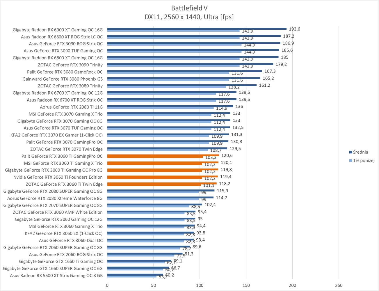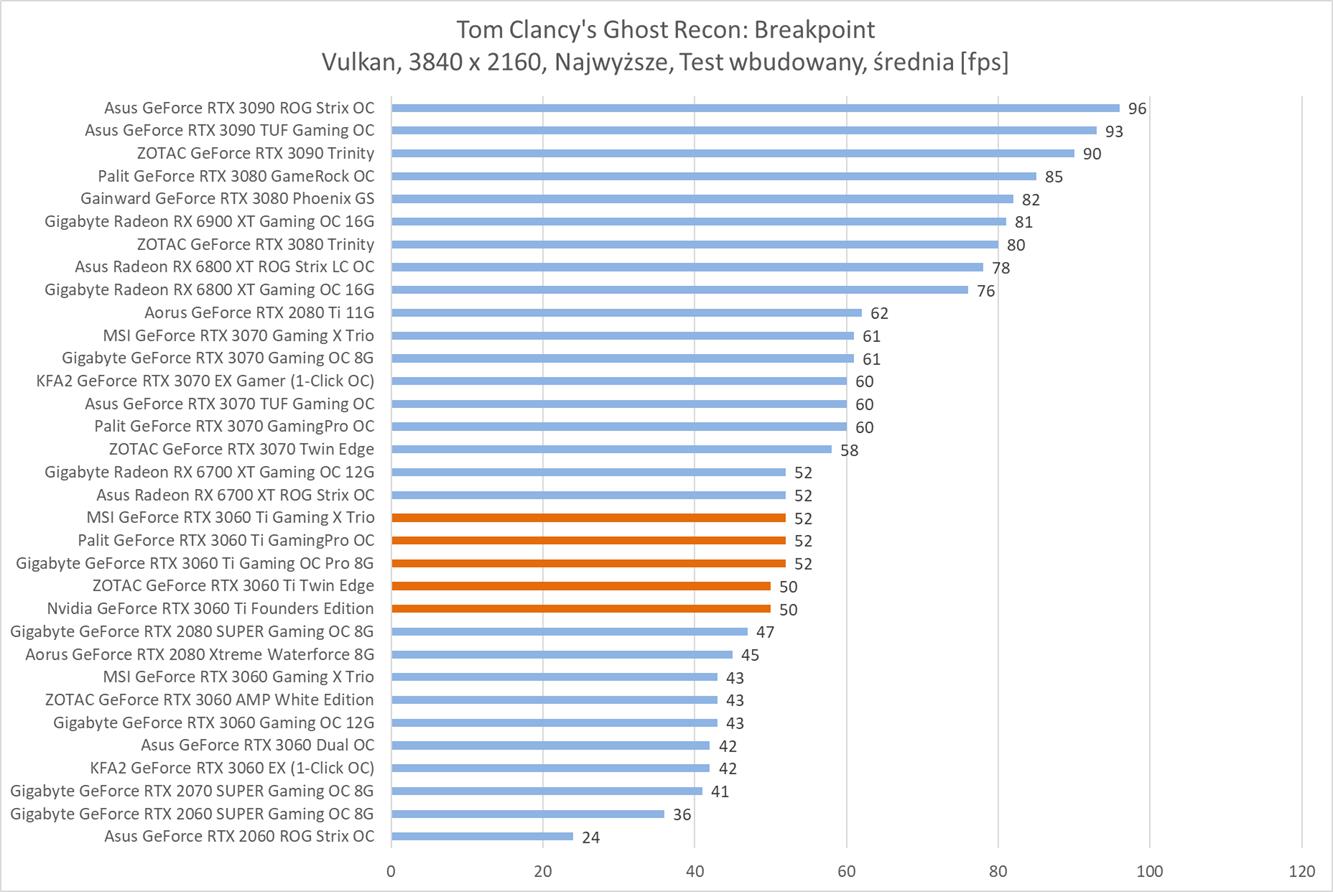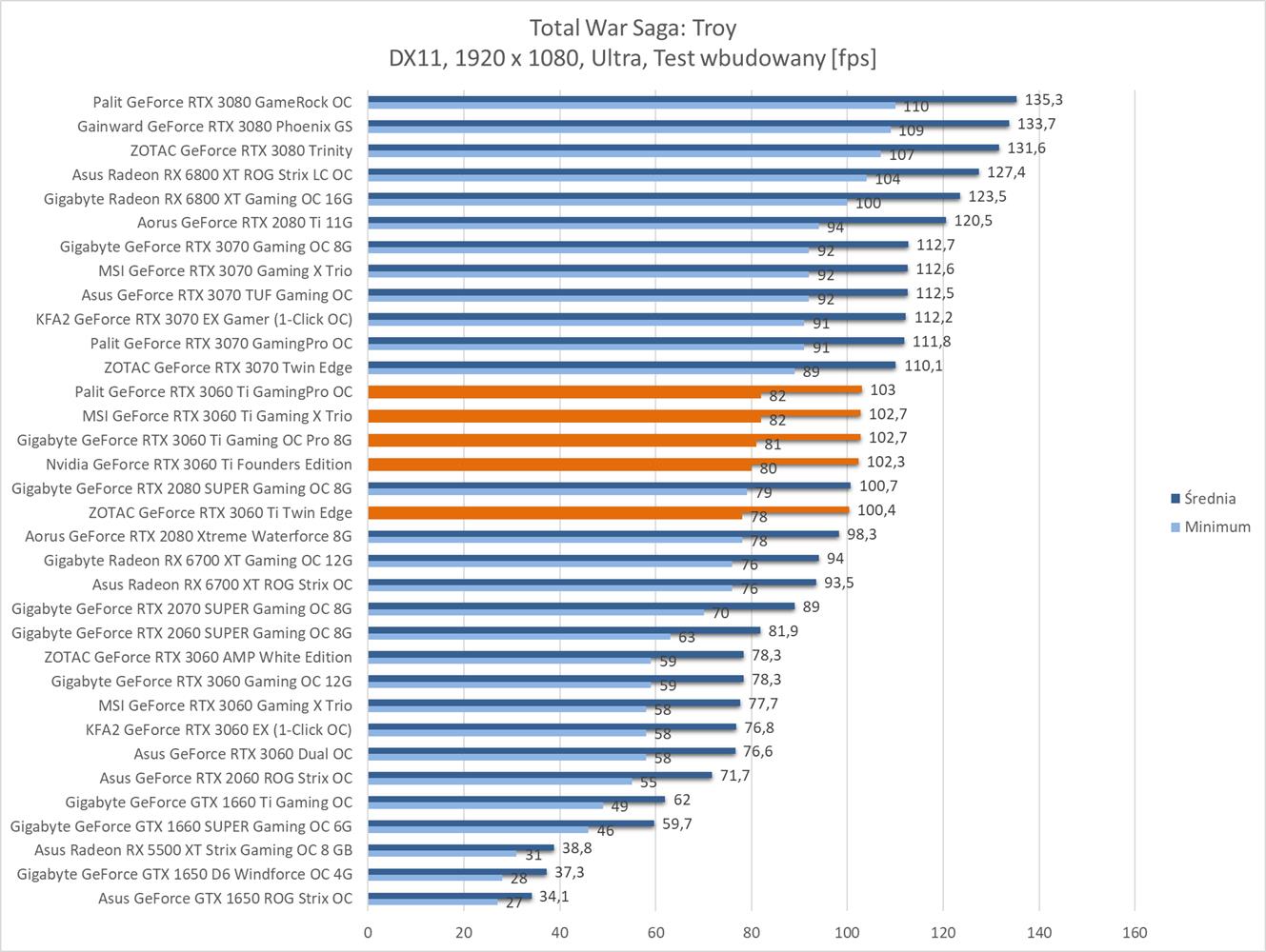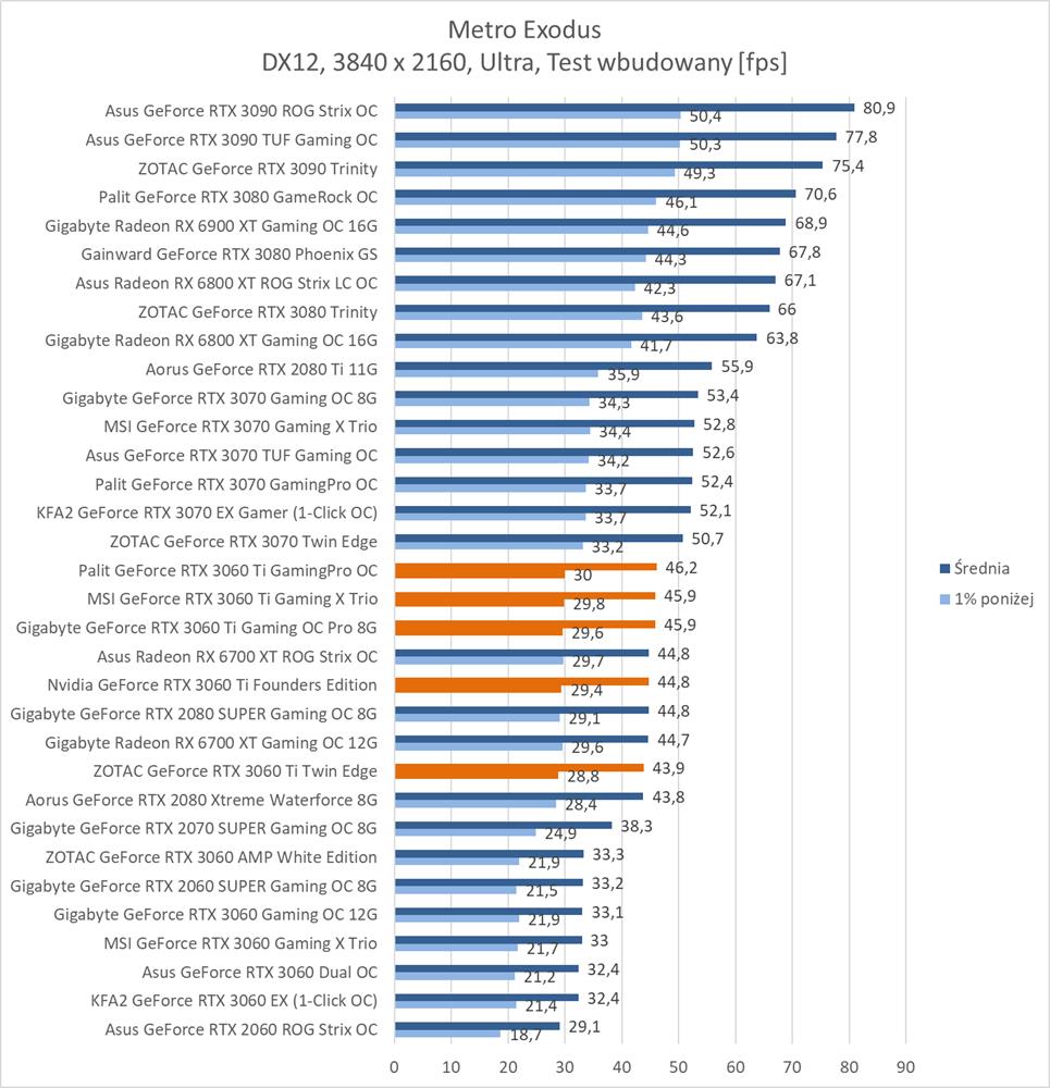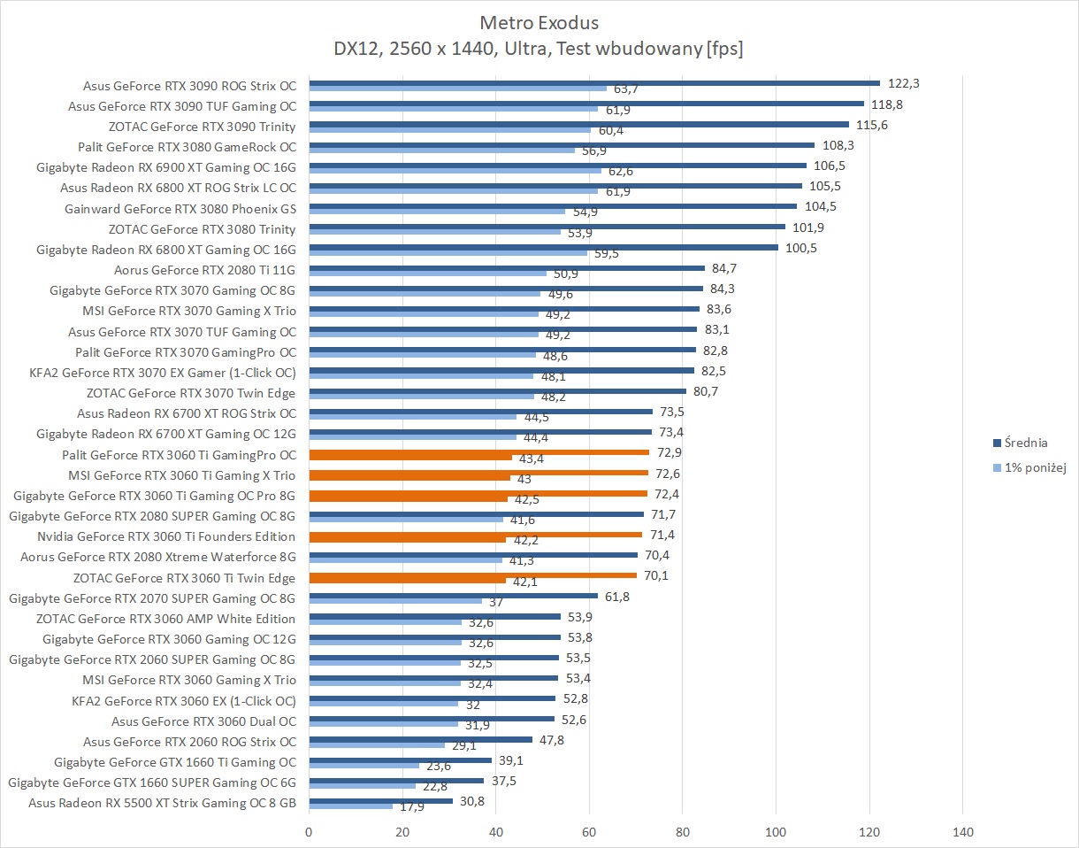 Średnia wydajność testowanych modeli GeForce RTX 3060 Ti