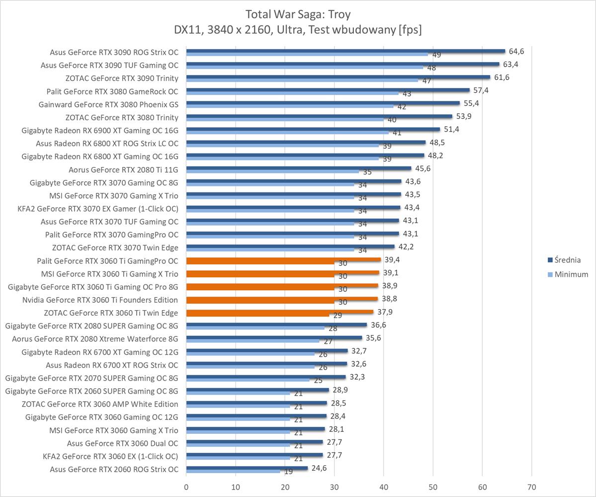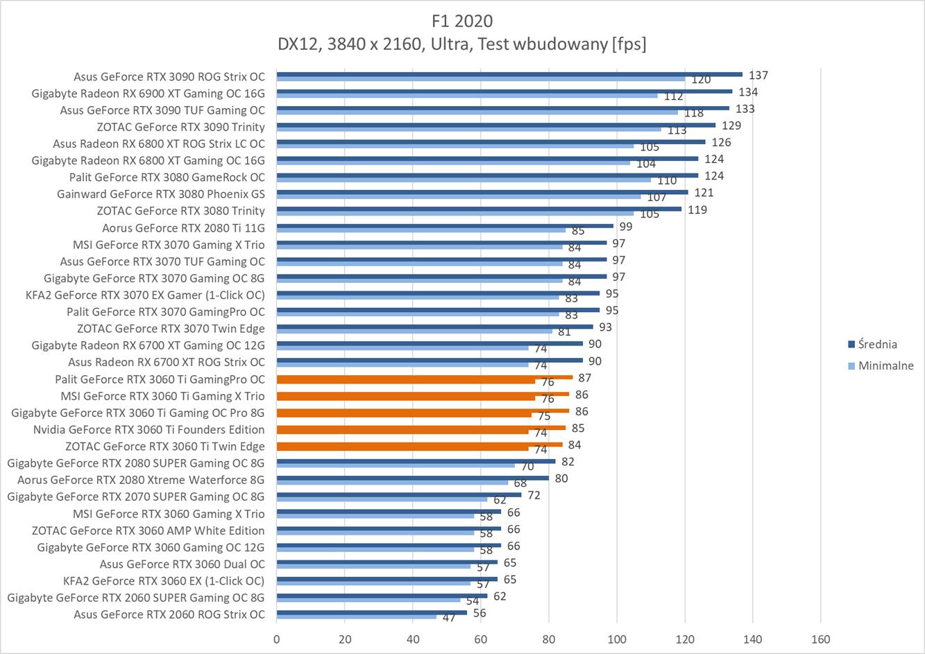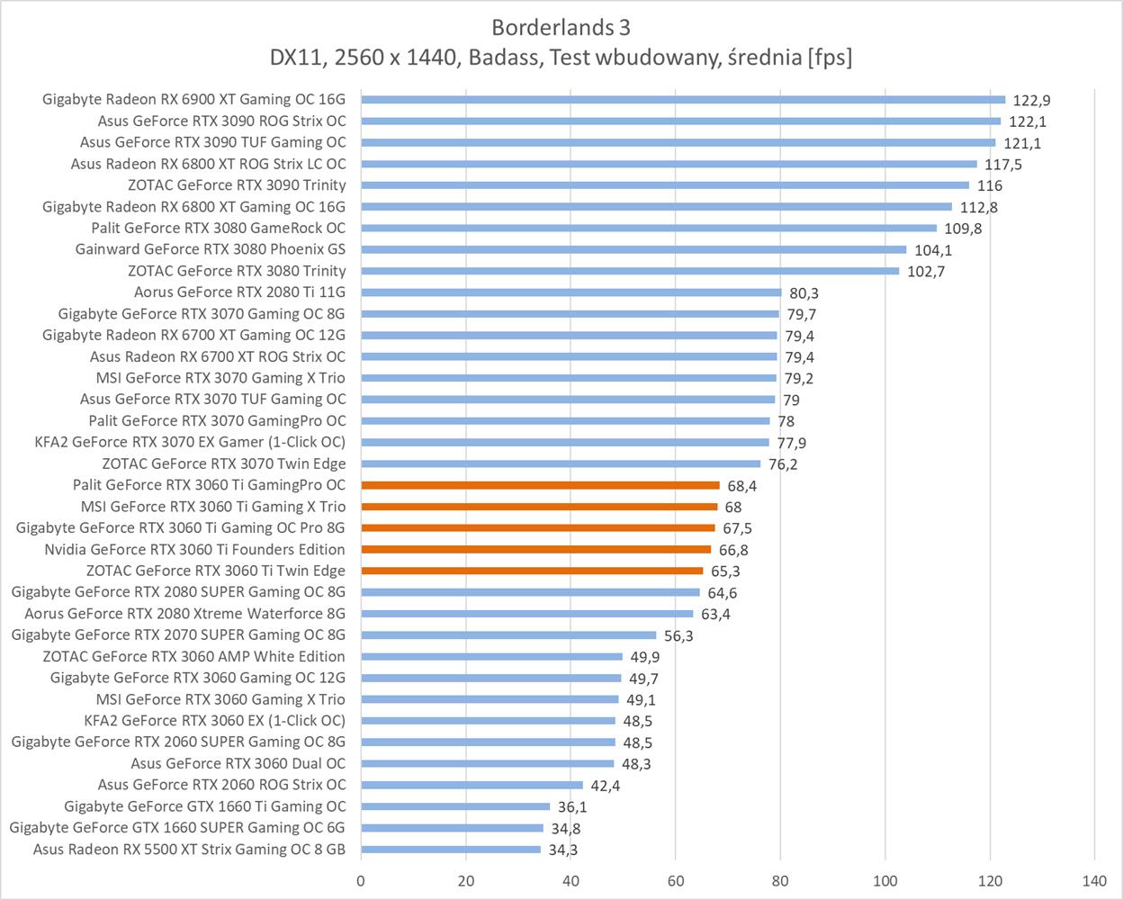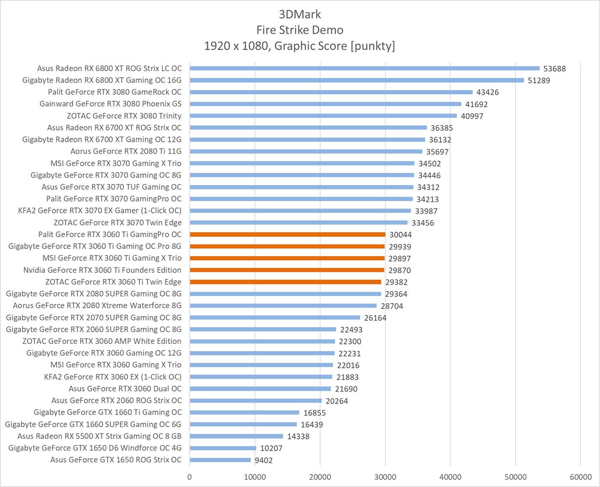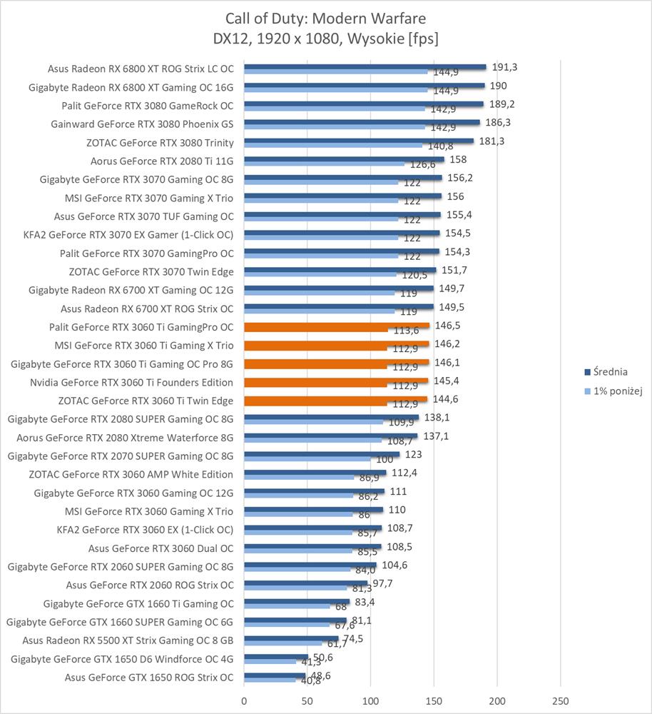 Średnia wydajność testowanych modeli GeForce RTX 3060 Ti