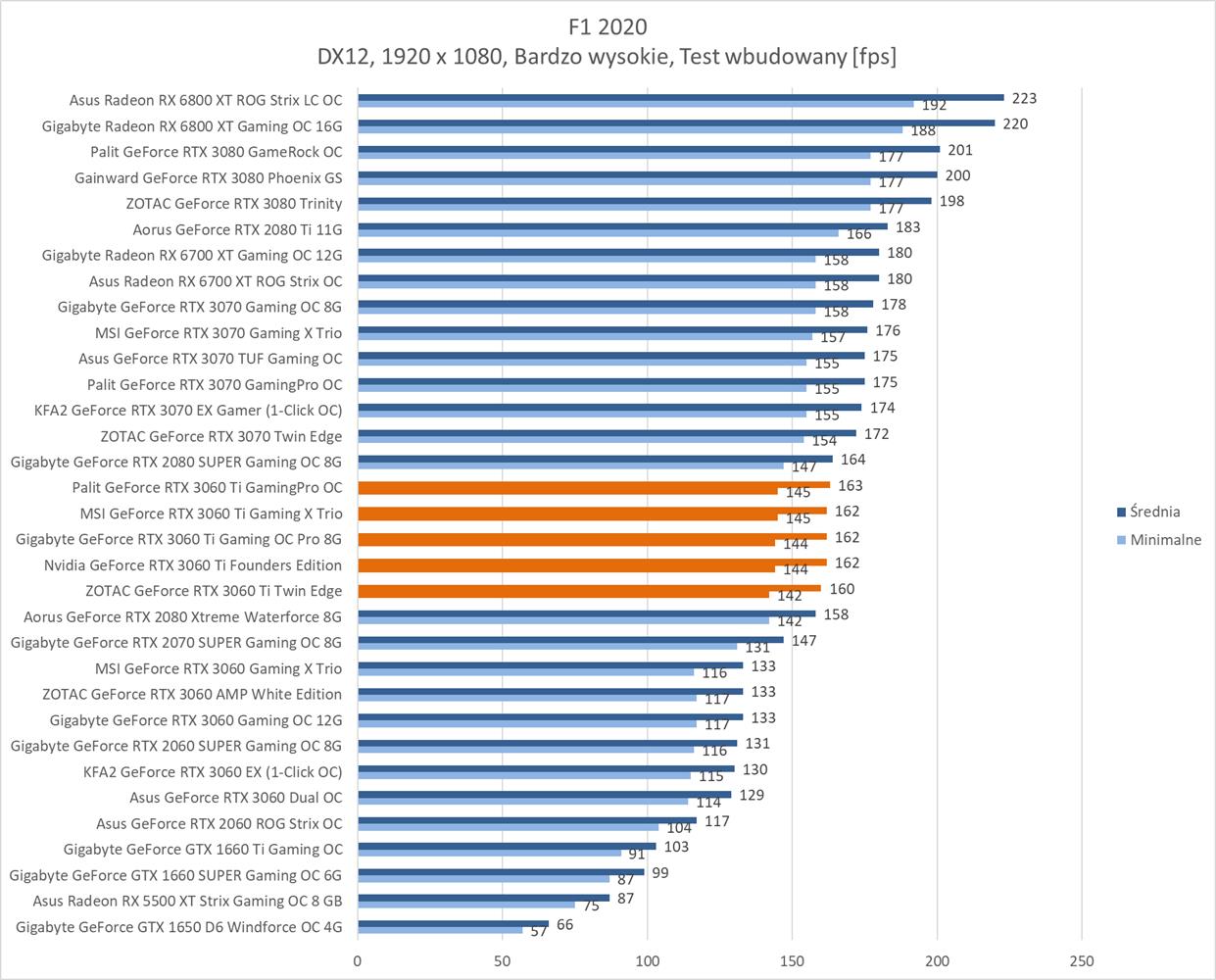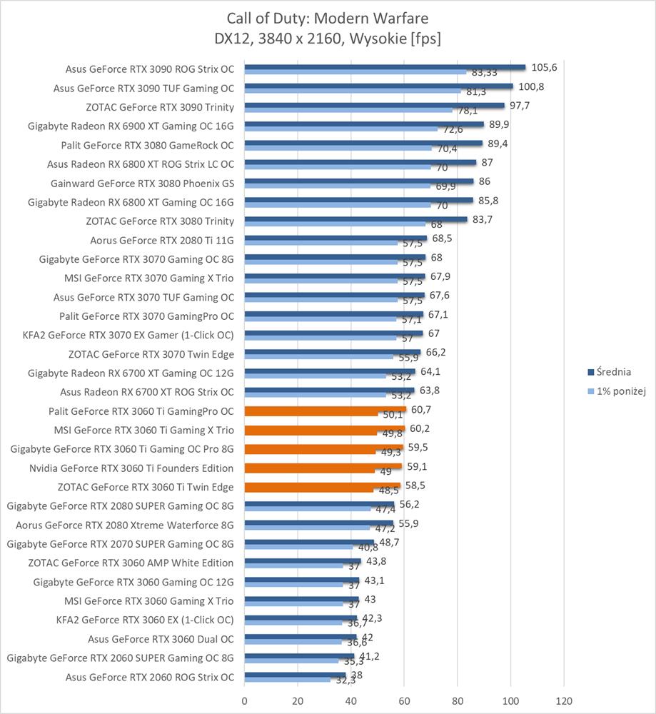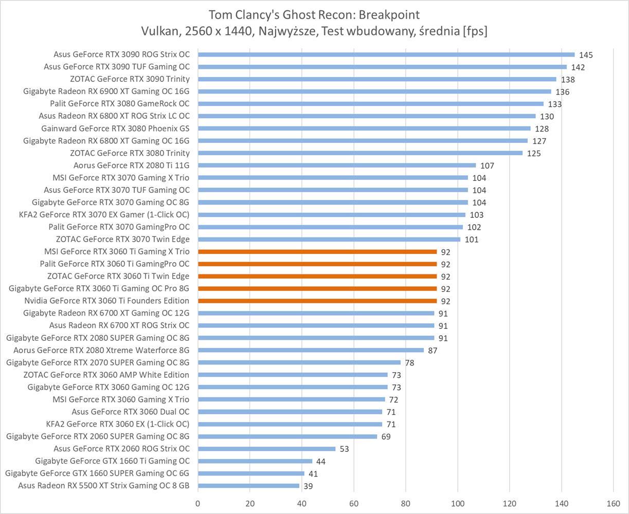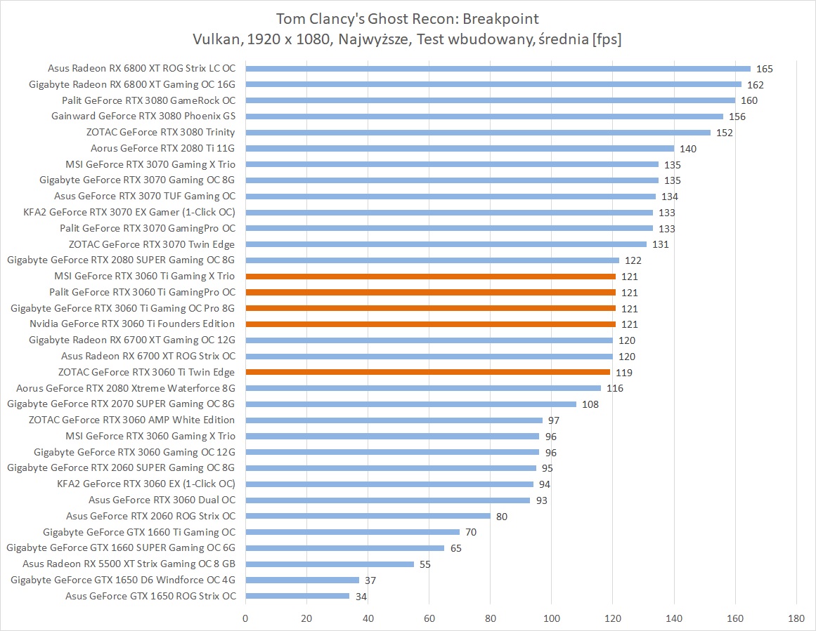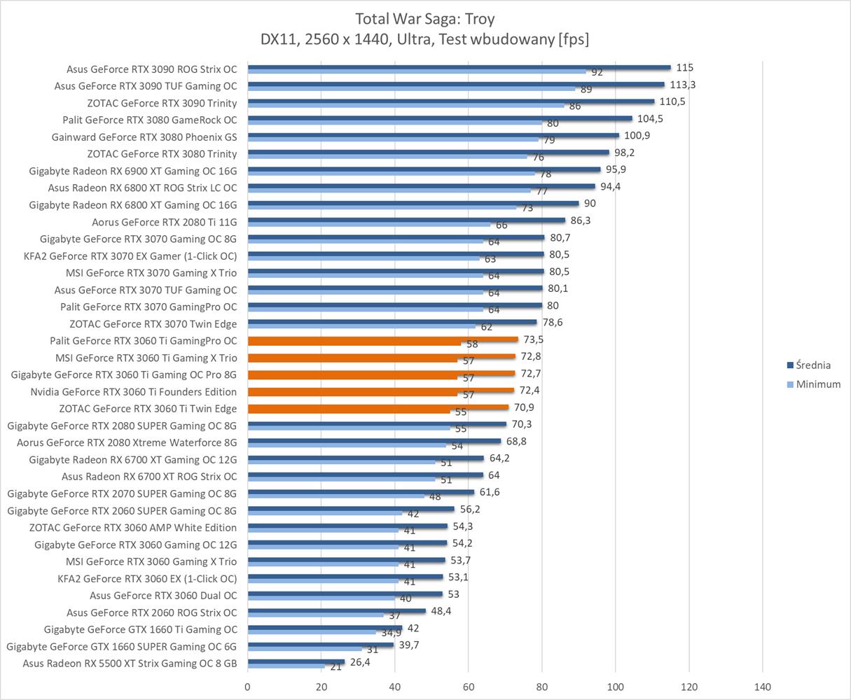 Średnia wydajność testowanych modeli GeForce RTX 3060 Ti