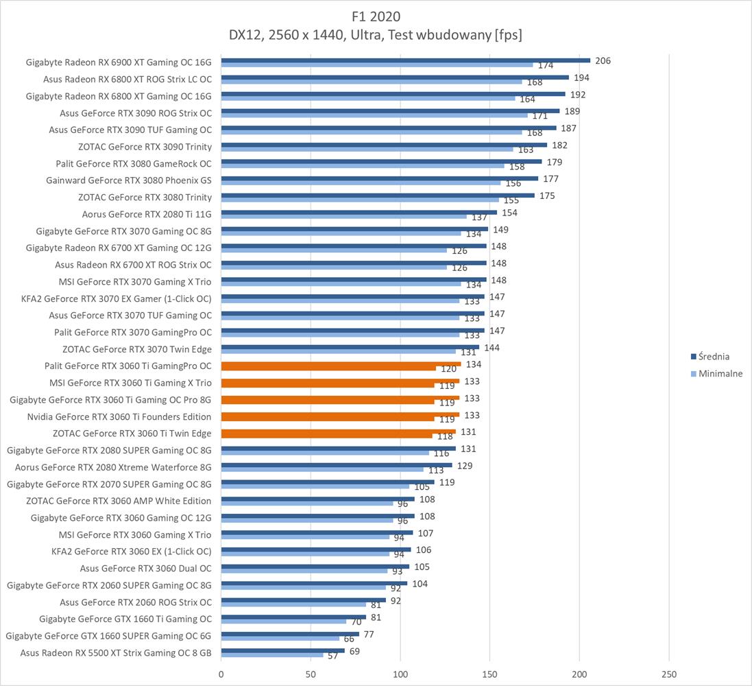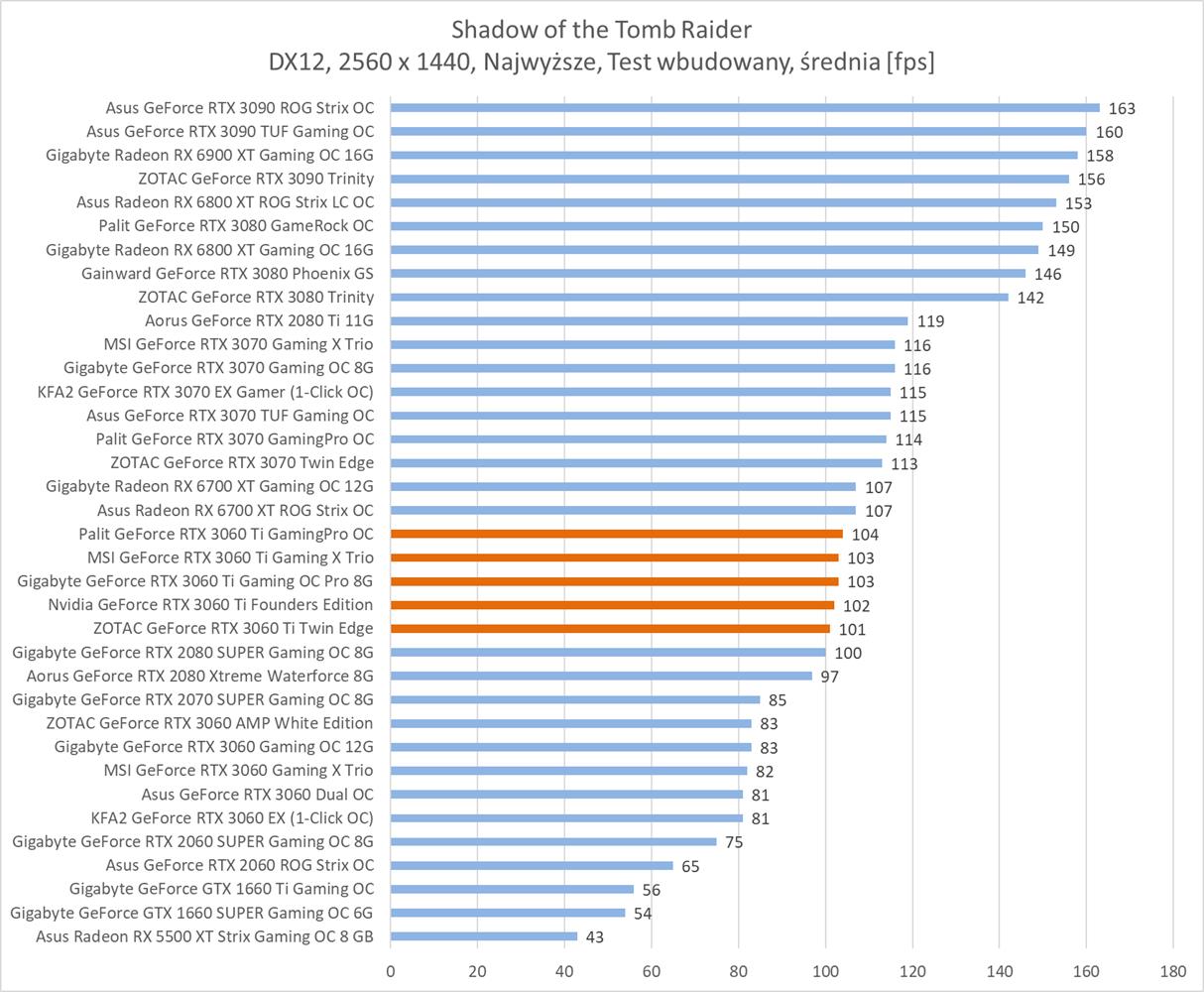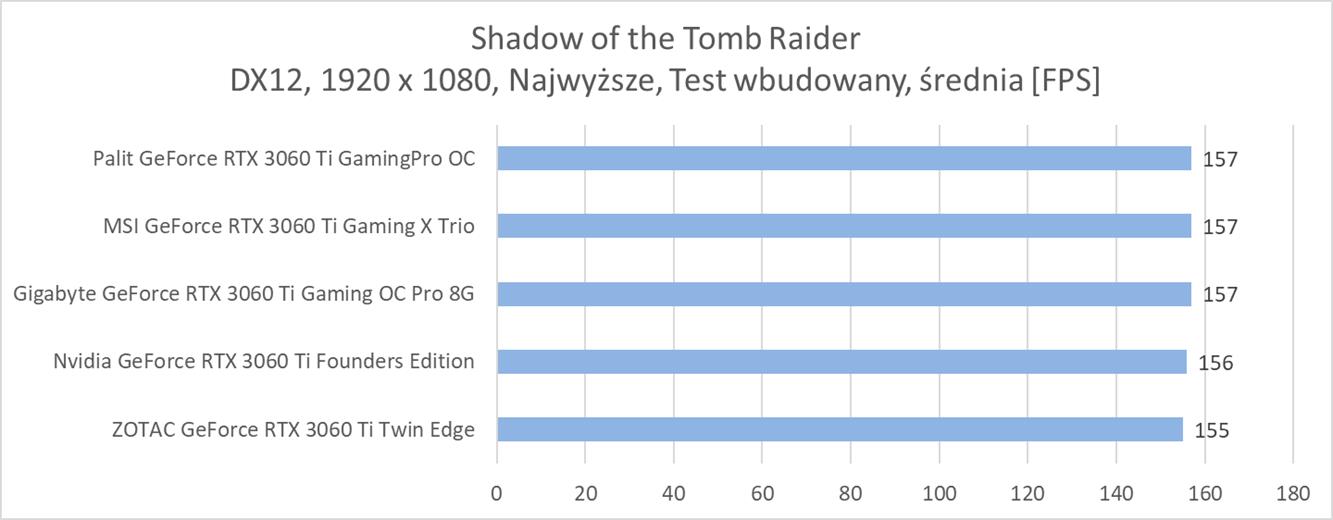 Zgodnie z oczekiwaniami w najmniejszej rozdzielczości nie ma żadnych problemów z uzyskaniem powyżej 60 fps. W wielu tytułach możecie też liczyć na powyżej 100 fps. Testowane grafiki wydajności są powyżej podkręconego, choć czasami zawodzi najsłabszy model RTX 3060 Ti, czyli ZOTAC GeForce RTX 3060 Ti Twin Edge. Potrafi on czasami wypaść gorzej od kręconego RTX 2080, więc tutaj zdecydowanie odstaje on od pozostałych grafik.
