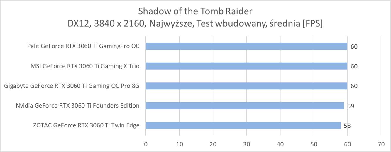 SPośród testowanych modeli najlepiej wypada Palit GeForce RTX 3060 Ti GamingPro OC. Karta jest na szczycie we wszystkich rozdzielczościach, choć jej przewaga nad drugim MSI GeForce RTX 3060 Ti Gaming X Trio oraz trzecim Gigabyte GeForce RTX 3060 Ti Gaming OC Pro 8G nie jest wcale duża. Na drugim końcu są modele Nvidia GeForce RTX 3060 Ti Founders Edition oraz ZOTAC GeForce RTX 3060 Ti Twin Edge. Nvidia w rozdzielczościach 1920 x 1080 oraz 2560 x 1400 jeszcze tak mocno nie odstaje od konkurencji, dopiero w 4K radzi sobie trochę gorzej. ZOTAC jest za to słabszy od Nvidii oraz we wszystkich rozdzielczościach odstaje mocniej od konkurencji. Tutaj zdecydowanie zawiodłem się na tej grafice – kto by się spodziewał wydajności słabszej od Founders Edition?