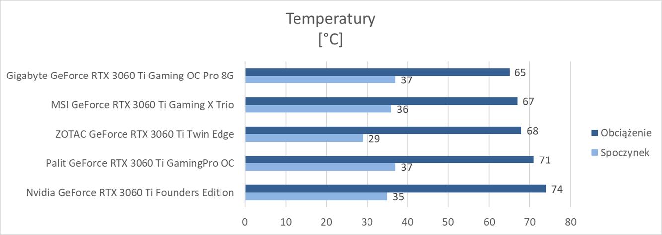 W spoczynku prawie wszystkie karty notują podobne wyniki. Wyjątkiem jest tutaj ZOTAC, który nie ma trybu półpasywnego co pozwoliło na znaczne zbicie wyników. Pod obciążeniem najzimniejszym modelem jest Gigabyte GeForce RTX 3060 Ti Gaming OC Pro 8G z BIOSem OC. Zaraz za nim jest ZOTAC. Po drugiej stronie znajduje się Nvidia GeForce RTX 3060 Ti Founders Edition z temperaturami powyżej 70°C. Ważne jest tutaj, że obciążenia dokonałem poprzez odpalenie FurMarka w rozdzielczości 3840 x 2160 px.