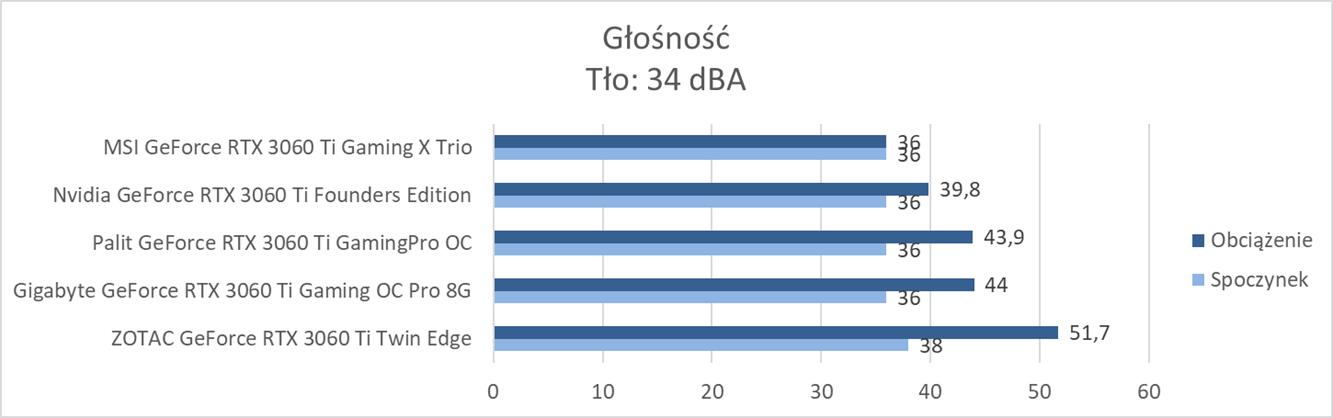 W spoczynku dzięki trybowi półpasywnemu nie usłyszycie prawie wszystkich grafik. Wyjątkiem jest ZOTAC, który jest cichy, ale nie ma tutaj ideału. Pod względem kultury pracy najlepiej wypada MSI GeForce RTX 3060 Ti Gaming X Trio, którego nie usłyszycie nawet przy mocnym obciążeniu. Zaraz za nim jest Gigabyte w trybie Silent oraz Nvidia. Karta Palita jest również stosunkowo cicha, ale głośniejsza od konkurencji. GIgabyte w trybie OC może być już lekko słyszalny. Kompletnym szaleństwem jest za to ZOTAC GeForce RTX 3060 Ti Twin Edge, który działa dosłownie jak odkurzacz. Jest to nie do przyjęcia przy normalnej pracy i zdecydowanie może przeszkadzać. Tutaj uważam, że krzywa obrotów wentylatorów powinna dopuszczać większe temperatury przy lepszej kulturze pracy.