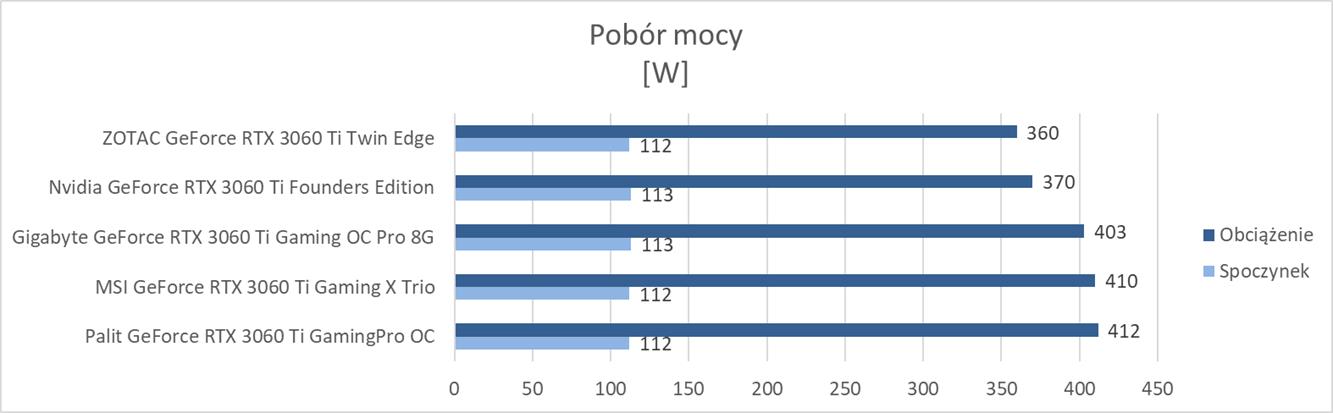 Dwa niepodkręcone modele mają zdecydowanie mniejszy pobór mocy od konkurencji. Pozostałe Modele notują o ok. 40 W większy pobór mocy pod obciążeniem. Jest on też nieznacznie mniejszy od RTX 3070, więc tutaj dobry zasilacz na pewno będzie przydatny.