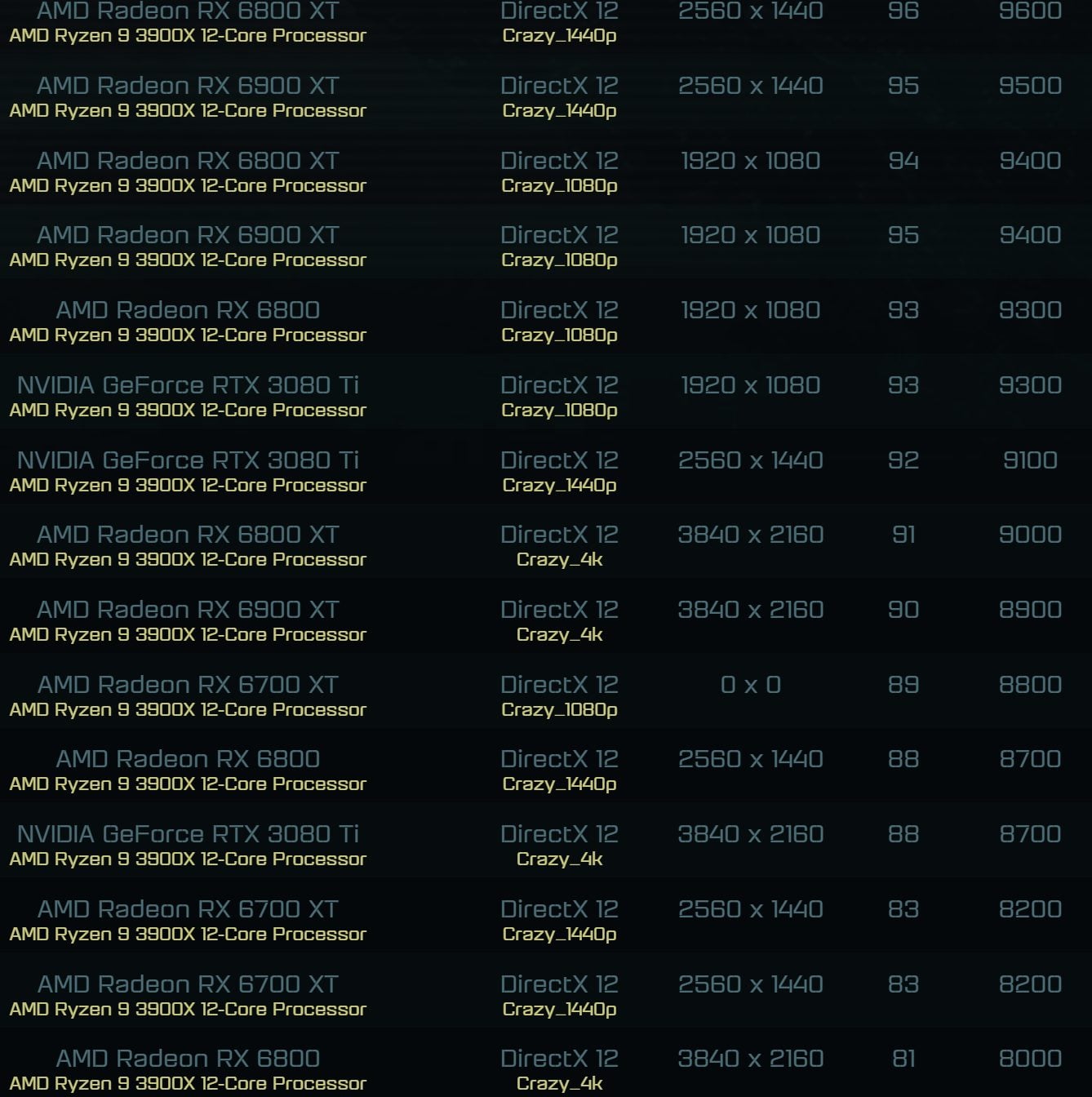 W tej grze wspierającej API DirectX12 GeForce RTX 3080 Ti został przetestowany na ustawieniach graficznych “Crazy” w rozdzielczości 4K, 1440p oraz Full HD, czyli 1080p, zdobywając kolejno 9300, 9100 i 8700 punktów. Test miał miejsce w połączeniu z procesorem Ryzen 9 3900XT i choć mogłoby się wydawać, że wiele nam to mówi, to brak szczegółów na temat zegarów i testów innych kart na tej samej platformie sprzętowej sprawia, że są to puste wyniki.