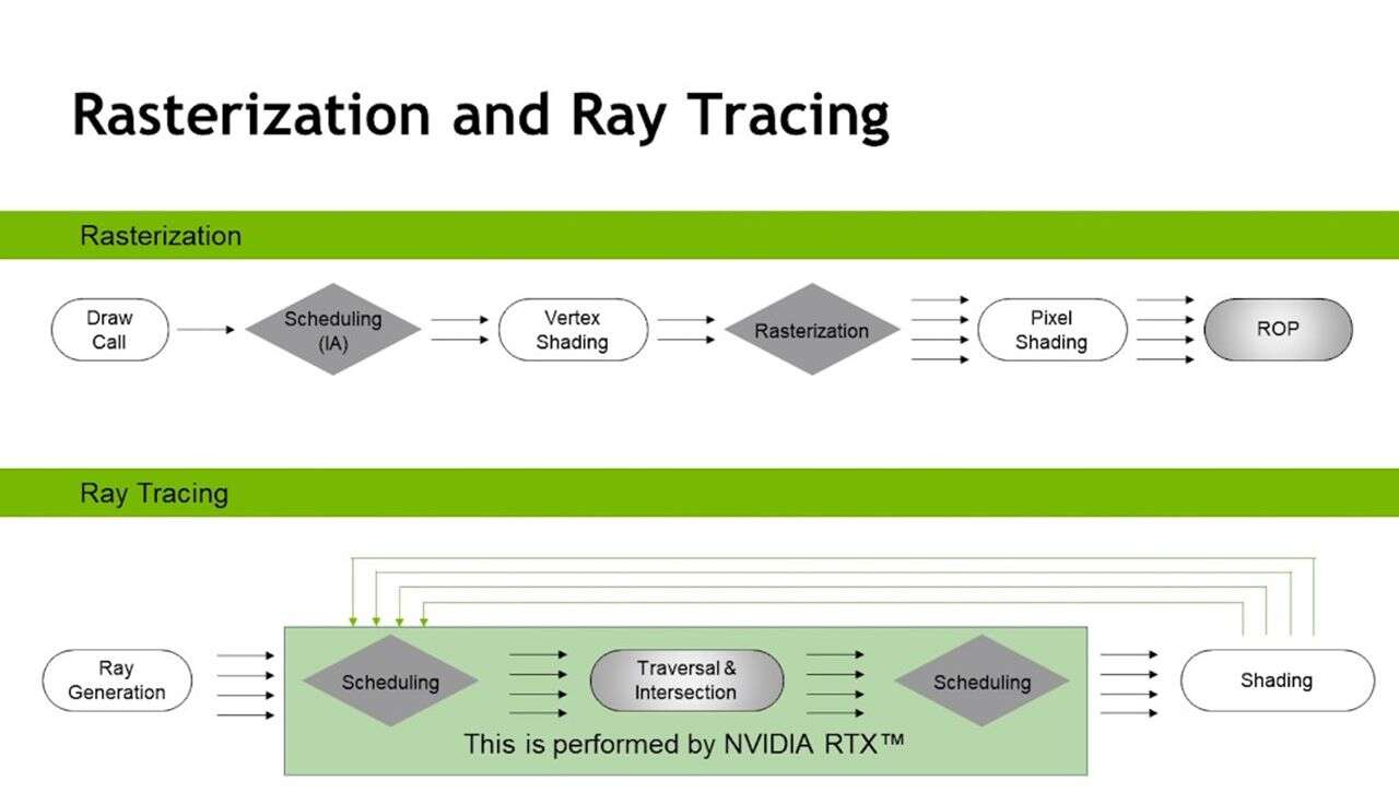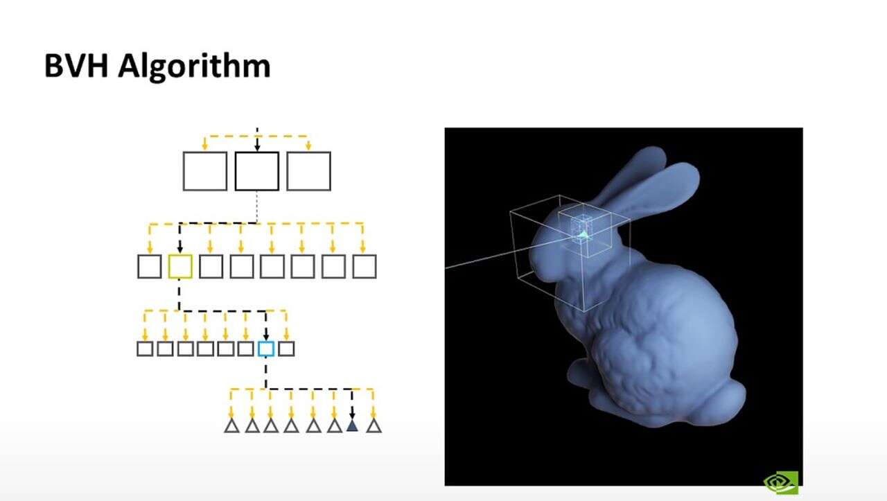 W przypadku podejścia firmy NVIDIA do tej technologii postawiono przed rdzeniem graficznym szereg nowych zadań. Pierwsze sprowadza się do określenia tego, które dokładnie prymitywy (elementy składowe renderowanych obiektów – postaci, przedmiotów etc.) w danej scenie wejdą w interakcje z promieniami świetlnymi. Następnie do gry wchodzi oparta na strukturze drzewa struktura przyspieszenia śledzenia promieni nazywana Bounding Volume Hierarchy, która oblicza miejsca przecięcia promieni i wspomnianych prymitywów, przy czym zmniejsza ich liczbę, odrzucając te niepotrzebne, które nic nie wniosą do finalnego efektu.