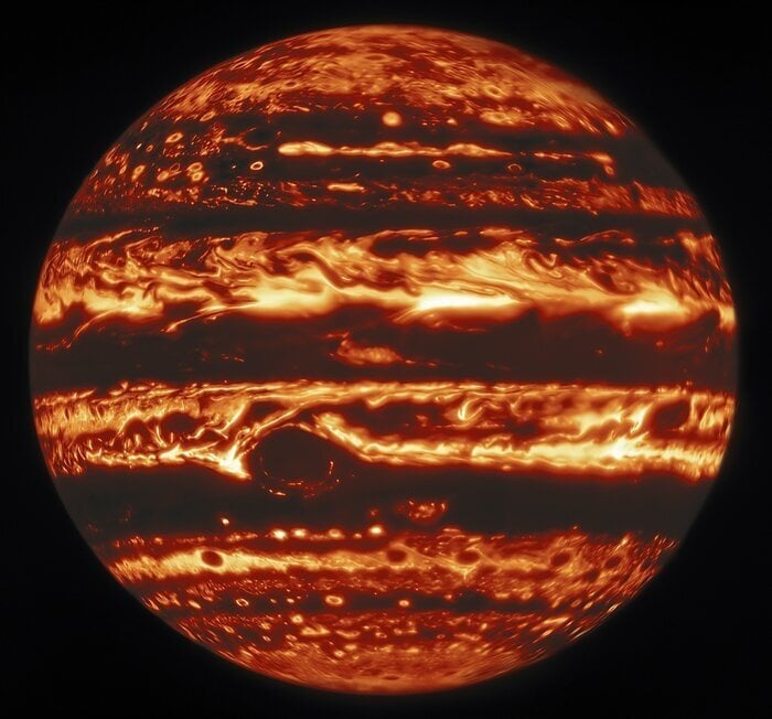 Widok “normalnego” Jowisza jest nam dobrze znany, lecz astronomowie postanowili ukazać go również w odmiennych perspektywach. Np. w podczerwieni, tam, gdzie znajdują się cieplejsze obszary tej planety, możemy zobaczyć jasne, żółte barwy. Z kolei chłodniejsze regiony są ciemniejsze i bliżej im do czerwonego koloru.