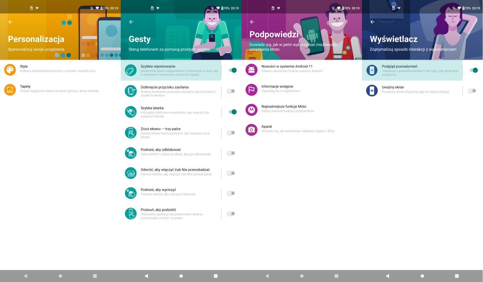 Interfejs w Moto g100 to kontynuacja tego, co Motorola oferuje od jakiegoś czasu w swoich smartfonach. Dostajemy praktycznie czystego Androida z paroma dodatkami. Możemy zmienić niektóre kolory interfejsu, kształt ikon i czcionki. Do tego aplikacja Moto, czyli personalizacyjny hub smartfonu. To tu znajdziemy wszystkie opcje wizualne. Tutaj mamy też dostęp do gestów Moto, czyli szeregu skrótów ułatwiających korzystanie z Moto g100. Takich jak łatwy zrzut ekranu, czy włączanie latarki poprzez obrócenie nadgarstka ze smartfonem. Motorola zawsze podkreśla, że Gesty Moto są bardzo chwalone przez użytkowników urządzeń marki i w zasadzie ciężko jest się temu dziwić.