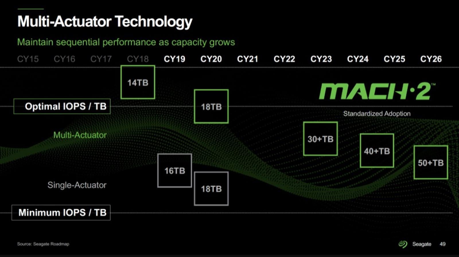 Chociaż Seagate Mach.2 Exos 2X14 pobiera o 1.5W więcej mocy podczas pracy pod obciążeniem (13.5 W), to klienci mogą zrzucić tę wartość do zalecanych 12 W, licząc się z utratą do 10 procent wydajności w losowym odczycie. Wszystko więc wygląda fajnie, obiecująco oraz interesująco, co potwierdza plan Seagate na stworzenie ponad 50 TB dysków tej klasy do 2026 roku, ale trudno powiedzieć, czy z modeli pokroju Seagate Mach.2 Exos 2X14 skorzystamy kiedykolwiek w swoich komputerach.