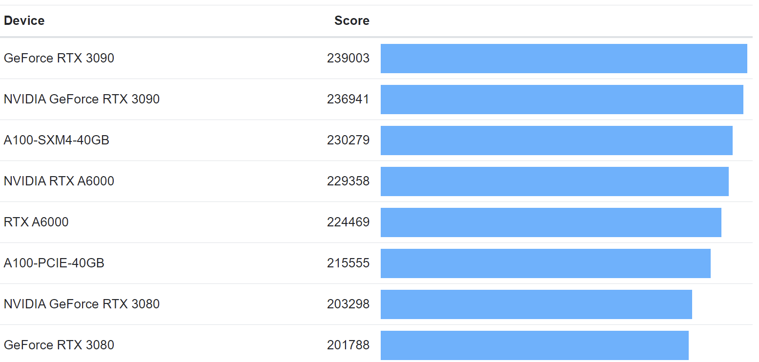 W takim zestawie GeForce RTX 3080 Ti wykazał się wydajnością na poziomie flagowej karty GeForce RTX 3090, zgarniając 238603 punktów w teście CUDA. W porównaniu do oficjalnych wyników wydajności RTX 3090 ta nieogłoszona jeszcze karta uplasowała się między dwoma wynikami.
