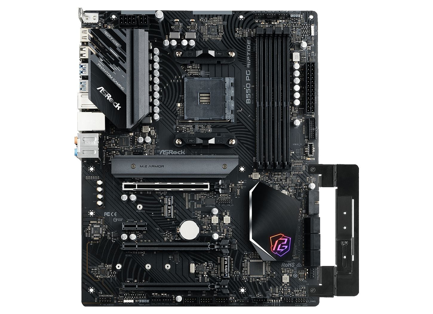Płyty główne ASRock PG Riptide X570S i B550 są częścią całej rodziny Phantom Gaming, a więc są skierowane bezpośrednio do graczy, choć to ten pierwszy chipset jest dziś naszym głównym bohaterem. To bowiem ulepszony flagowy X570 od AMD, który porzucił potrzebę aktywnego chłodzenia, uwalniając chętnych na najbardziej obiecujące płyty AMD od problematycznego często wentylatorka. Teraz za chłodzenie chipsetu w PG Riptide X570S odpowiada po prostu skromny ozdobny blok w formie pasywnego chłodzenia z podświetleniem.