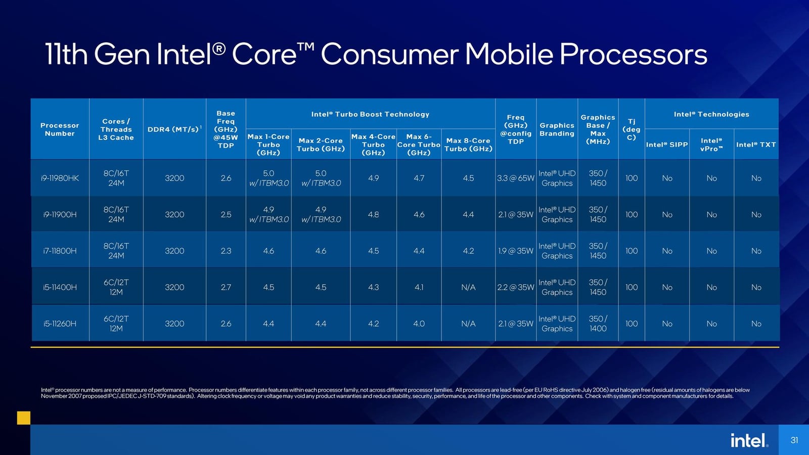 Jeśli z kolei idzie o to, co najważniejsze, czyli specyfikacji, to już wcześniej wiedzieliśmy wszystko o tych łącznie pięciu mobilnych procesorach. Nowy skład wieńczy nowy flagowy procesor mobilny w postaci odblokowanego Intel Core i9-11980HK, który to już po montażu w topowych laptopach będzie w stanie jako jedyny podkręcać swoje dwa rdzenie aż do 5 GHz.