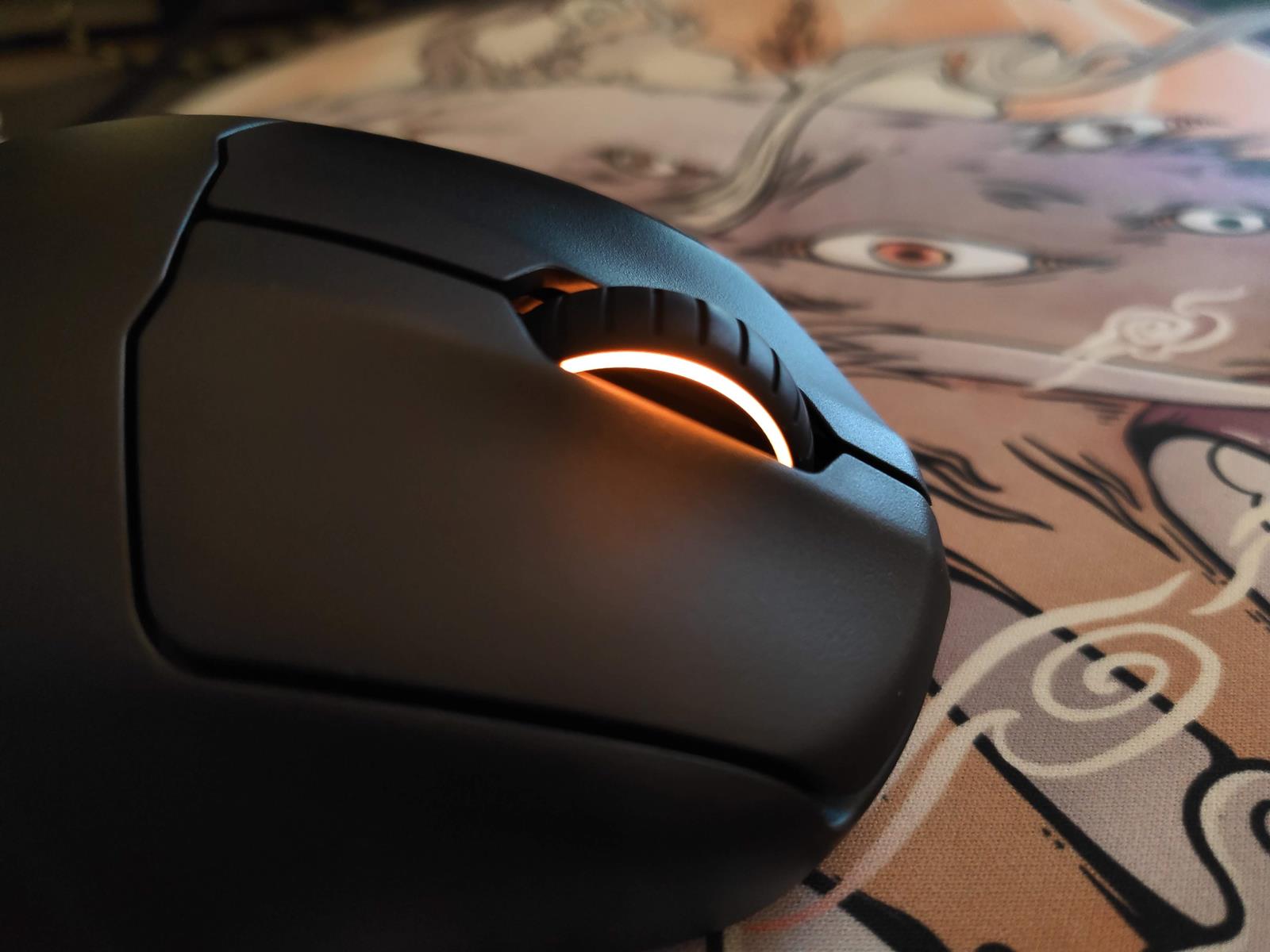 Patrząc na Prime Wireless, nie sposób nie dostrzec, że Steelseries nie miał zamiaru tworzyć myszki, która miała przyciągać wzrok. Wspomniana tradycyjna bryła przejawia się praktycznie zupełnym brakiem wszelkiego rodzaju ozdóbek, pomijając szare logo producenta na czarnej obudowie i jeszcze podświetlenie rolki, które oczywiście można dezaktywować.