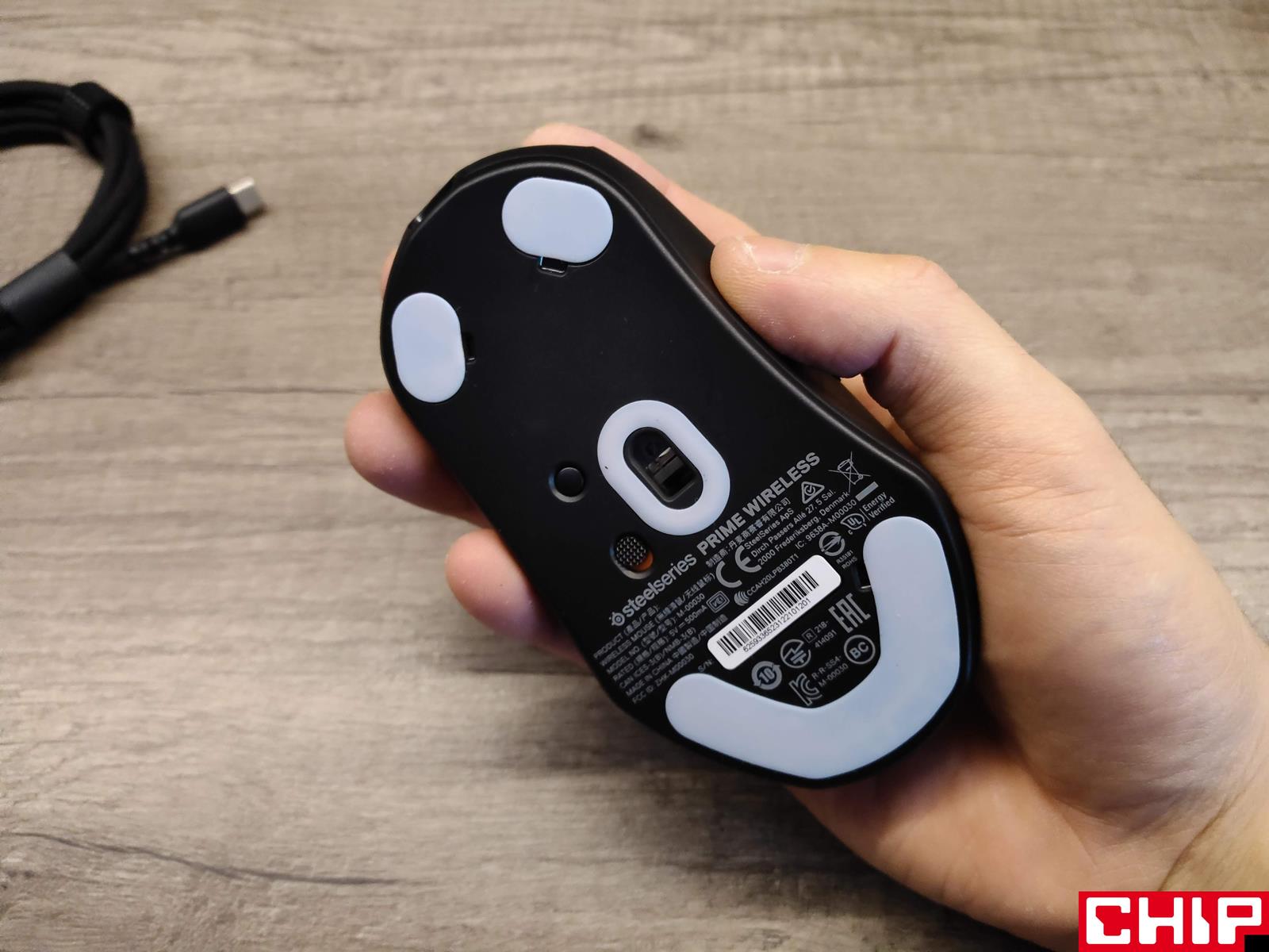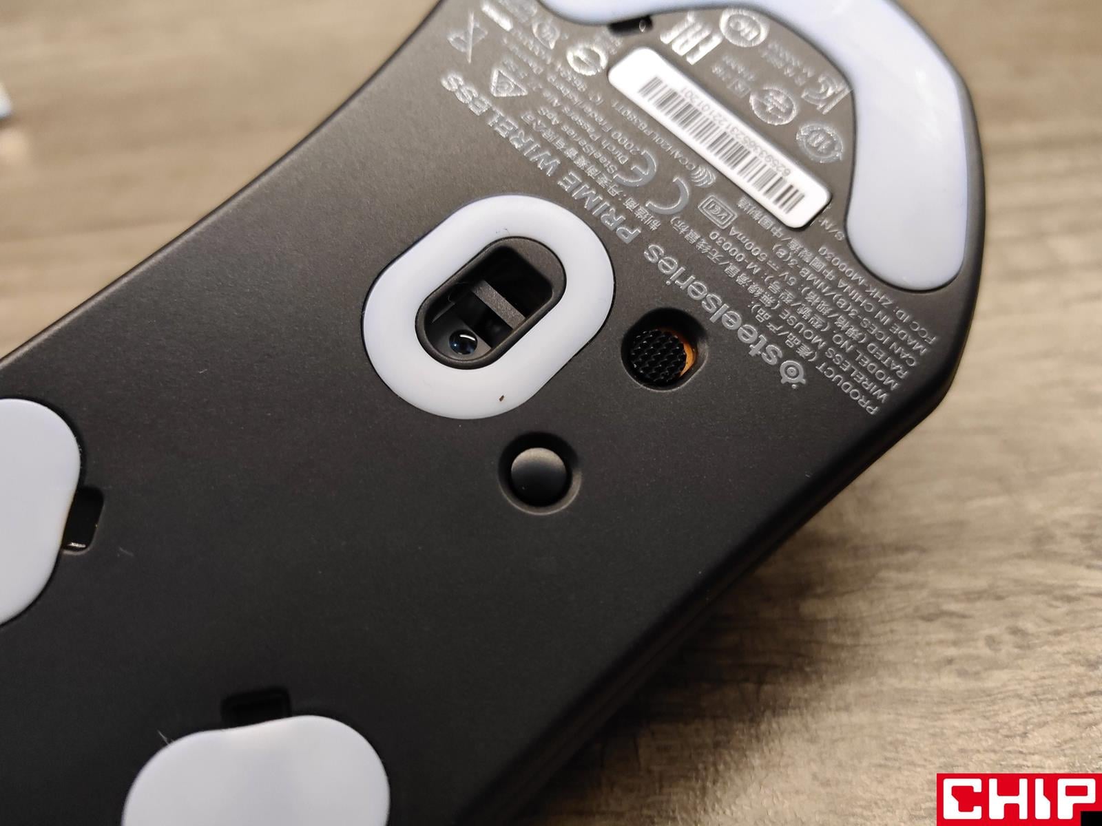 To, co w Prime Wireless uwielbiam, to główny korpus obudowy, który dzięki praktycznie niewidocznym spoinom, dopiero po bliższych oględzinach zdradza, że budują go łącznie trzy elementy. Skrzydełka głównych przycisków oddzielono od całości, a z samej obudowy wychodzą tylko ładnie osadzone przyciski boczne i port USB-C na samym przodzie. Na dole z kolei znajdziemy cztery świetnej jakości teflonowe ślizgacze z przyciskiem do zmiany czułości i odświeżania oraz prosty przełącznik on/off.