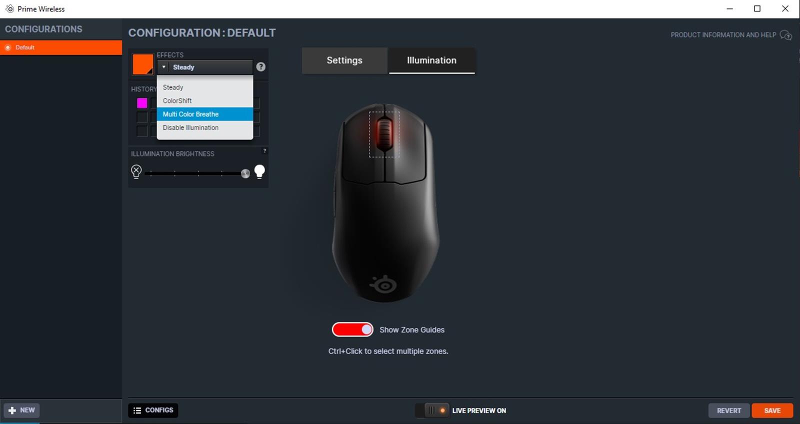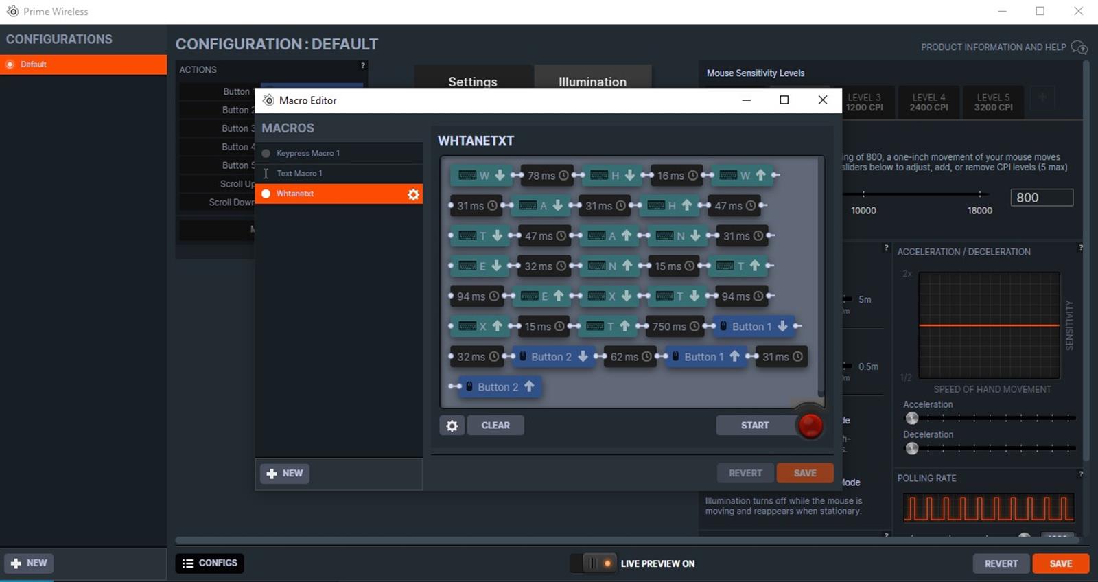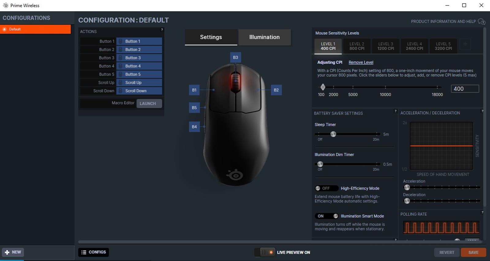 W drugim, czyli już w ustawieniach dedykowanych myszce, znajdziemy możliwość nadpisania funkcji każdego przycisku, nagrania makra zarówno pod kątem aktywności myszki, jak i klawiatury, czy skromnej zabawy z podświetleniem. Po stronie sensora SteelSeries pozwala nam nie tylko na ustawienie czułości na pięciu poziomach (100-18000 DPI), czy częstotliwości odświeżania myszy (125, 250, 500 i 1000 Hz), ale też natężenia predykcji oraz zwiększenia i zmniejszenia prędkości w kolejno pierwszych i ostatnich fazach ruchu myszką.