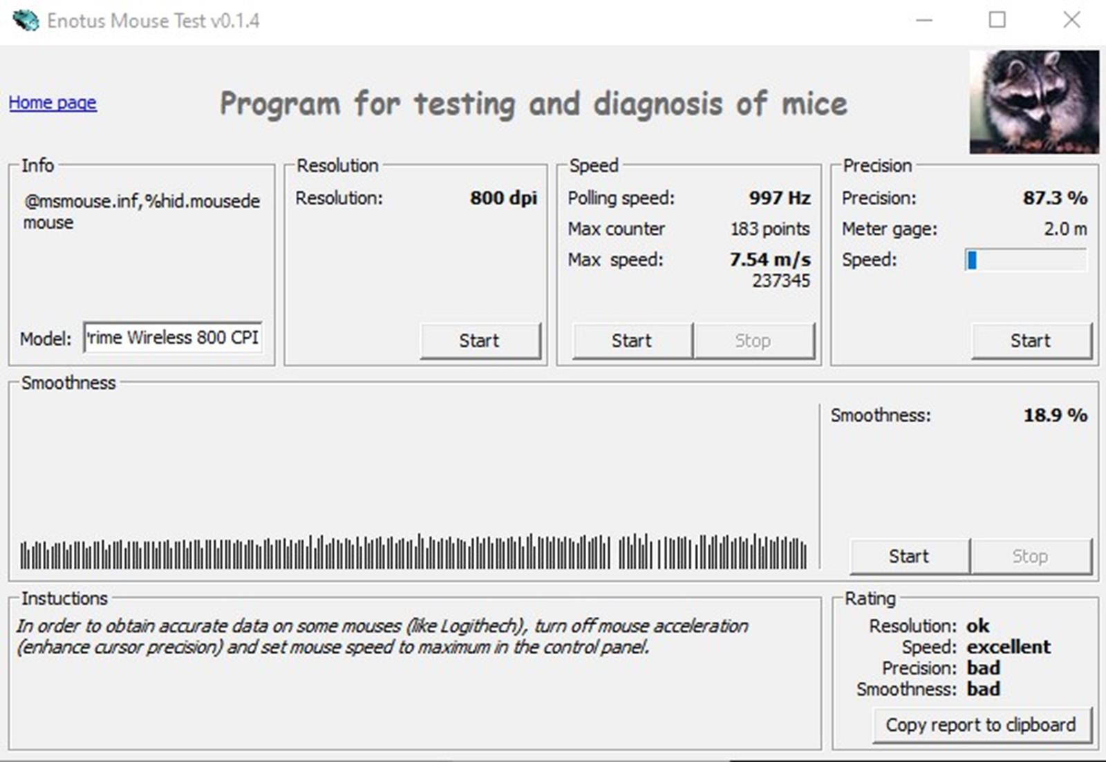 Testy TrueMove Air w Prime Wireless zostały przeprowadzone w trybie 2,4 GHz Quantum 2.0 Wireless za pośrednictwem dołączonego odbiornika USB-C wpiętego bezpośrednio do płyty głównej, która znajduje się kilkanaście centymetrów od podkładki materiałowej o gładkim, dynamicznym splocie. Wyniki prezentują się następująco: