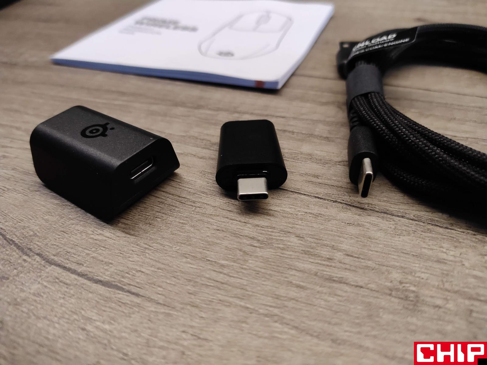 Mowa o 208-centymetrowym przewodzie USB-C do USB-A, odbiorniku USB-C działającym na paśmie 2,4 GHz oraz kostce rozszerzającej zasięg, która sprowadza się do dwóch portów USB-C. Do jednego musimy więc wpiąć sam odbiornik, a do drugiego przewód, jeśli nie posiadamy w swoim komputerze wolnego portu USB-C.