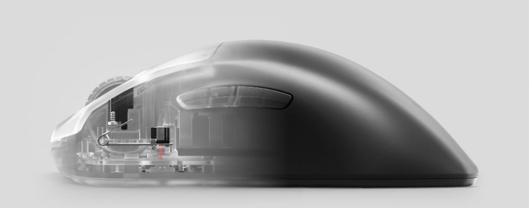 Steelseries chwali się zastosowaniem mechaniczno-optycznych przełączników Prestige OM pod głównymi przyciskami, co wyjaśnia ocenę wytrzymałości do 100 mln aktywacji. Tego typu rozwiązanie jest bowiem nie tylko szybsze, ale w ogólnym rozrachunku też zwyczajnie lepsze, jako że porzuca metalowe styki na rzecz przerywania wiązki światła, co wpływa na responsywność. O nią producent zadbał na dwóch frontach, bo postawił nie tylko na swoje wyjątkowe przełączniki, ale też oddzielenie przycisków od głównego korpusu.