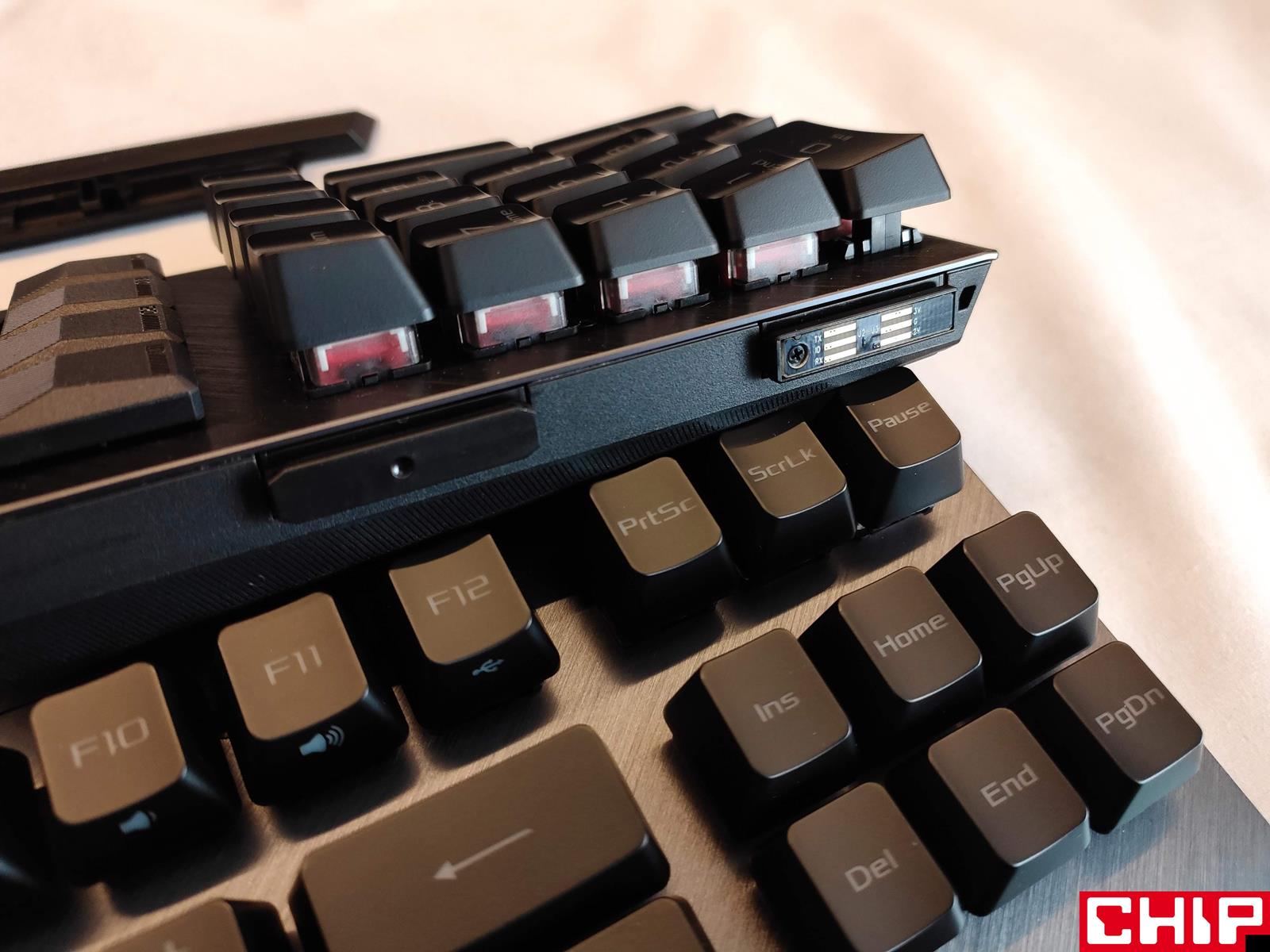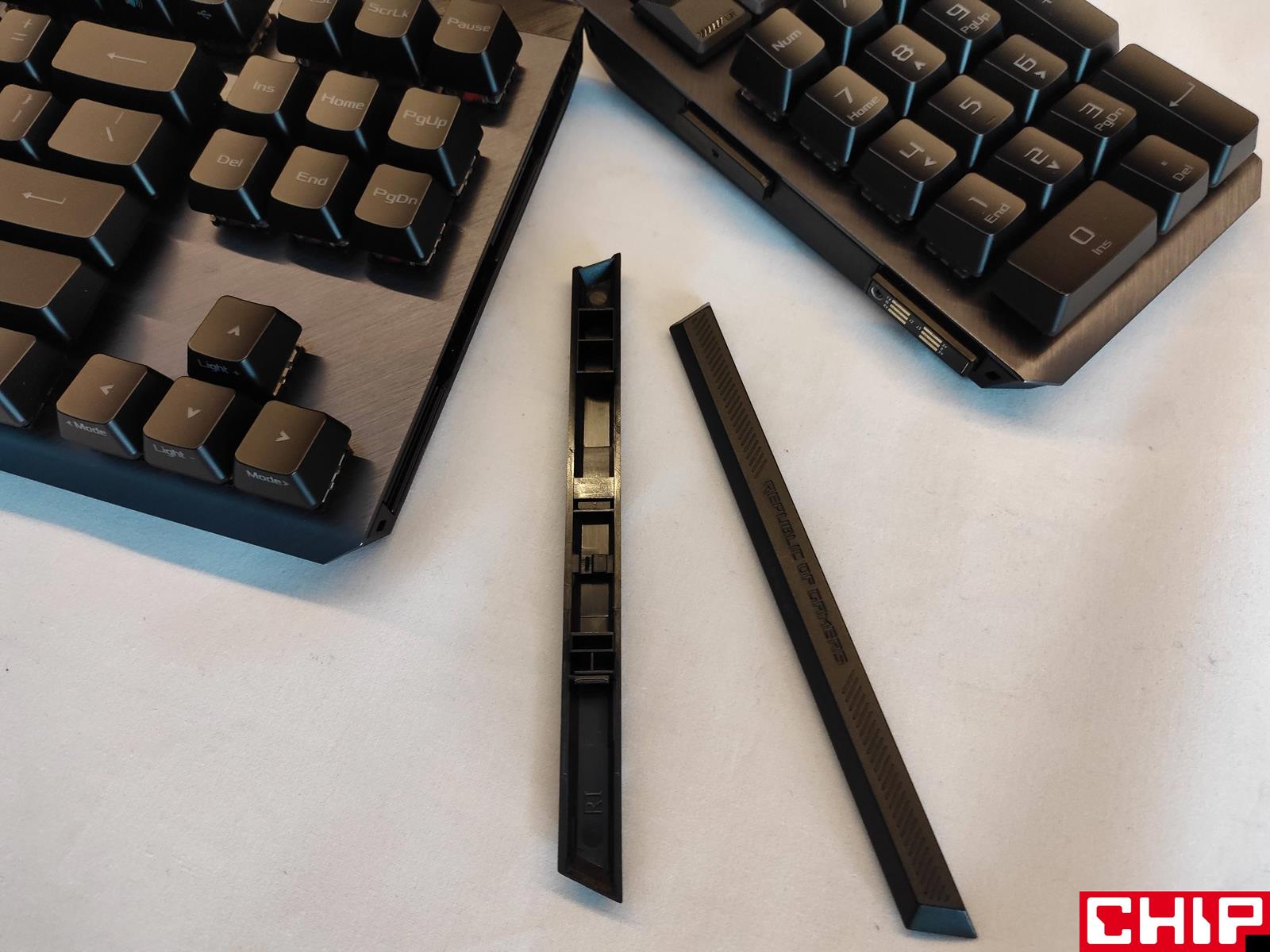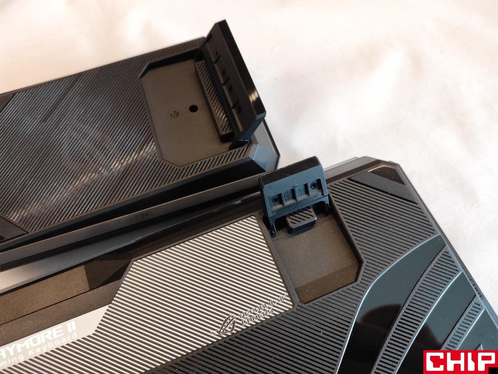 Swoiste centrum dowodzenia znalazło się w ROG Claymore II na górnym boku, gdzie znajdziemy magnetyczną lukę na odbiornik USB-A, port USB-C do pracy przewodowej, prosty przełącznik on/off i port USB-A typu pass-through. To, co w tym modelu jest najważniejsze, a przynajmniej najbardziej nowatorskie, sprowadza się do obu boków klawiatury. Tam pod niestety lichymi osłonkami, które za bardzo się kiwają na boki, znajduje się prosty mechanizm blokujący i styki, których odpowiedniki znajdziemy na dołączonym do zestawu odpinanego bloku numerycznego.