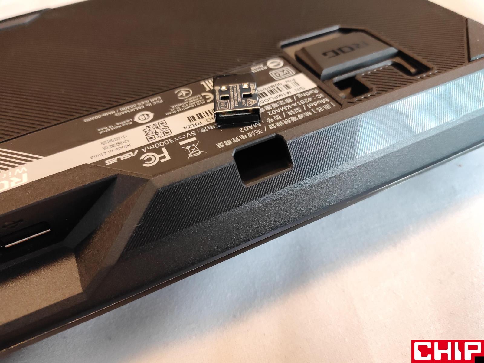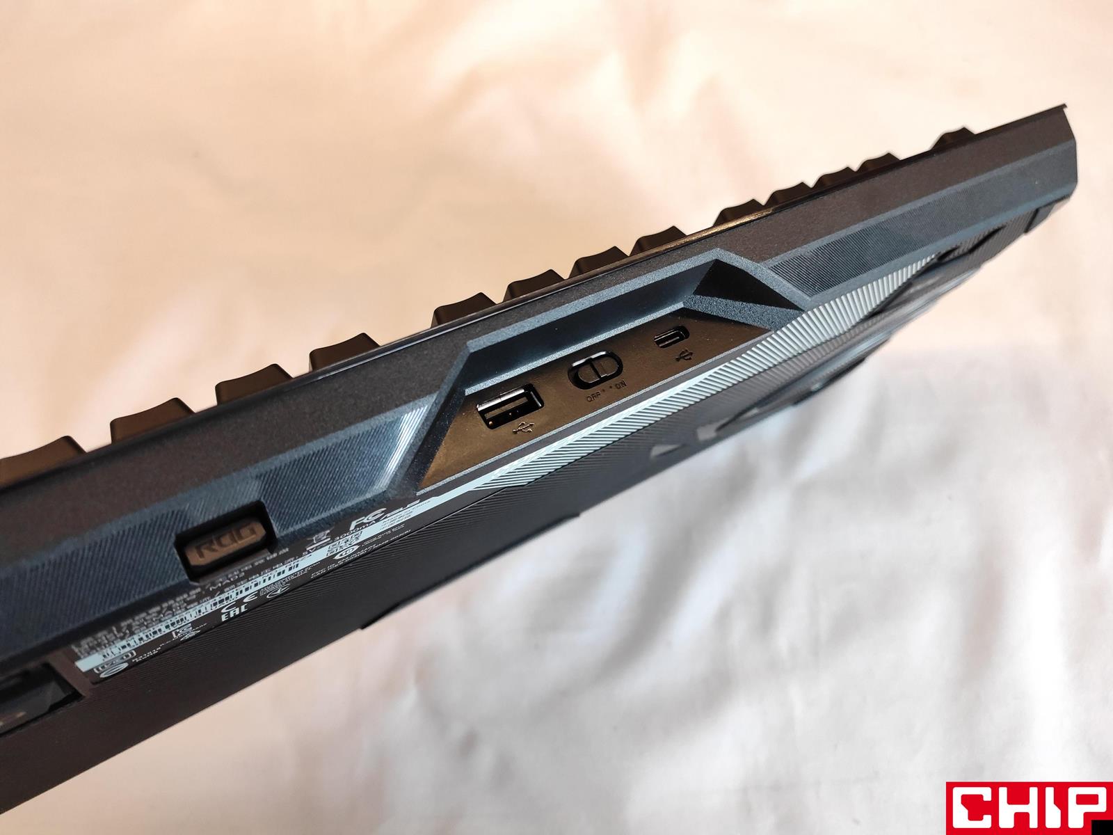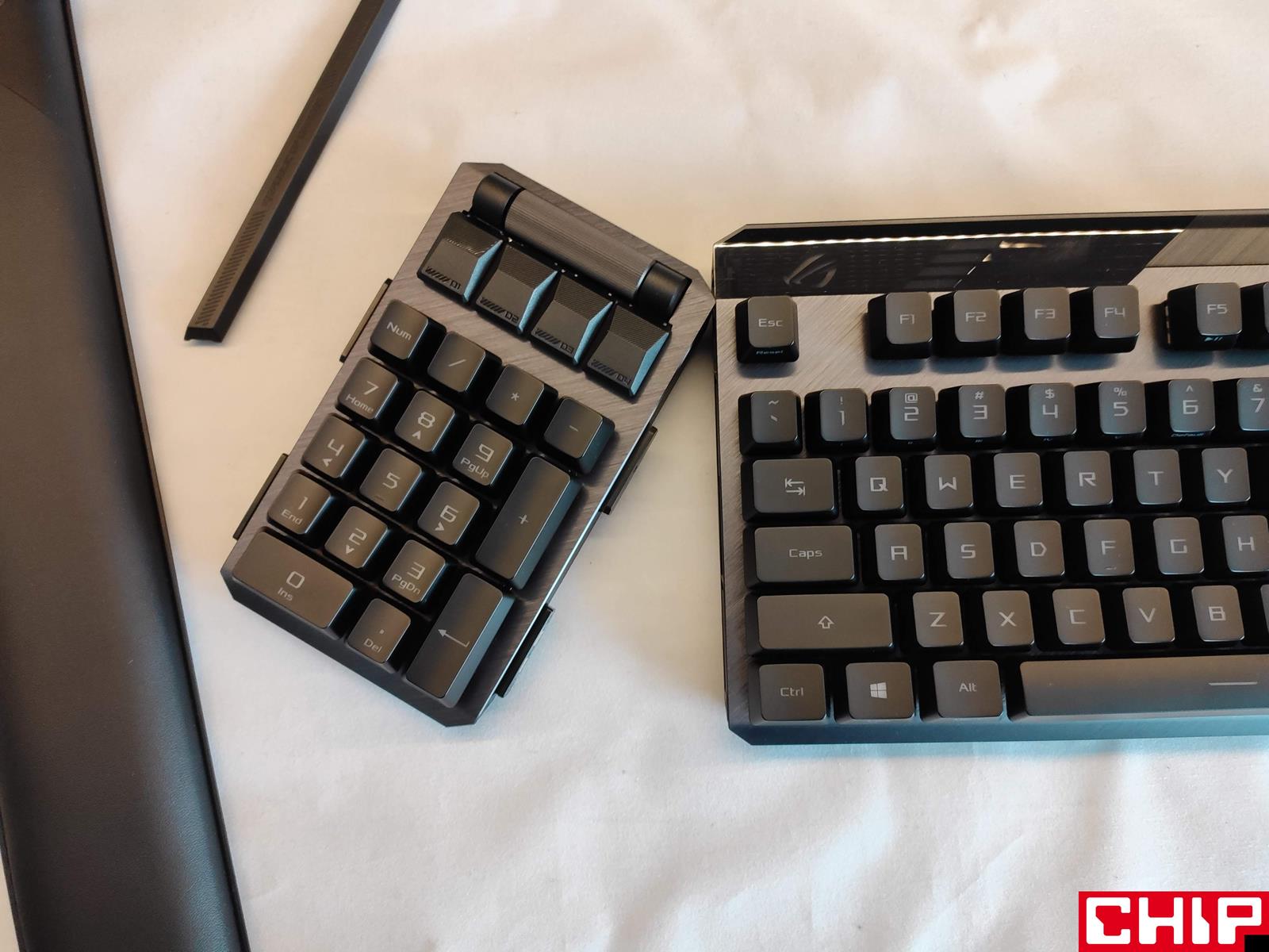 Swoiste centrum dowodzenia znalazło się w ROG Claymore II na górnym boku, gdzie znajdziemy magnetyczną lukę na odbiornik USB-A, port USB-C do pracy przewodowej, prosty przełącznik on/off i port USB-A typu pass-through. To, co w tym modelu jest najważniejsze, a przynajmniej najbardziej nowatorskie, sprowadza się do obu boków klawiatury. Tam pod niestety lichymi osłonkami, które za bardzo się kiwają na boki, znajduje się prosty mechanizm blokujący i styki, których odpowiedniki znajdziemy na dołączonym do zestawu odpinanego bloku numerycznego.
