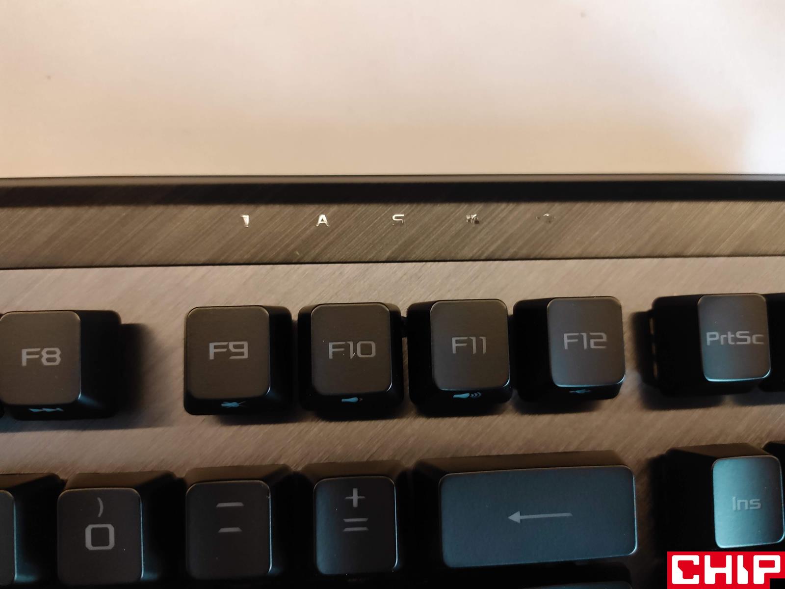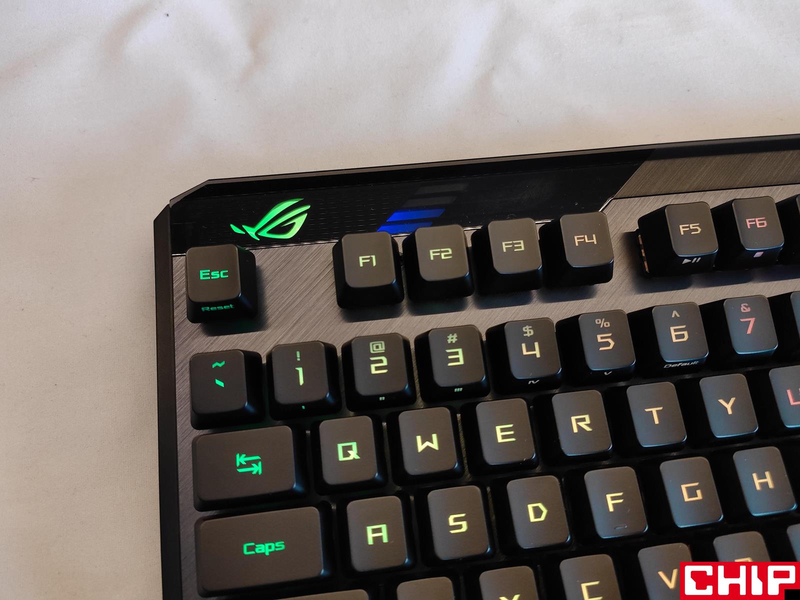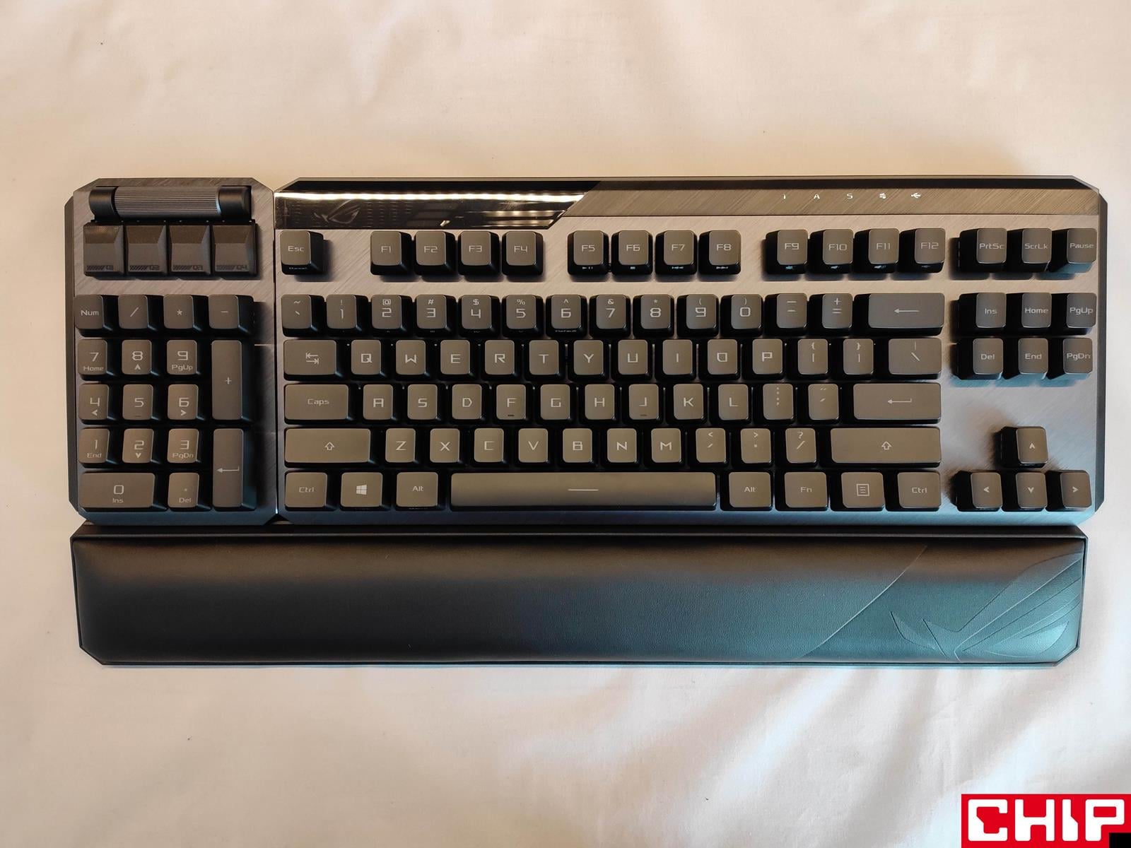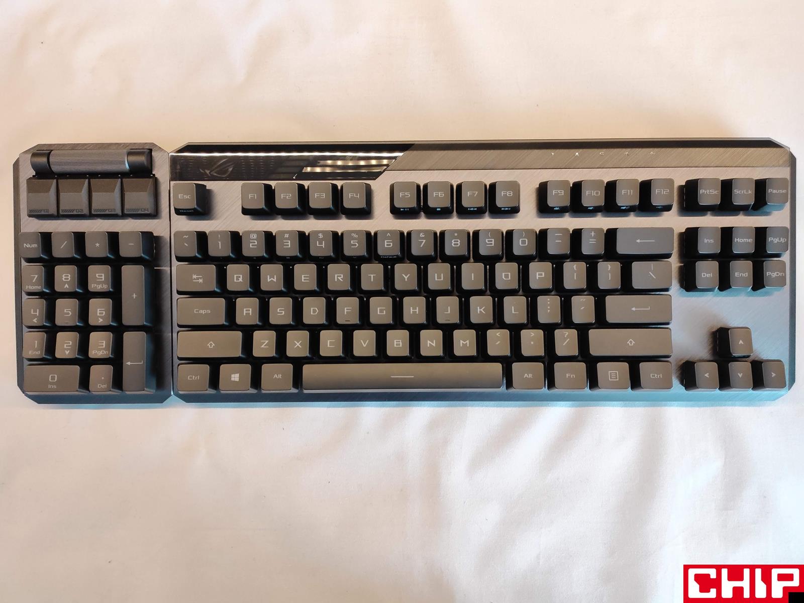 Trudno nie przyznać, że jak na gamingowy sprzęt, ROG Claymore II prezentuje się świetnie za sprawą szlifowanego ciemnego aluminium na górnej części, które uzupełnia przyciemniona wstawka z plastiku jakieś dwa centymetry na samej górze. Ta skrywa pod sobą nie tylko proste diody informacyjne na temat aktywności caps-locka, czy blokady przycisku Windows, ale też w lewym górnym rogu podświetlane logo ASUSa i czteropoziomowy stan wbudowanego 4000-mAh akumulatorka.